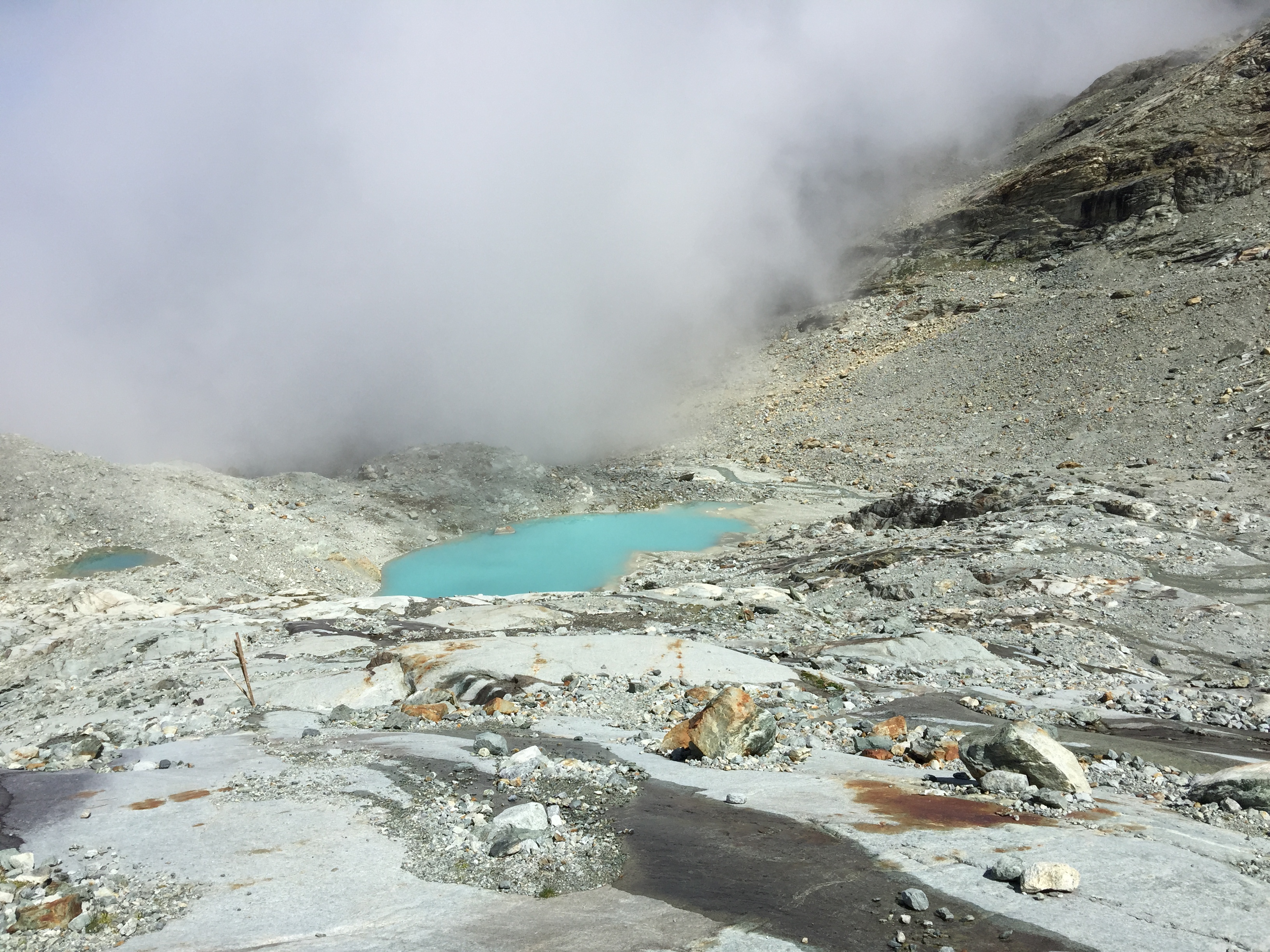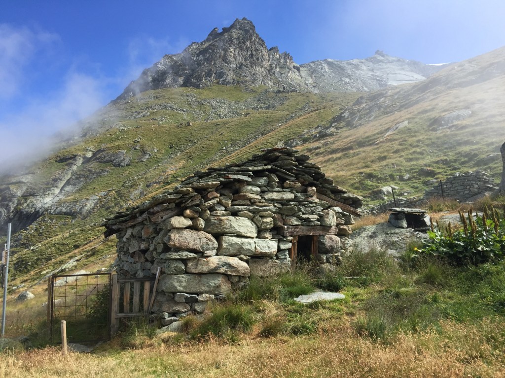 On se gare à Ferpècle et on entame la longue montée pour la Cabane de la Dent Blanche. Il ne fait pas grand beau et la température est idéale pour avancer. On n’est pas pressés, on fait deux belles pauses, à Bricola et sur les dalles après avoir traversé le torrent.
