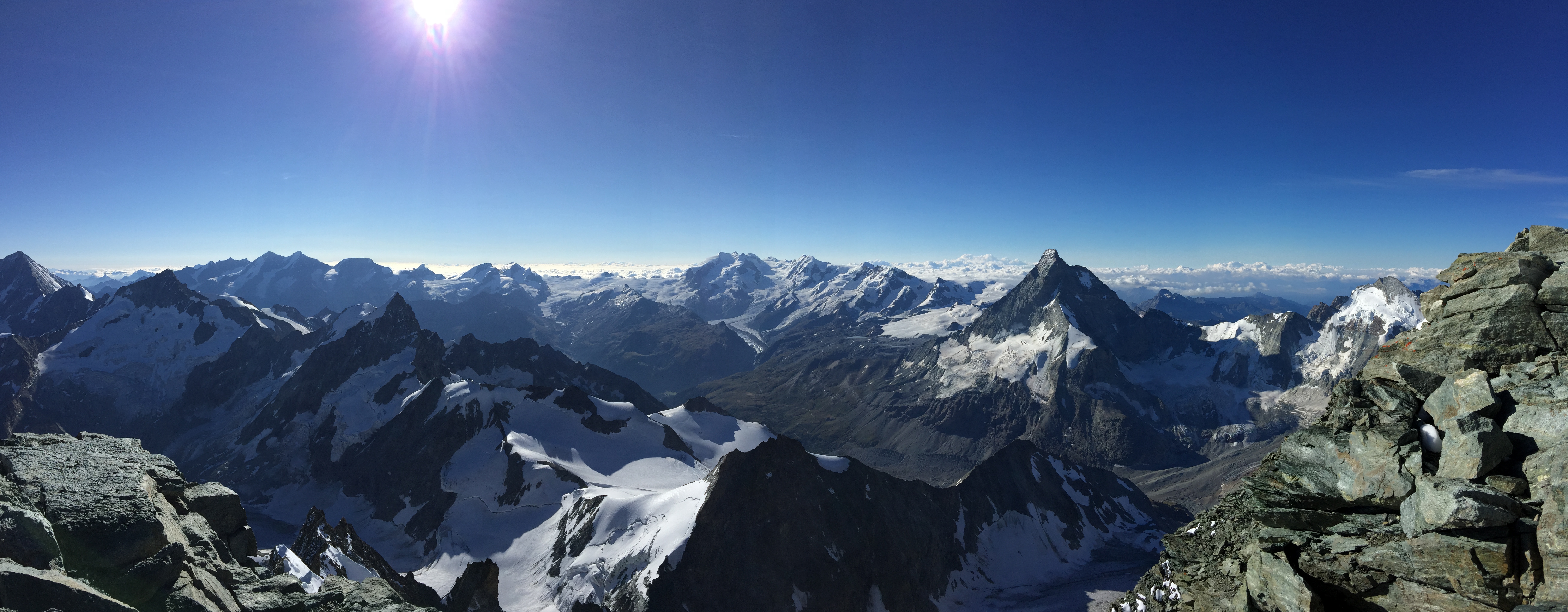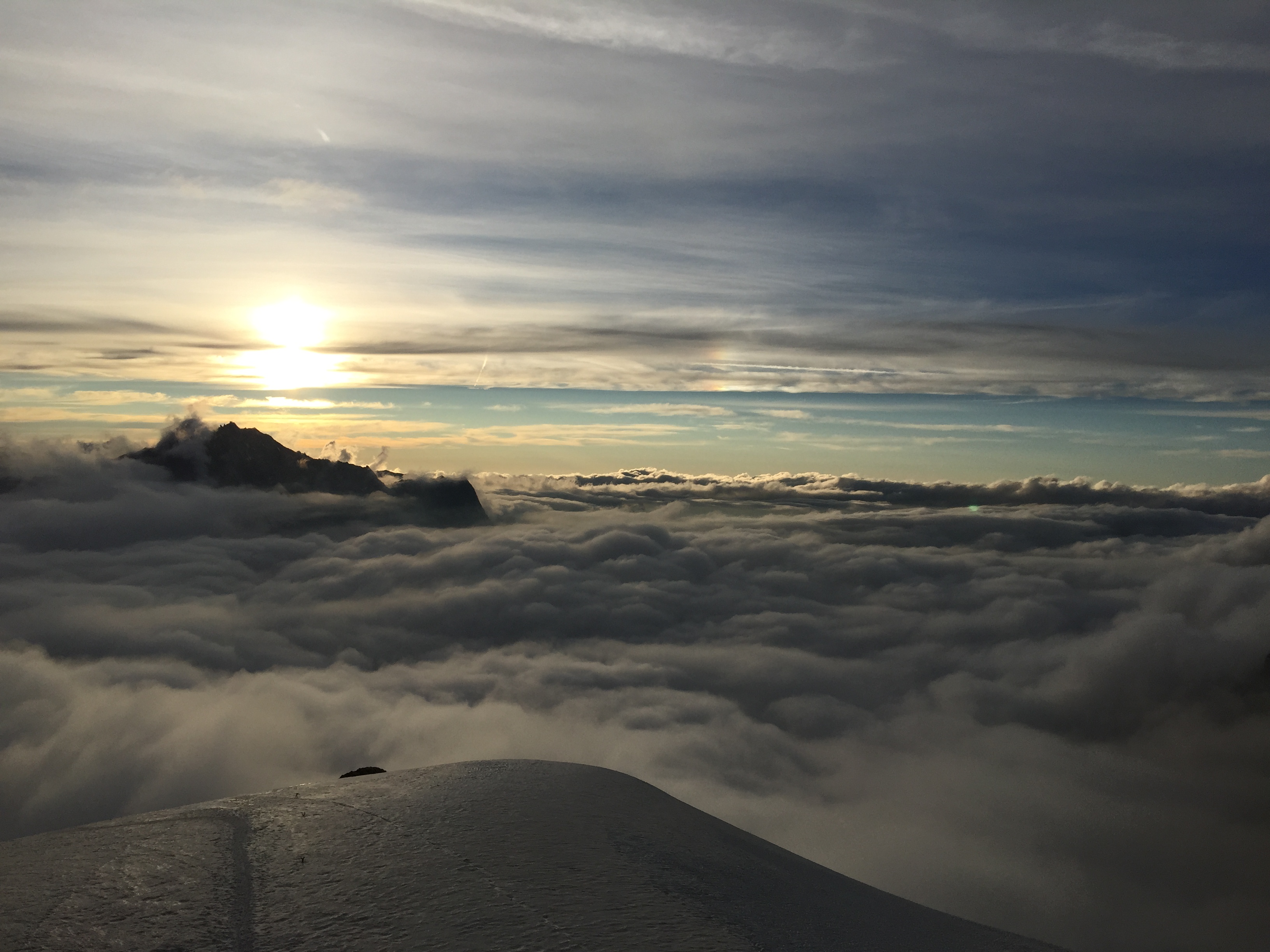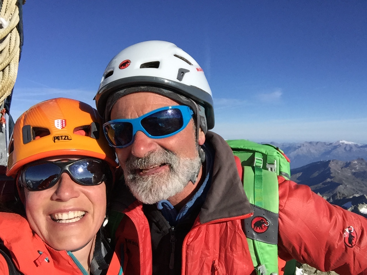 Nous arrivons au sommet à 08.00, j’ai de la peine à y croire ! J’ai tellement rêvé de ce moment là ! En plus, cerise sur le gâteau, nous sommes seuls au sommet ! Gérald se paie le luxe d’un petit somme et je fais tout mon possible pour ne pas le réveiller afin de prolonger le temps passé là haut. Je n’ai tellement pas envie de redescendre 🙂