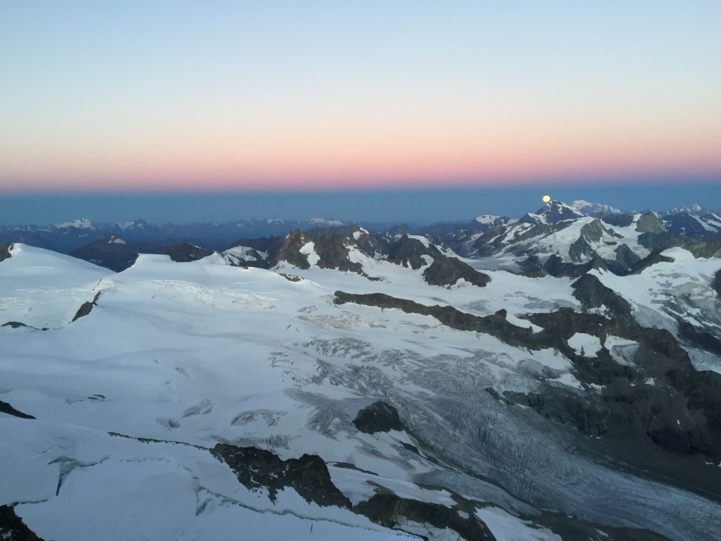 Le levé du jour et le coucher de pleine lune sur le Mont Blanc sont magiques. Nous avançons à un rythme qui me convient parfaitement, sans stress mais sans trainer non plus. L’escalade est ludique et plaisante, quel bonheur de grimper sans se mettre au taquet !