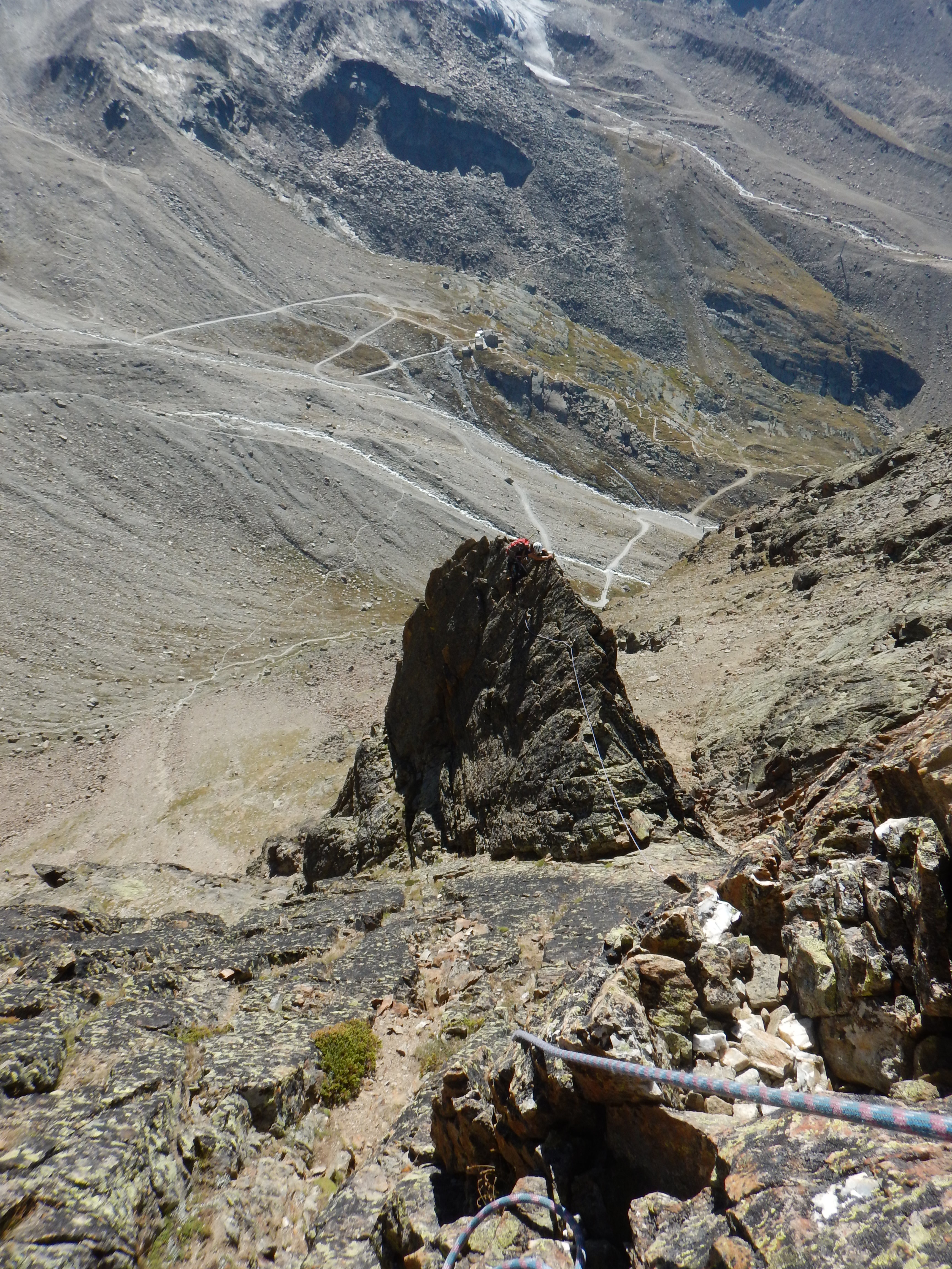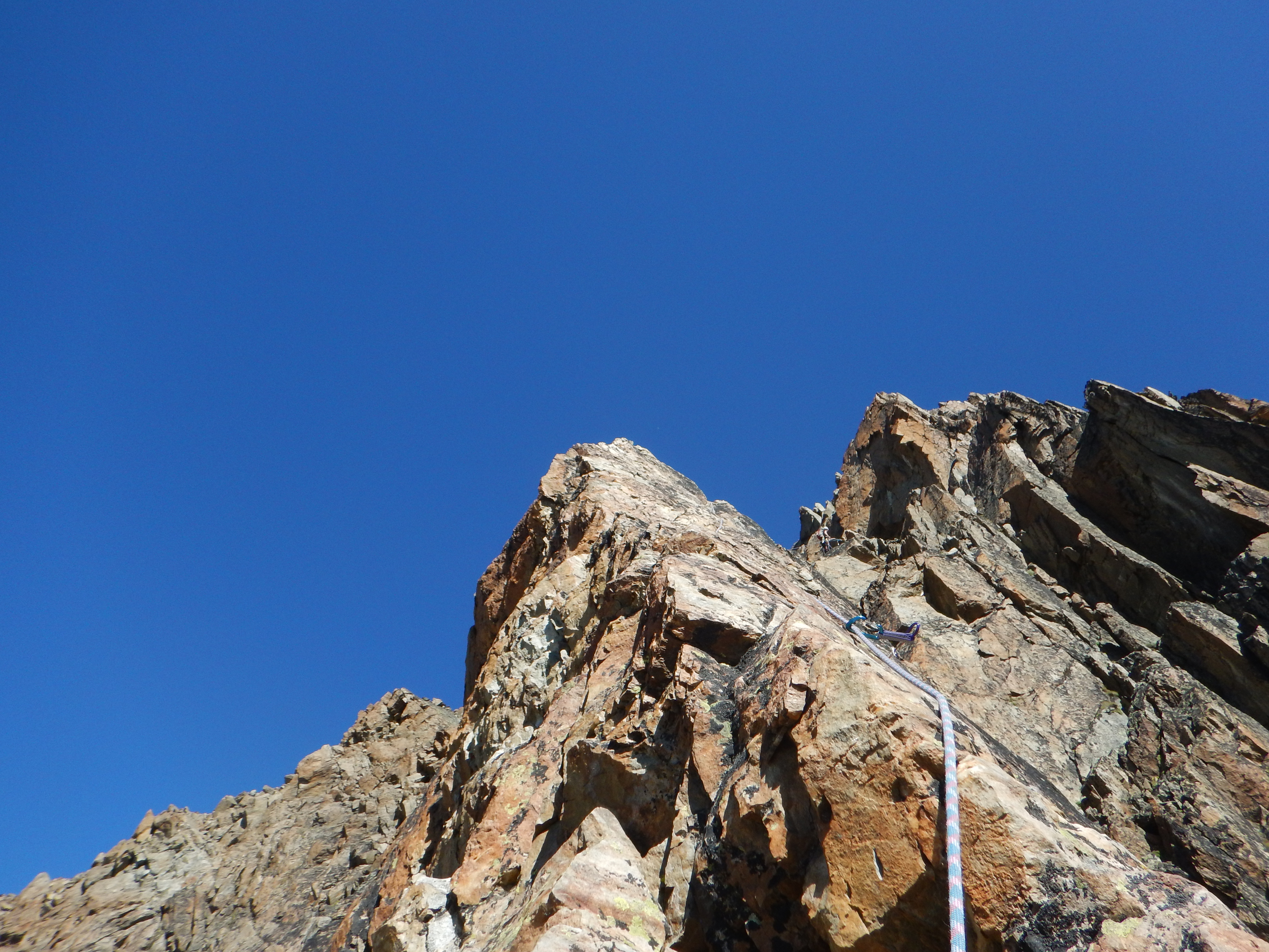 Viviane attaque la voie en grosses et sur coinceurs, histoires de rehausser la difficulté… Elle est incroyable cette nana ! La longueur la plus difficile est celle du gendarme rouge, mais cela reste abordable, en tous cas en second. Après l’arête est facile et très bien équipée.