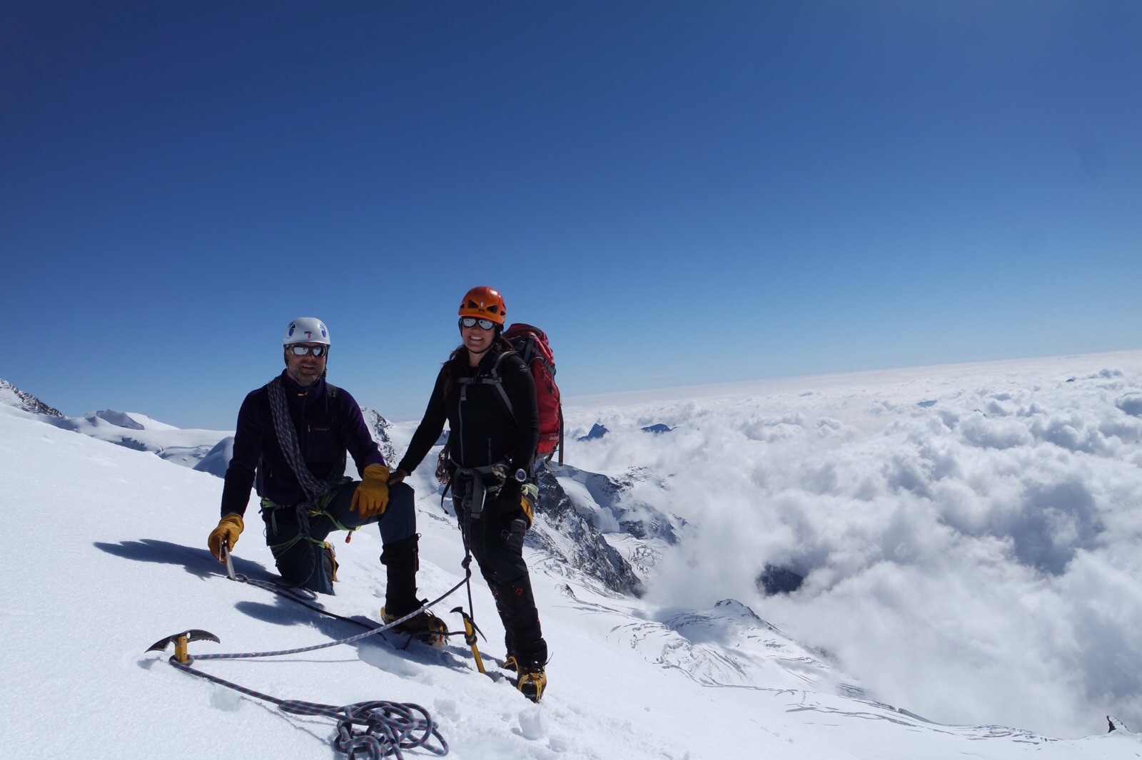 Seuls au sommet comme sur tout l’itinéraire, longue pause photo et contemplation de tous les sommets environnants. On shunte le Breithorn W où nous sommes déjà allés et où nous aurons sans doutes moultes fois l’occasion de retourner.