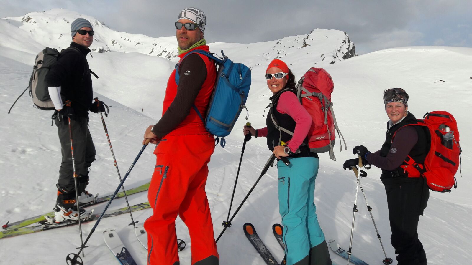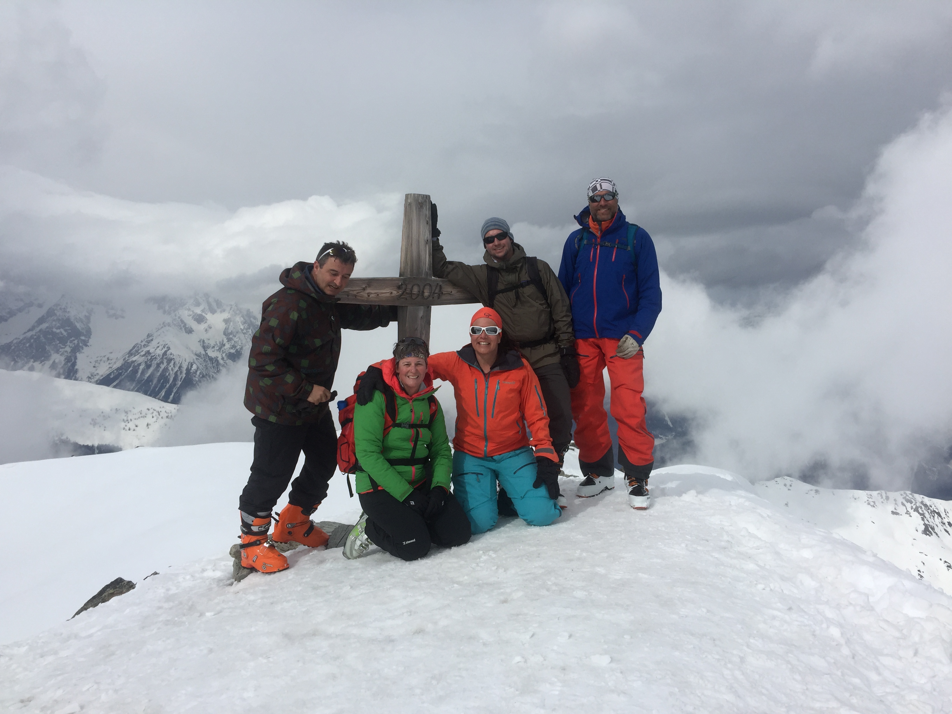 Nous partons à la lumière du jour à 07.00. Antoine, le fils du gardien, nous conseille de mettre les couteaux dès le départ pour être tranquille. Il est vrai que la neige est bien gelée dès les premières pentes. La tempête de foehn annoncée n’est pas (encore) là et nous montons tranquillement mais surement, en essayant au mieux de rester groupé. Tous le monde arrive au sommet, le vent se lève et après la photo d’usage, nous ne traînons pas.