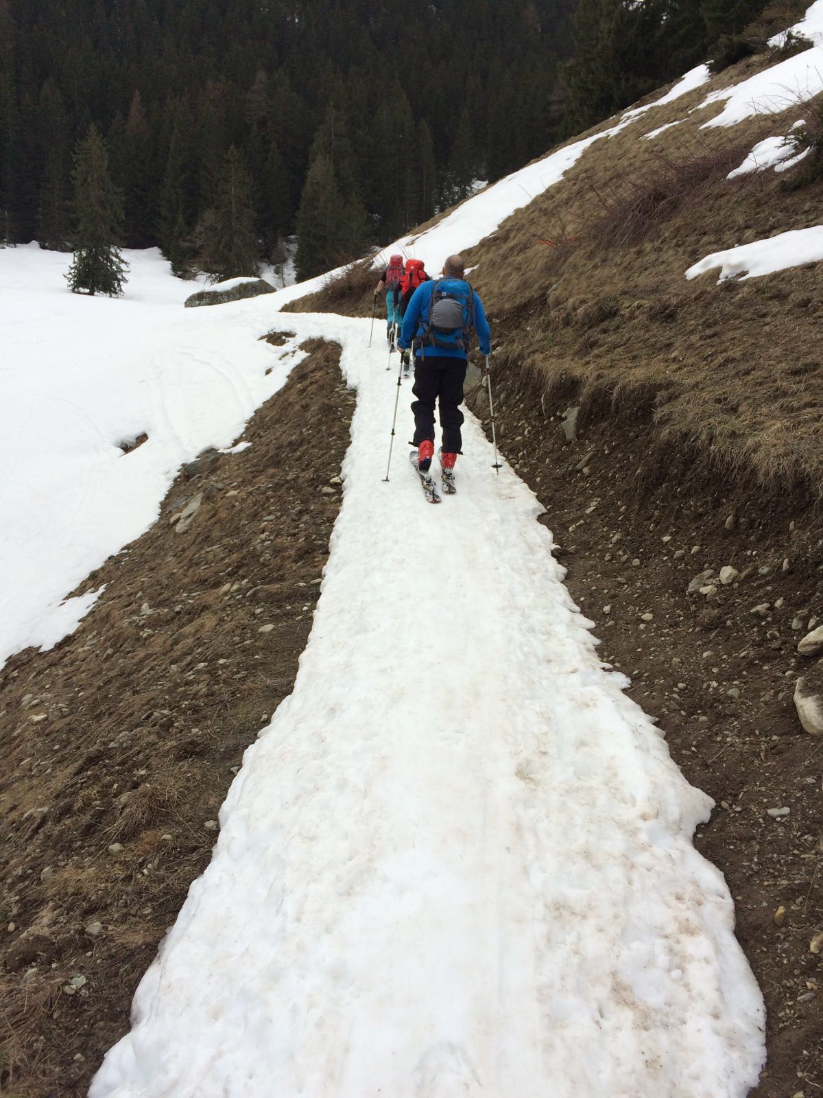 La descente est bonne sur le haut mais devient vite vraiment casse-pieds après la cabane. La neige est détrempée et collante, il faut pousser presque tout du long.