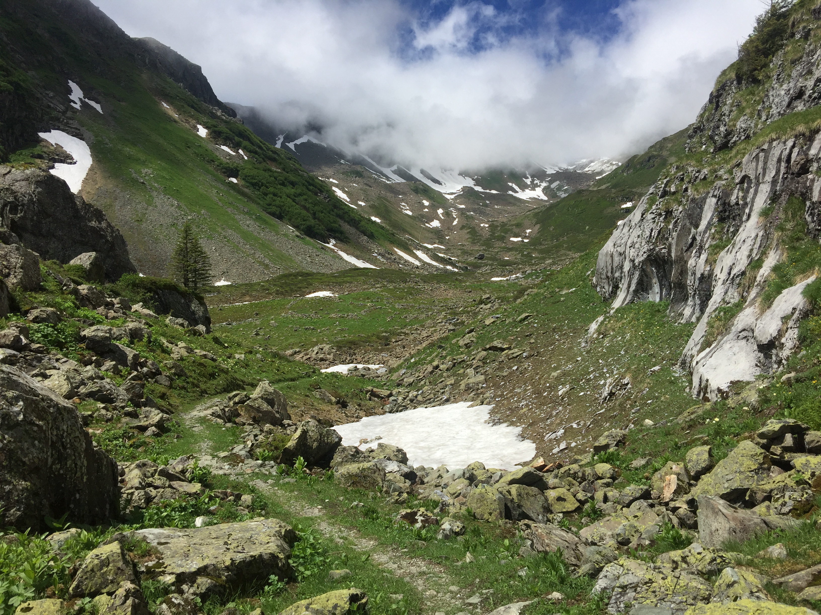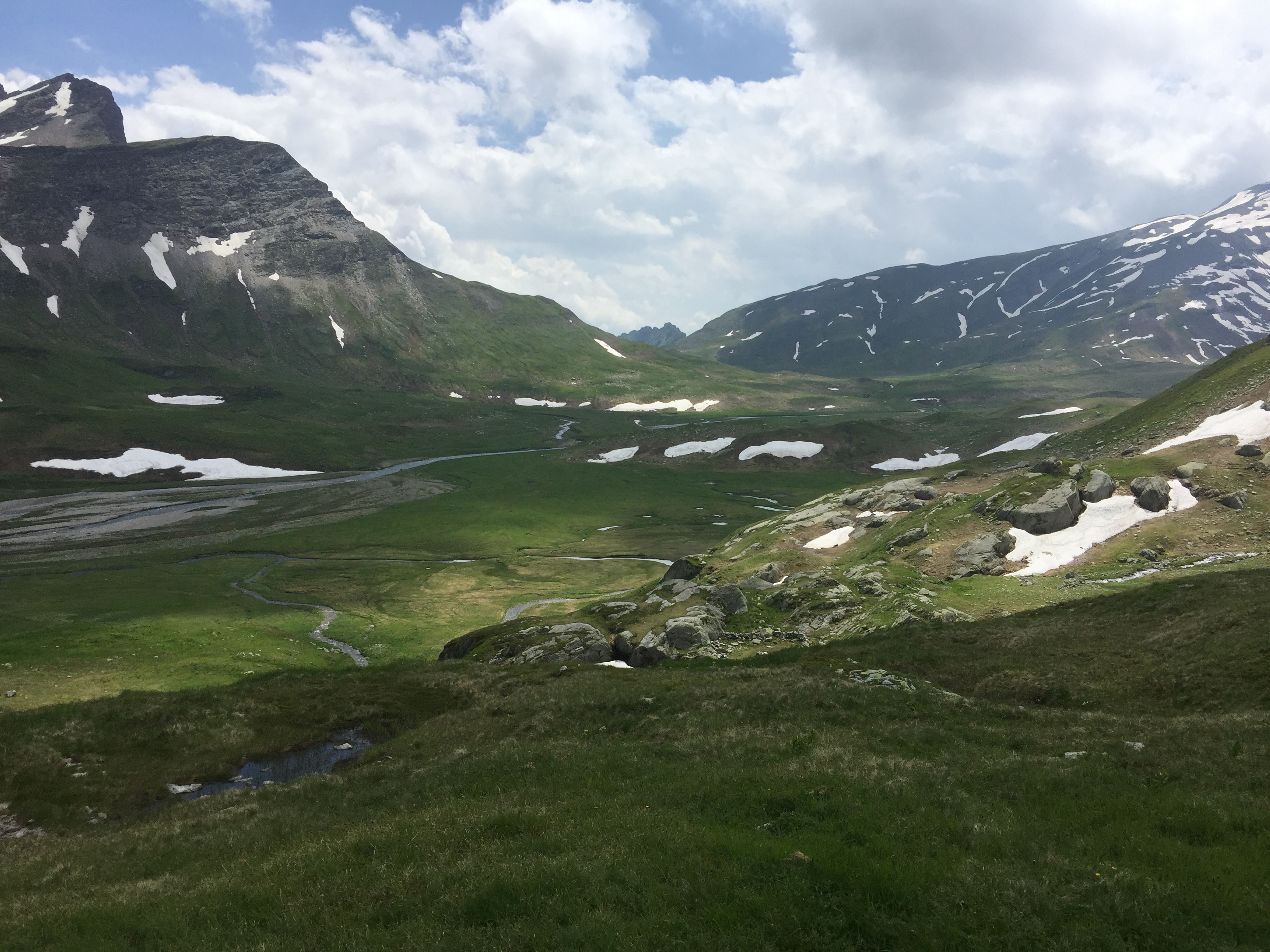 Je bascule de l’autre côté, sur un chemin en balcon d’abord, puis à travers des alpages verdoyants. Quelle matinée magnifique ! En me connectant sur les réseaux sociaux je vois que ce n’est pas tout à fait le cas en Valais, il y a 10 cm de neige sur la terrasse de la cabane de la Tourche ! C’est difficile à croire depuis ici !