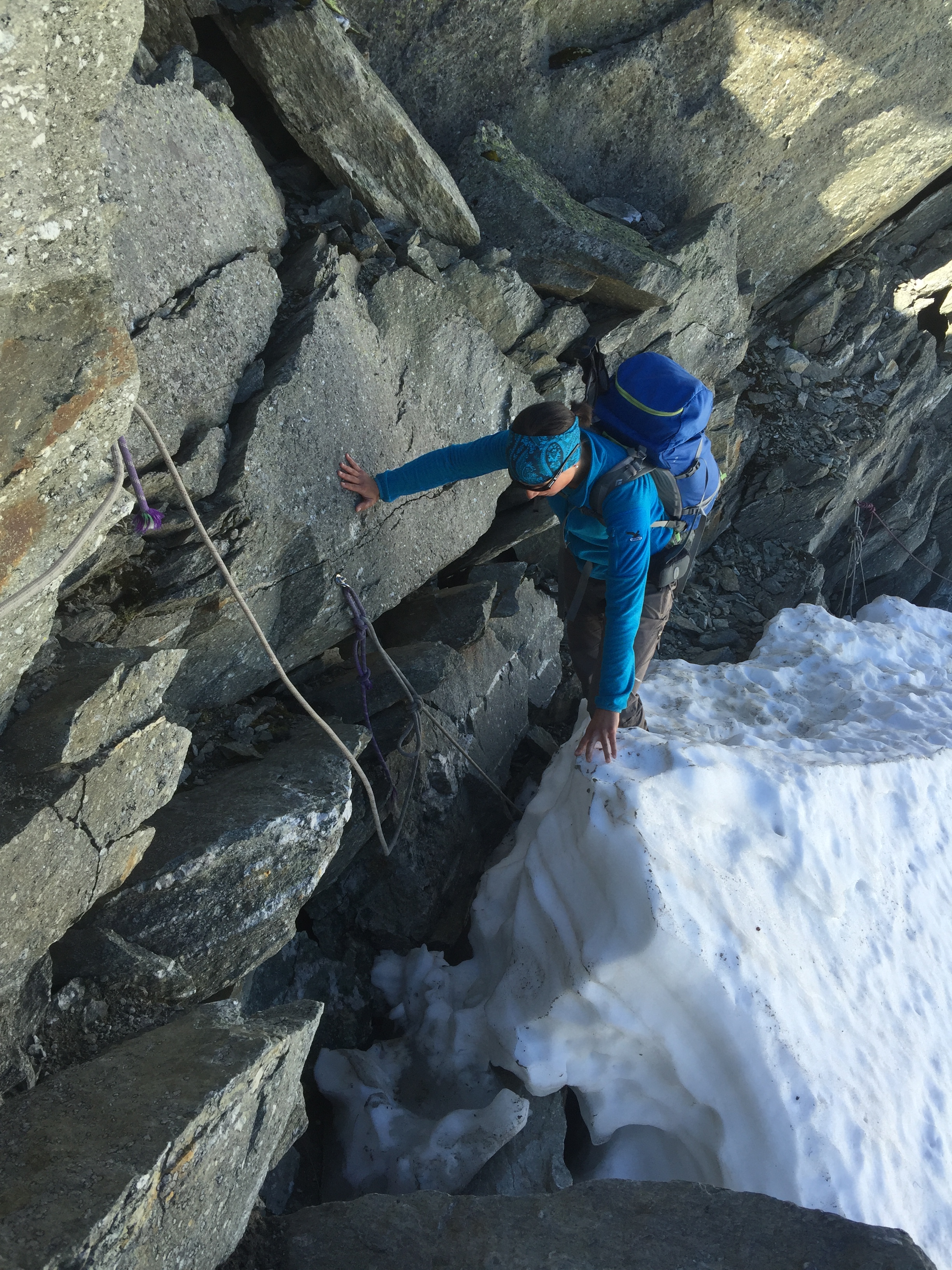 Alors que j’arrive au petit rec final, je fais une pause. Il me reste 500m de dénivellé, si je me dépêche je devrai être à la cabane dans 1h. C’était sans compter sur mes copains les névés, ils s’étaient cachés les sales gosses ! Je me suis enfoncée à chaque pas au mois jusqu’au genou, parfois jusqu’à la cuisse. J’ai finalement mis 2h30 pour parcourir ces 500m ! J’étais vraiment contente d’arriver à la cabane. Je suis suivie de peu par Flavia, une sympathique Bernoise qui me remercie pour la trace… y a pas de quoi 🙂