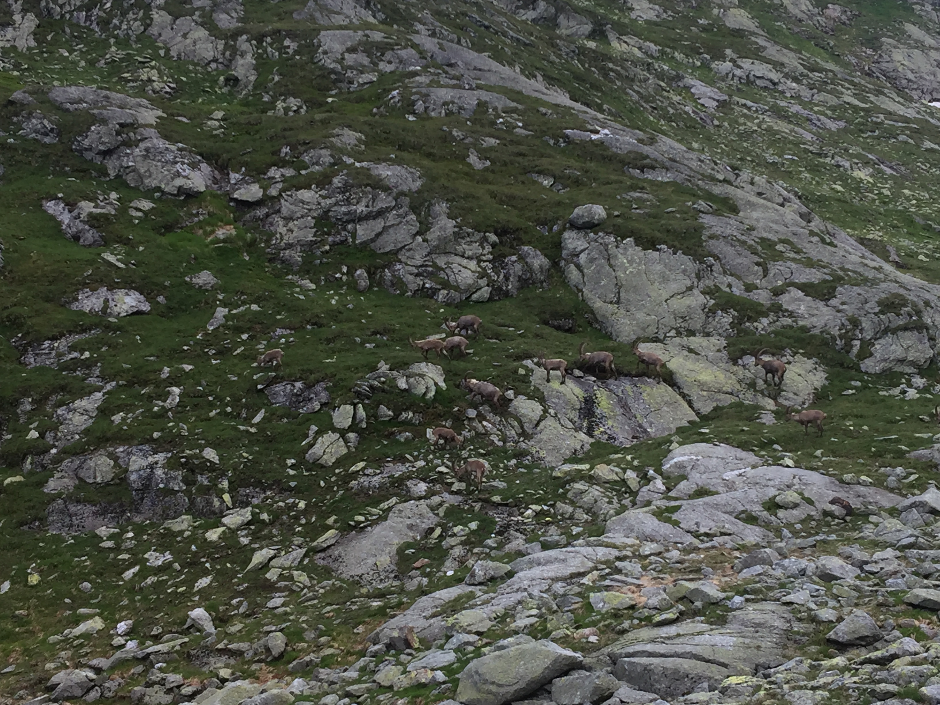 J’en chie vraiment ce matin, c’est la cas de dire… je dois m’arrêter tout les 1/4 d’heure pour vidanger mon intestin. J’essaie de boire régulièrement pour ne pas me déshydrater, la montée est raide et en plein soleil. Finalement j’arrive en début d’après-midi à la cabane Terri et m’offre un grand coca. Ca passe bien, je me sens mieux et repars avec le sourire en direction de l’étonnant plateau de la Greina. J’y croise un troupeau de 12 bouquetins et aucun être à deux pattes ! C’est vraiment sauvage, encore un endroit où il faut absolument que je revienne !
