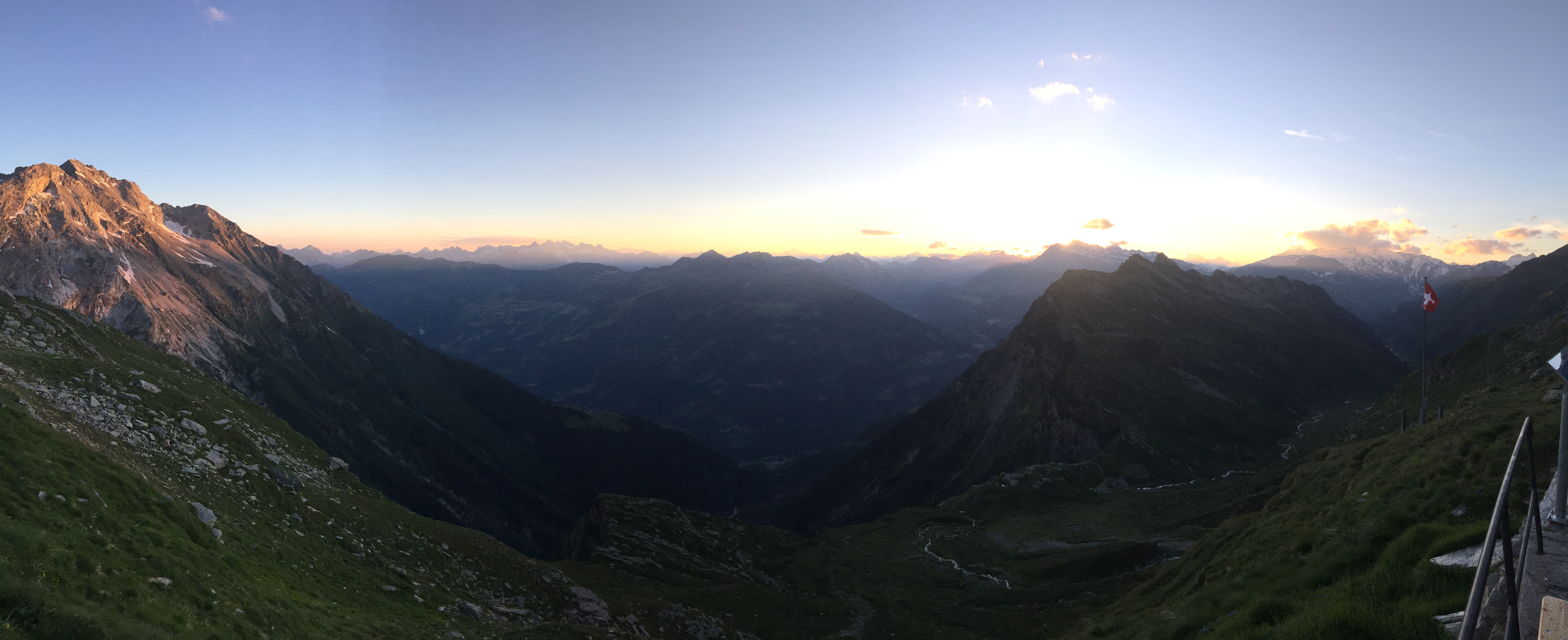 Je m’arrête manger une tarte aux abricots à la cabane Adula CAS avant de monter à la cabane Adula UTOE où je passerai la nuit. Les deux cabanes sont vraiment proches … Je passe une soirée géniale dans cette cabane où nous profitons d’un coucher de soleil magnifique. Simone, l’adorable gardienne, nous sert le dessert sur la terrasse pour que nous n’en perdons pas une miette (du coucher de soleil, pas du dessert !)