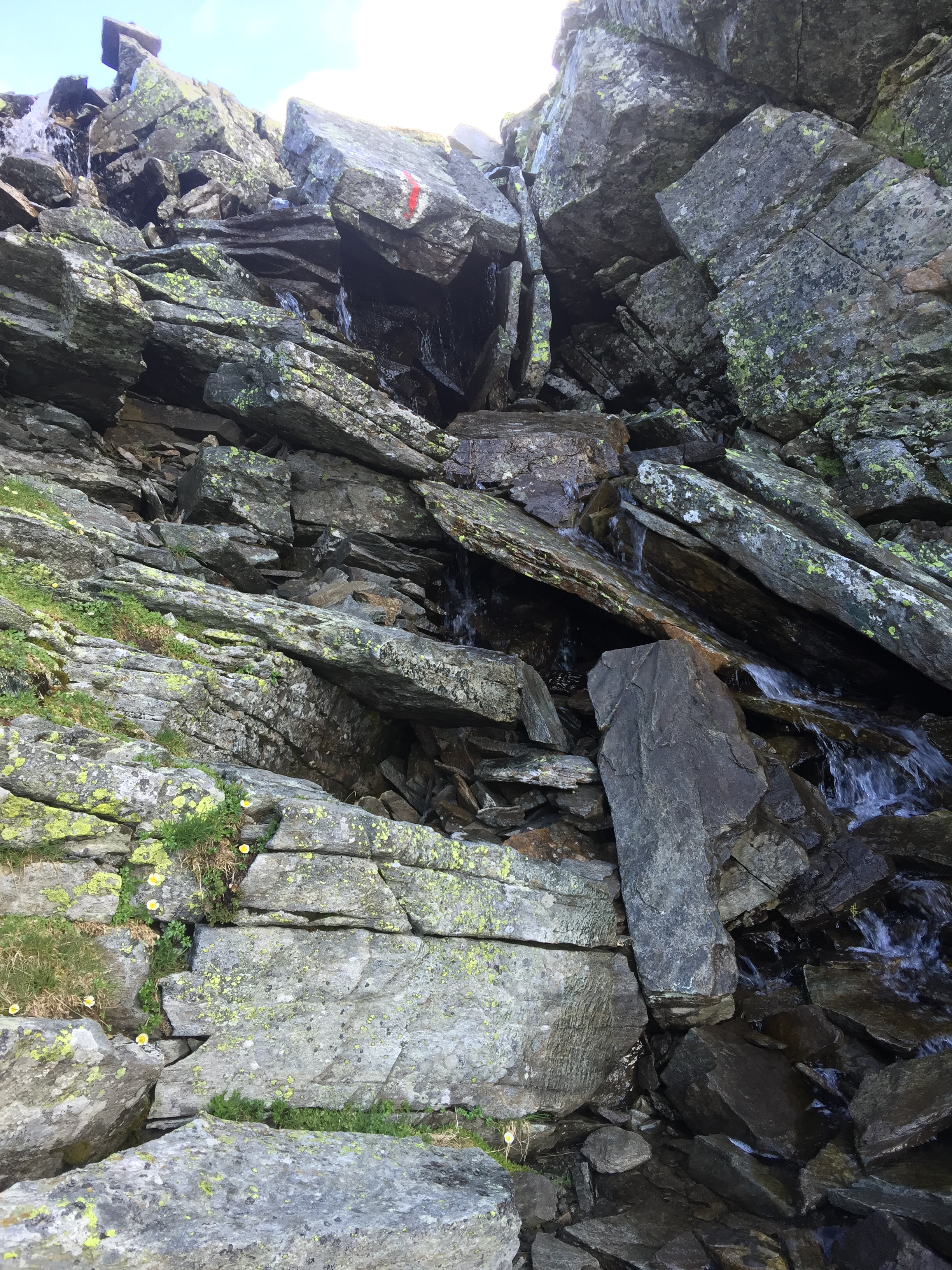 La descente du col est assez marrante, l’itinéraire emprunte tout simplement le lit du torrent. deux-trois marque de peinture et hop, voilà le travail. Pourquoi est-ce qu’on se casserait le dos à faire des chemins de randonnée finalement ? Ca passe nickel.
