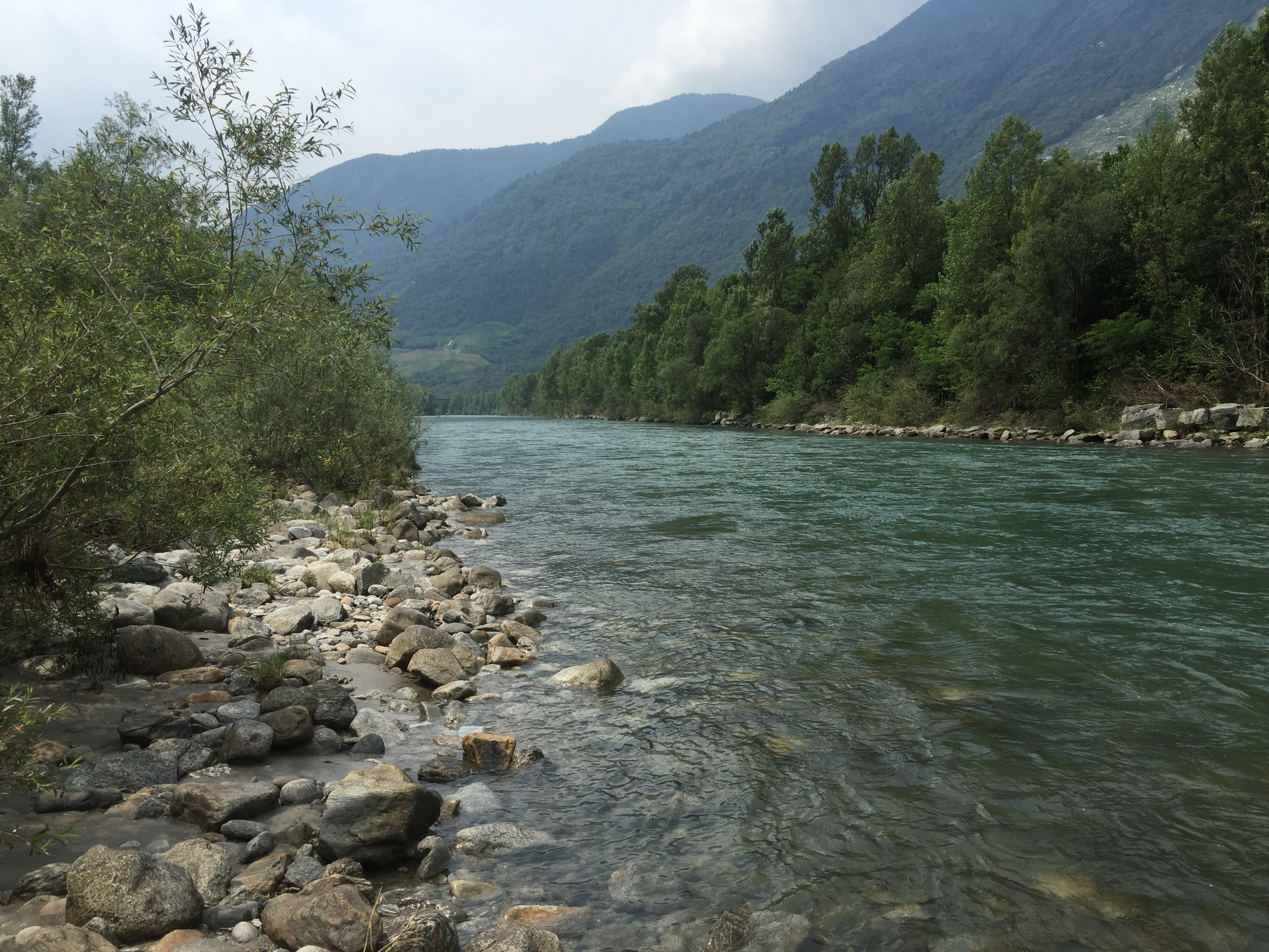 Je quitte Biasca et longe la rivière Ticino jusqu’à Bellinzone. C’est un peu monotone, alors j’agrémente la balade de quelques baignades dans la rivière. Il fait couvert et lourd. J’arrive à Bellinzone sous les premières gouttes de pluie qui ne s’arrêteront que 36 heures plus tard.