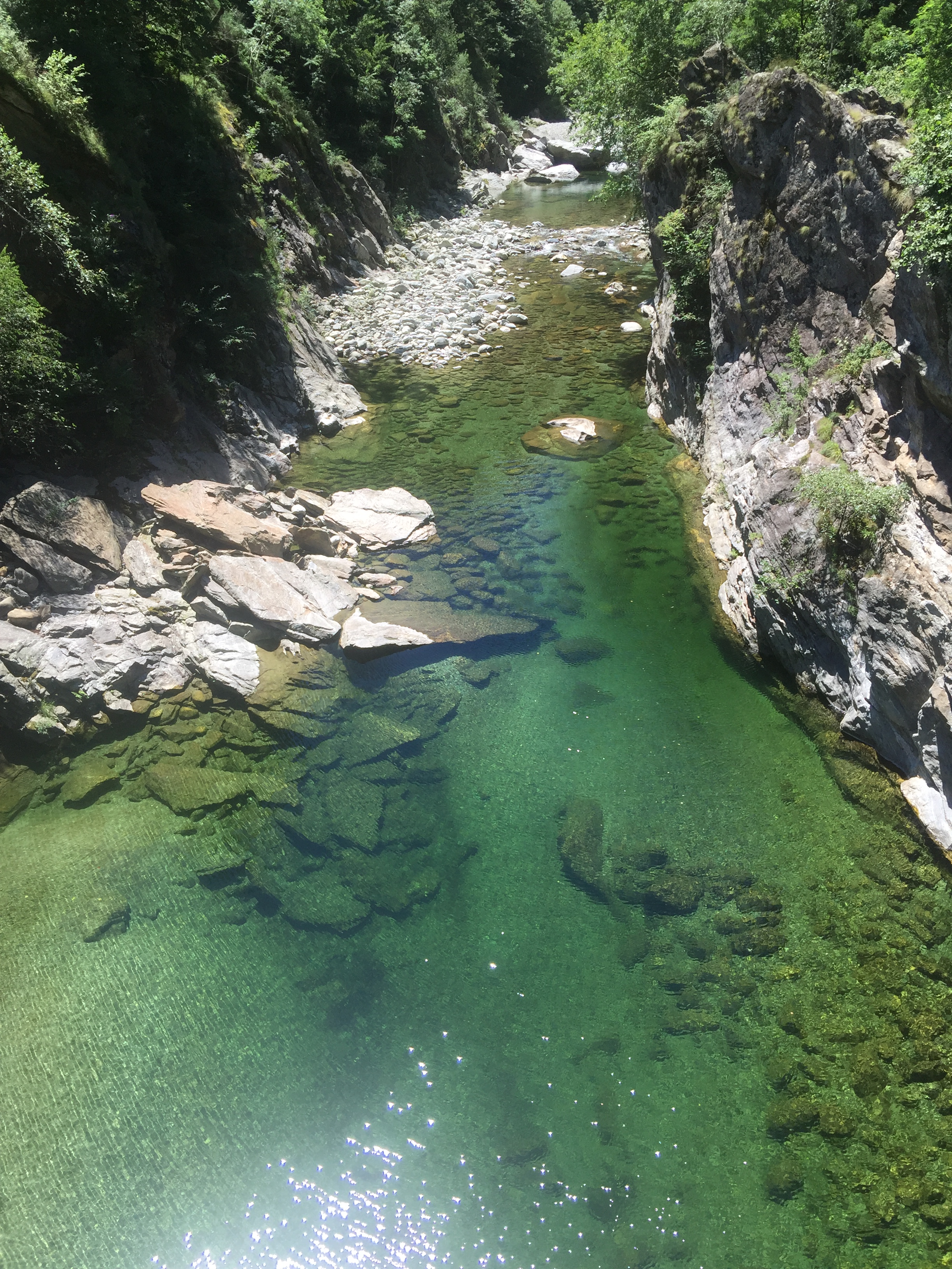 A Gresso je prend un bus jusqu’à Intragna où je vais profiter, une dernière fois, des cours d’eau tessinois pour me rafraîchir. C’est tellement mieux que la piscine ! En fin d’après-midi je saute dans le train du Centovalli, qui après quelques péripéties, me ramènera à la maison.