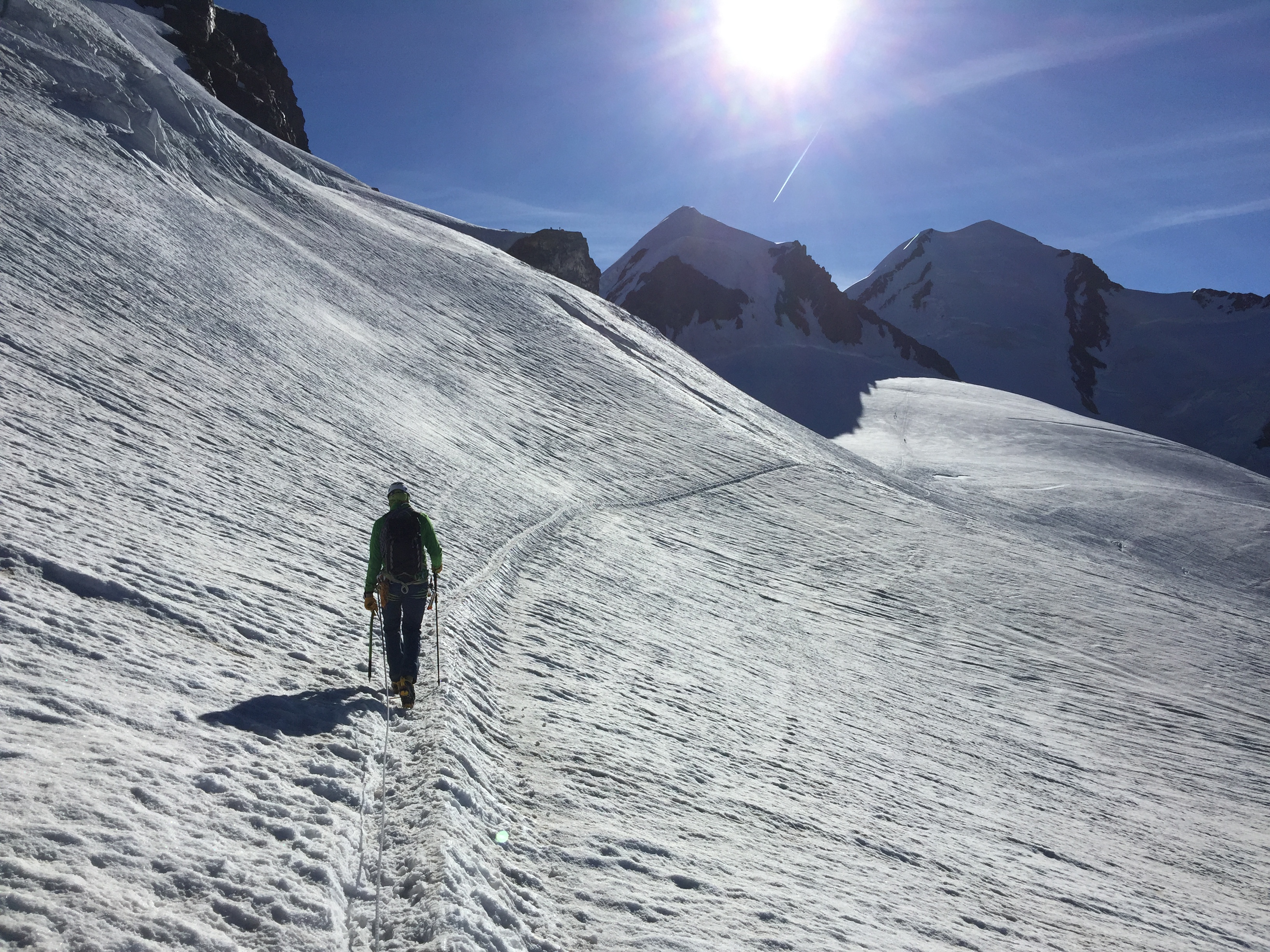 Le glacier commence à s’ouvrir et la trace louvoie pas mal entre les crevasses. Nous arrivons aux pieds du Pollux et nous rendons compte que la pente de neige que nous avions empruntée avec Manu il y a deux ans est impraticable. Toute en glace noire, beurk. Nous prenons donc l’arête intégrale qui passe très bien. Le rocher n’est pas hyper solide au début, nous faisons bien gaffe de ne pas faire tomber de pierre sur les autres cordées.