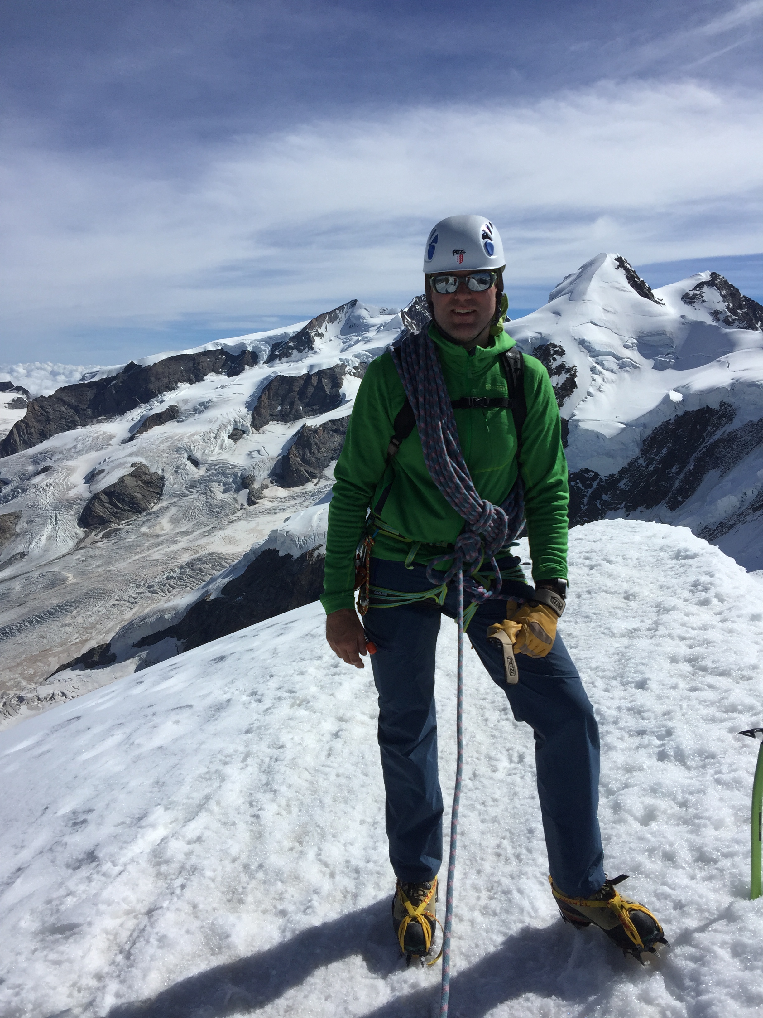 Le début de la semaine n’était pas super au niveau météo, nous avons fait des balades, la via ferrata, de l’escalade à Fluealp. Le vendredi s’annonce magnifique, nous partons avec la première benne pour le petit Cervin. Effectivement, le ciel est limpide et nous nous mettons en route tranquillement. Nous avons toute la journée devant nous et nous pouvons nous permettre de prendre notre temps.