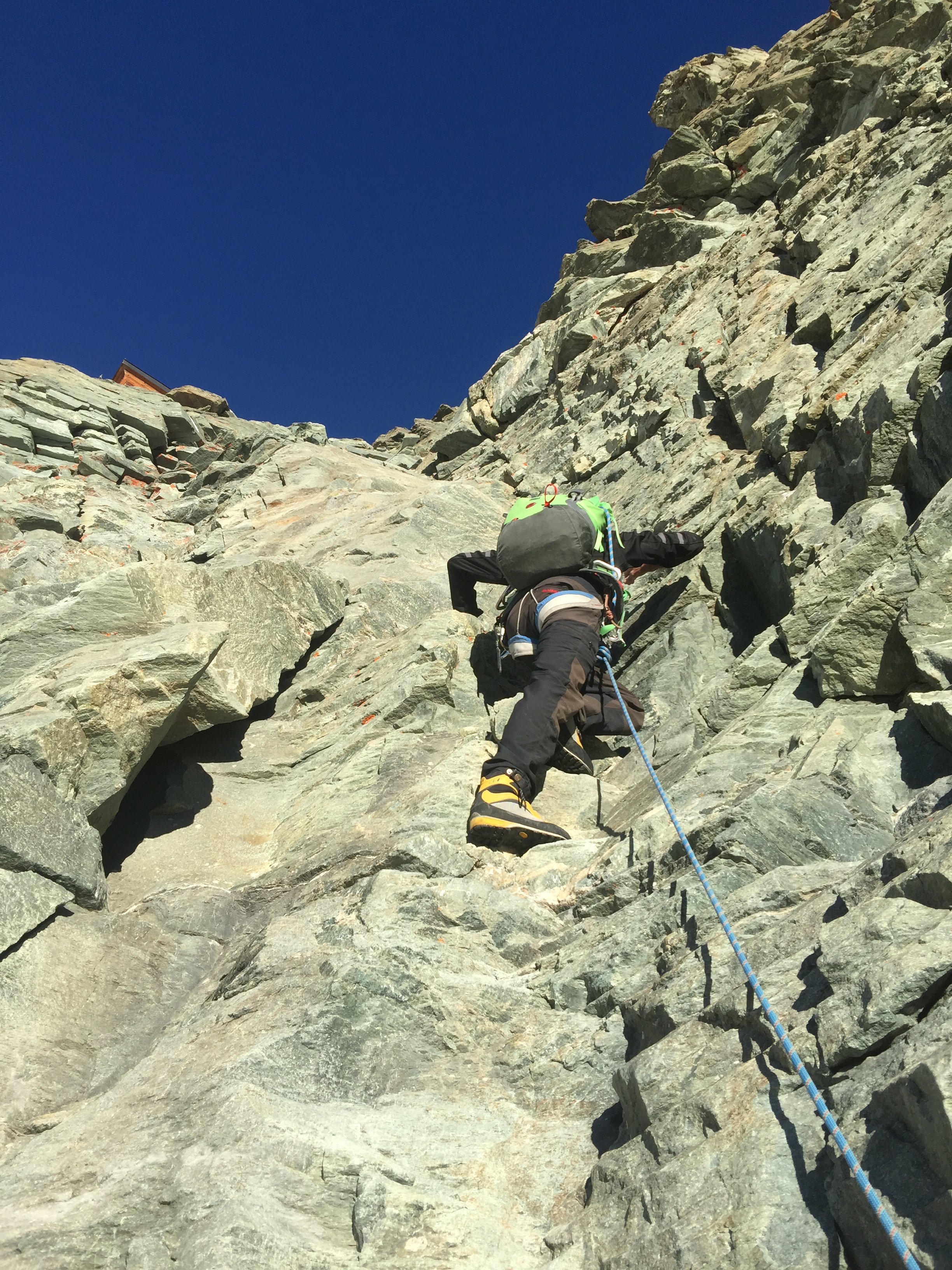 Nous ne sommes pas encore à Solvay, mais de loin pas, lorsque le seul guide de Zermatt fait demi-tour avec son client. Pas assez rapide.. pauvre gars, il doit être dégoûté. Moi je continue à mon rythme d’escargot obèse, avec Gérald qui m’encourage et me dit qu’on n’est pas pressés, qu’il va faire beau encore toute l’après-midi, et qu’on peut dormir à Schwarzsee si on loupe le dernier télé. Après 2h30 de marche nous arrivons à Solvay, où nous faisons une pause. L’escalade est vraiment plaisante, cela grimpe tout le temps finalement.