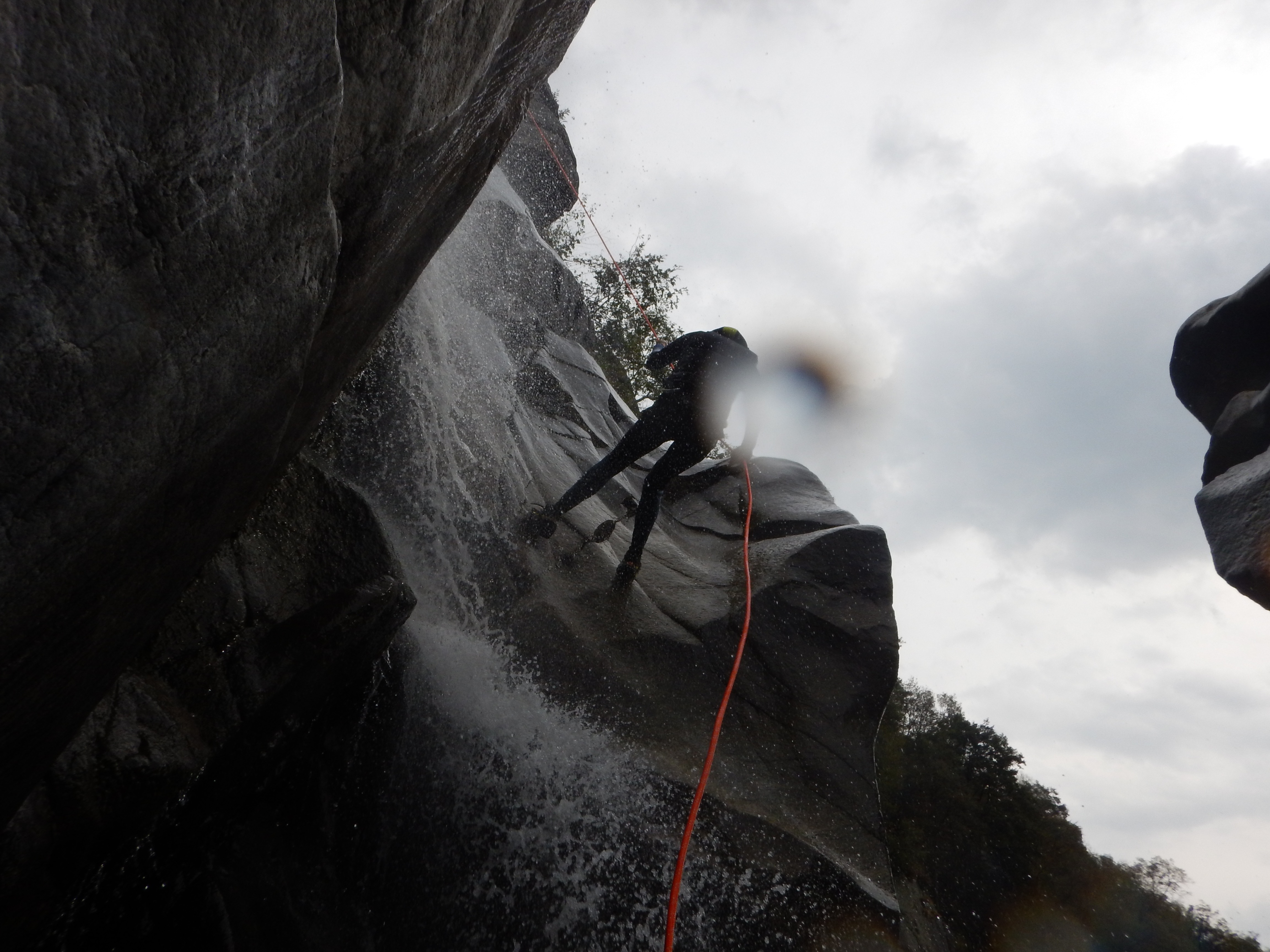 Il fait un peu moche, un temps parfait pour faire du canyon. Les sauts, les rappels et les toboggans s’enchainent, on ne voit pas le temps passer. L’eau est encore bonne, environ une 15aine de degrés. Ca change de la Salanfe !