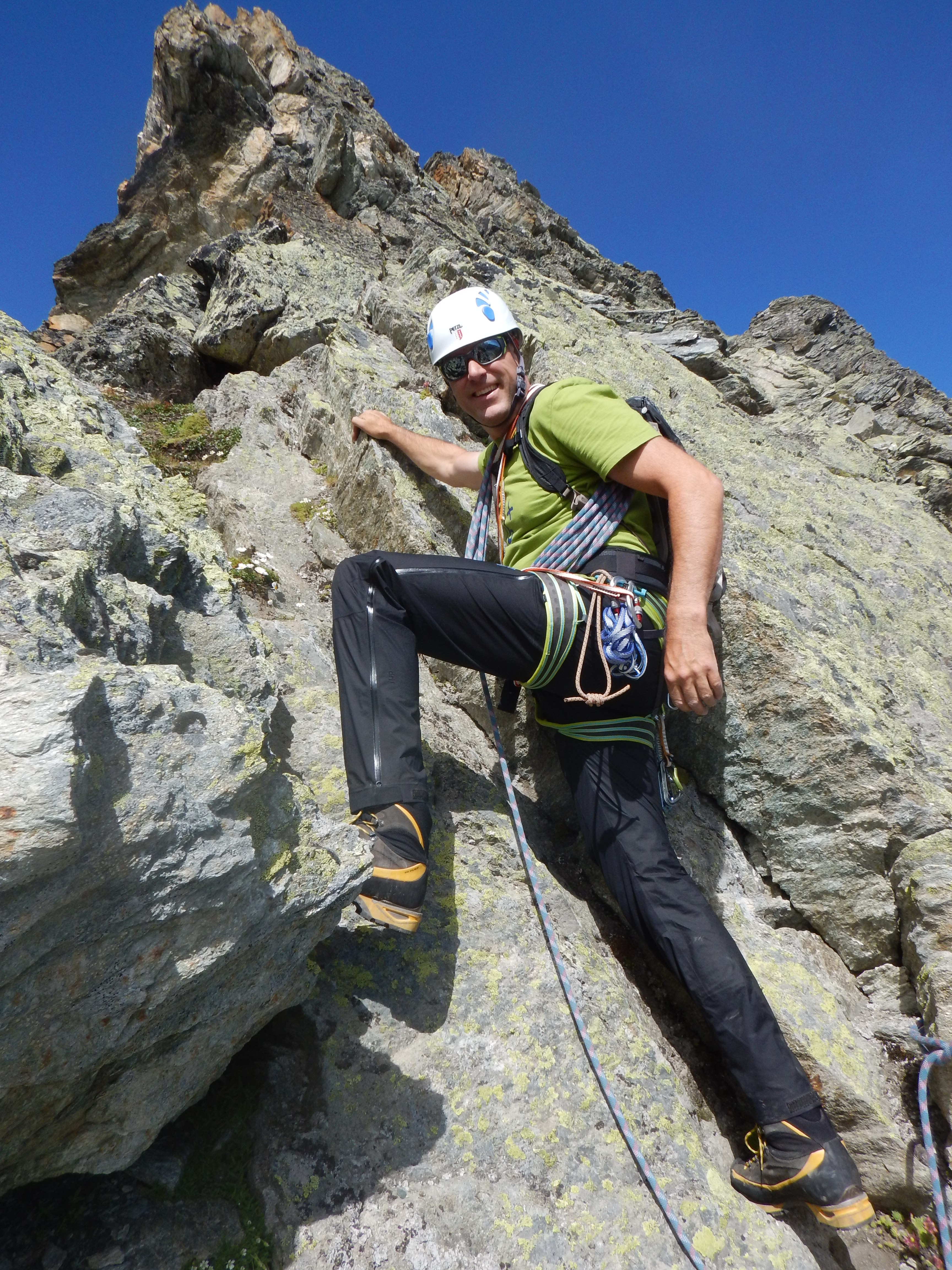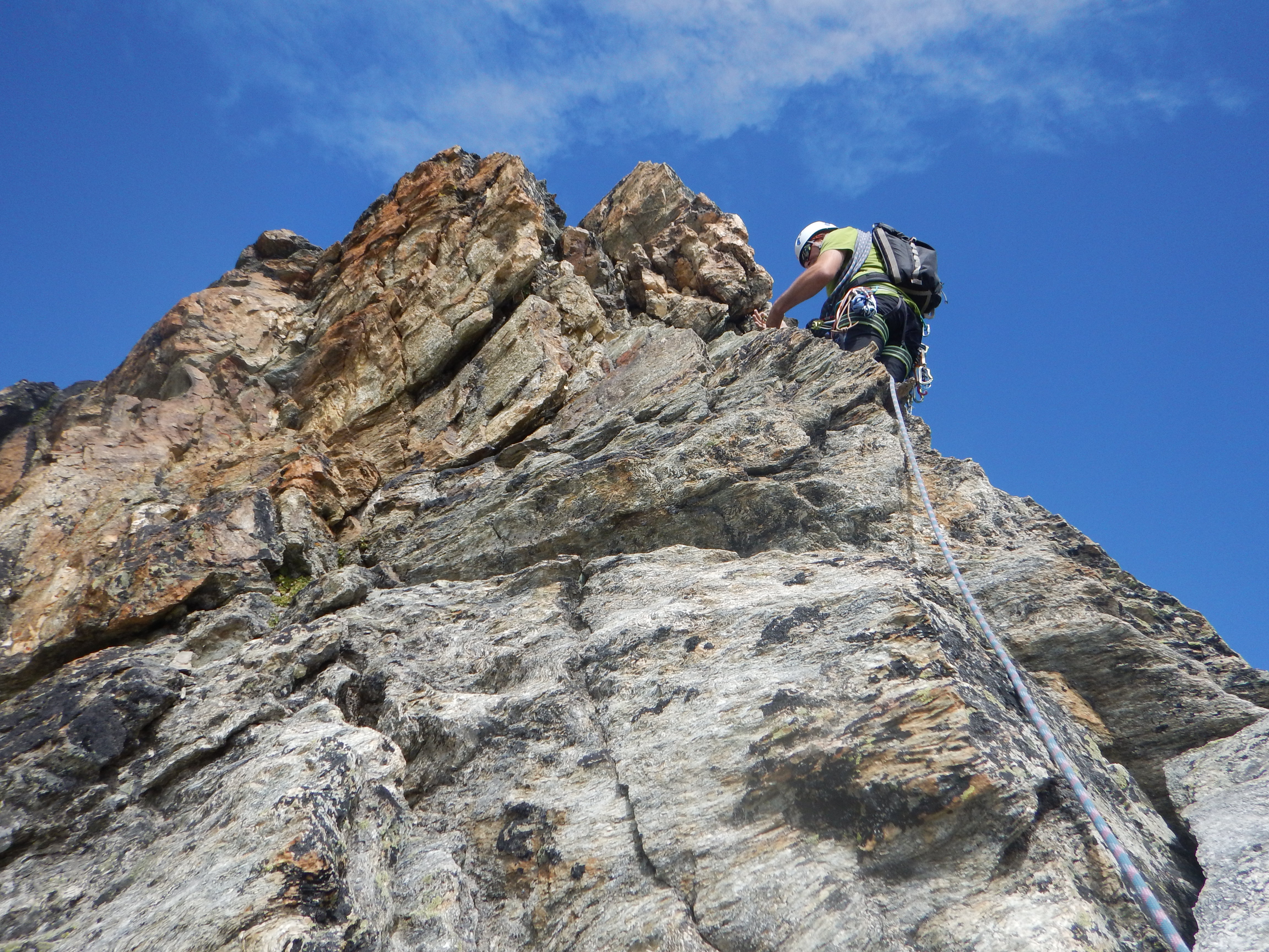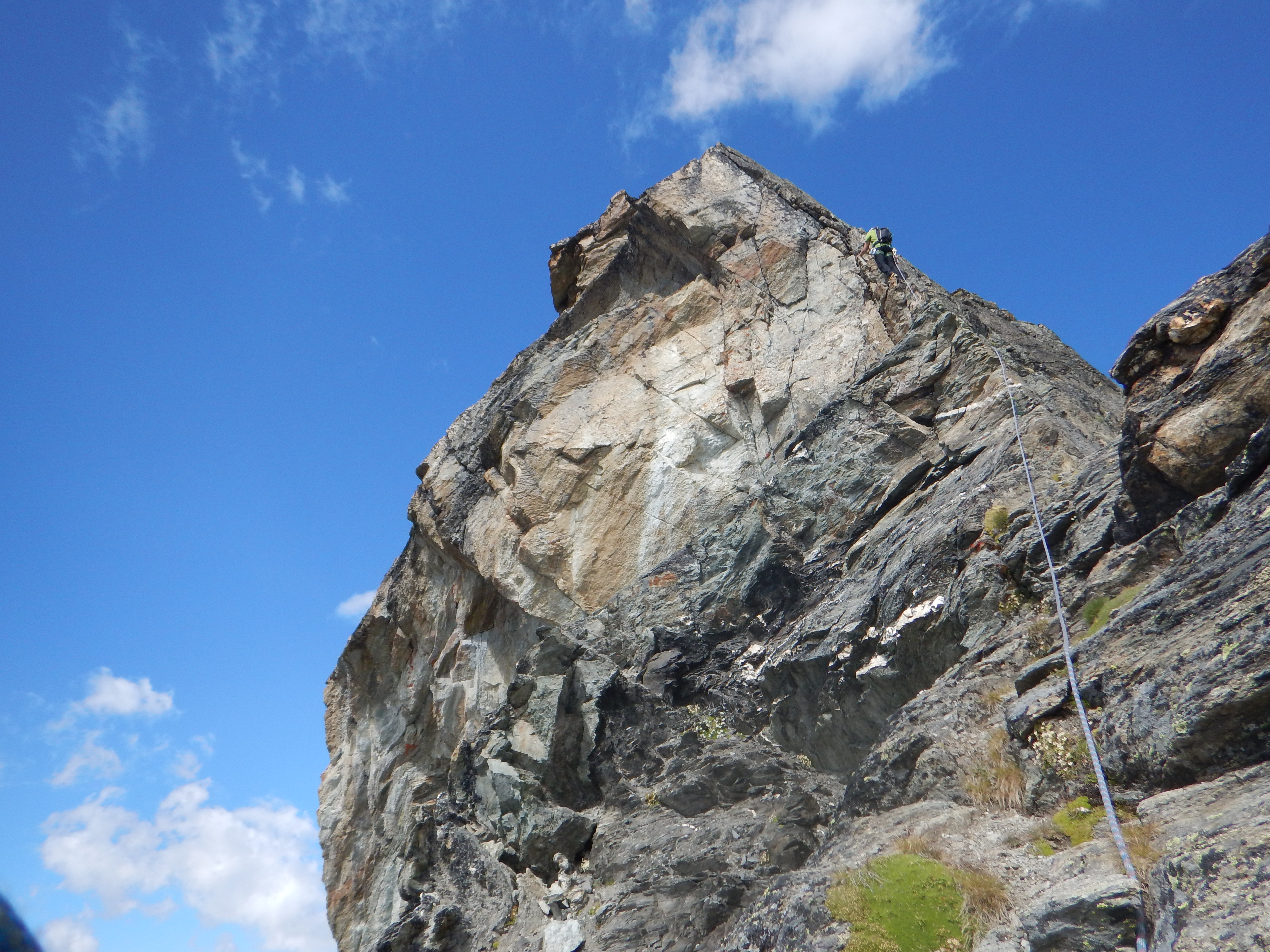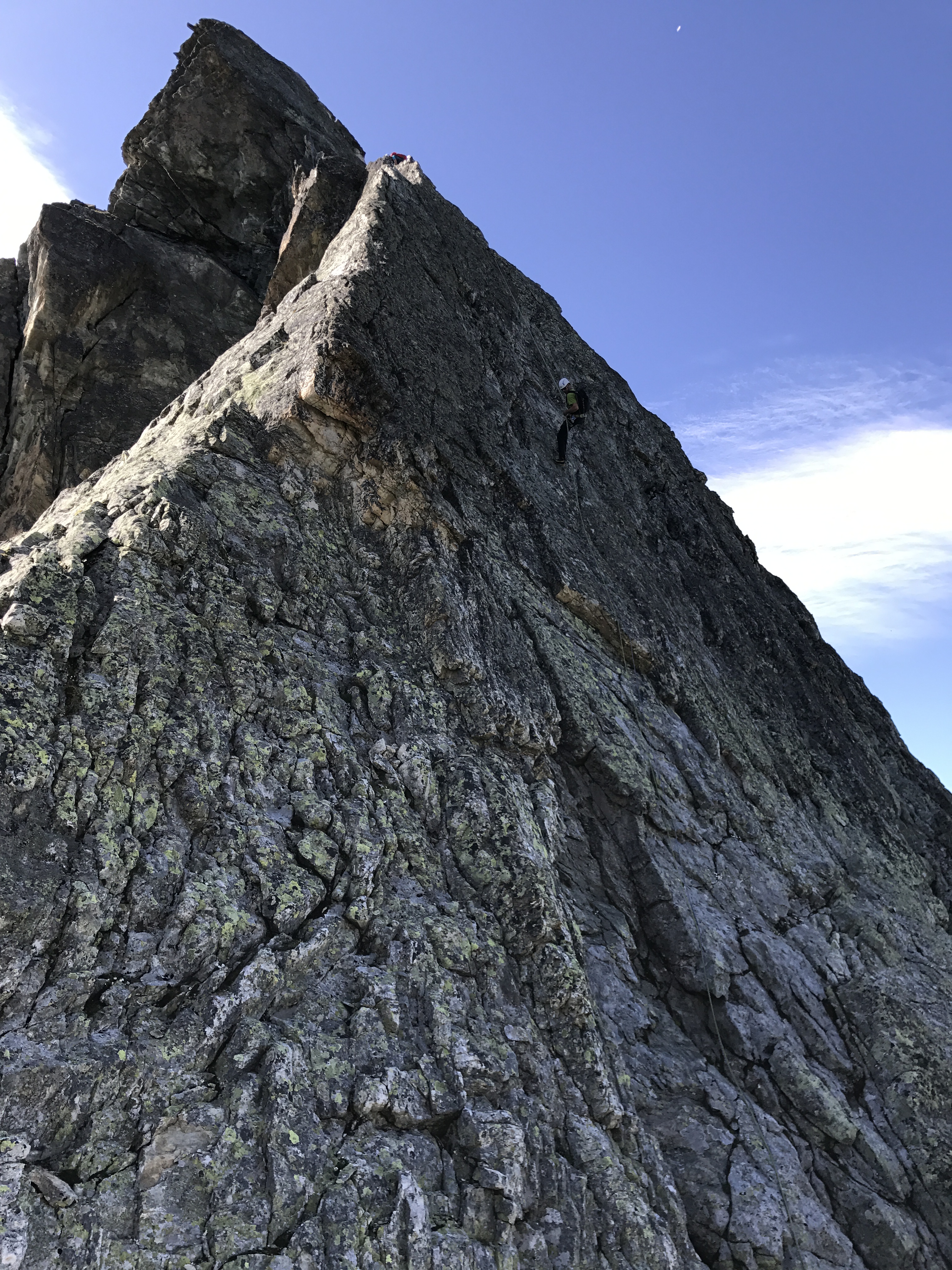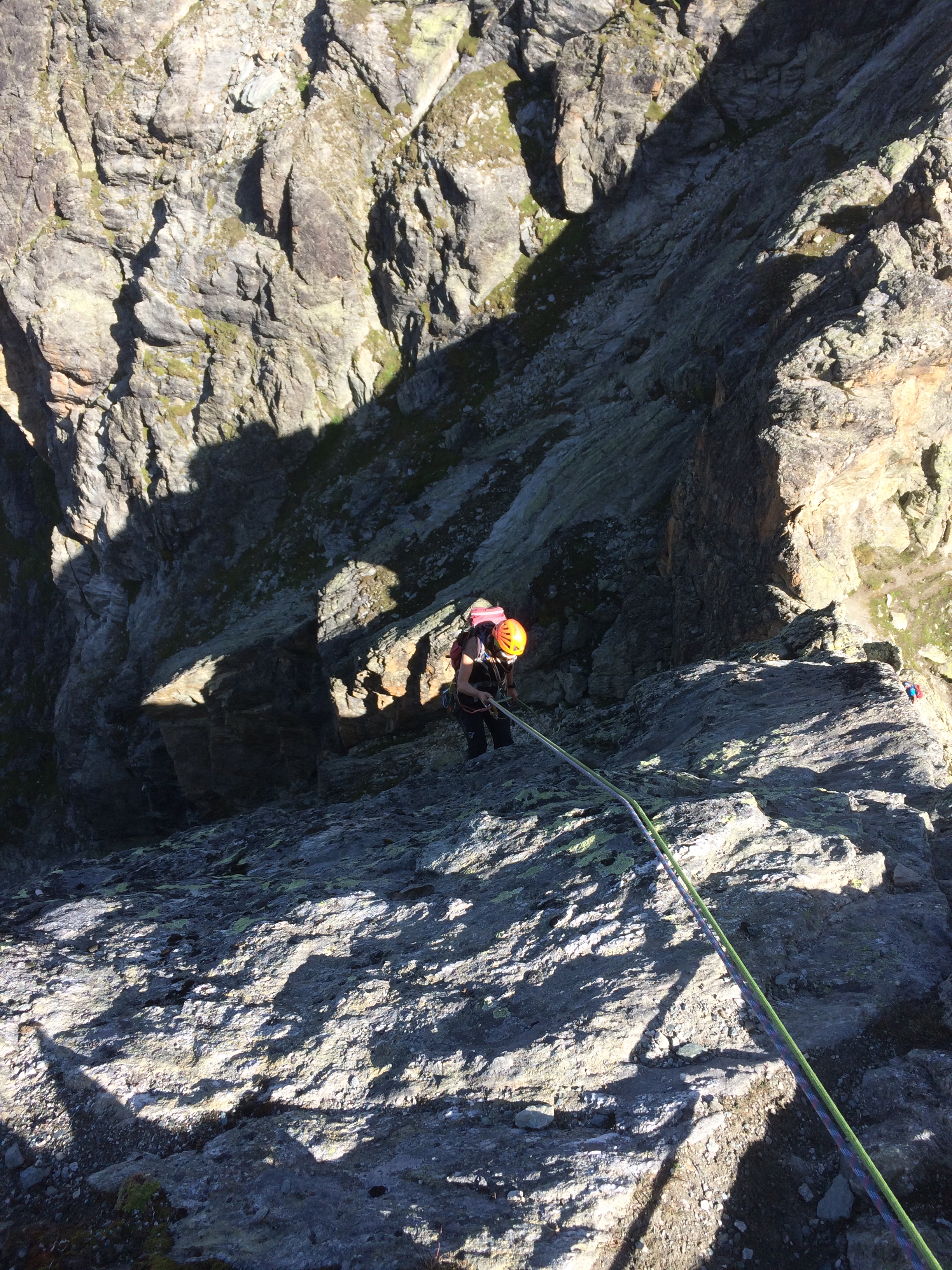 L’approche n’est pas difficile et fini de nous réveiller tranquillement. Nous nous équipons, et filons dans la voie, alors qu’une équipe de 6 du CAS Gruyères arrive à l’attaque. J’ai négocié ferme avec Pål. Je fais le clocher en tête, et je lui laisse gérer la suite ! Finalement le calcul n’était pas génial, parce que je me suis tapée le pas le plus dur. Mais bon pas si dur quand même, puisque j’y suis arrivée.