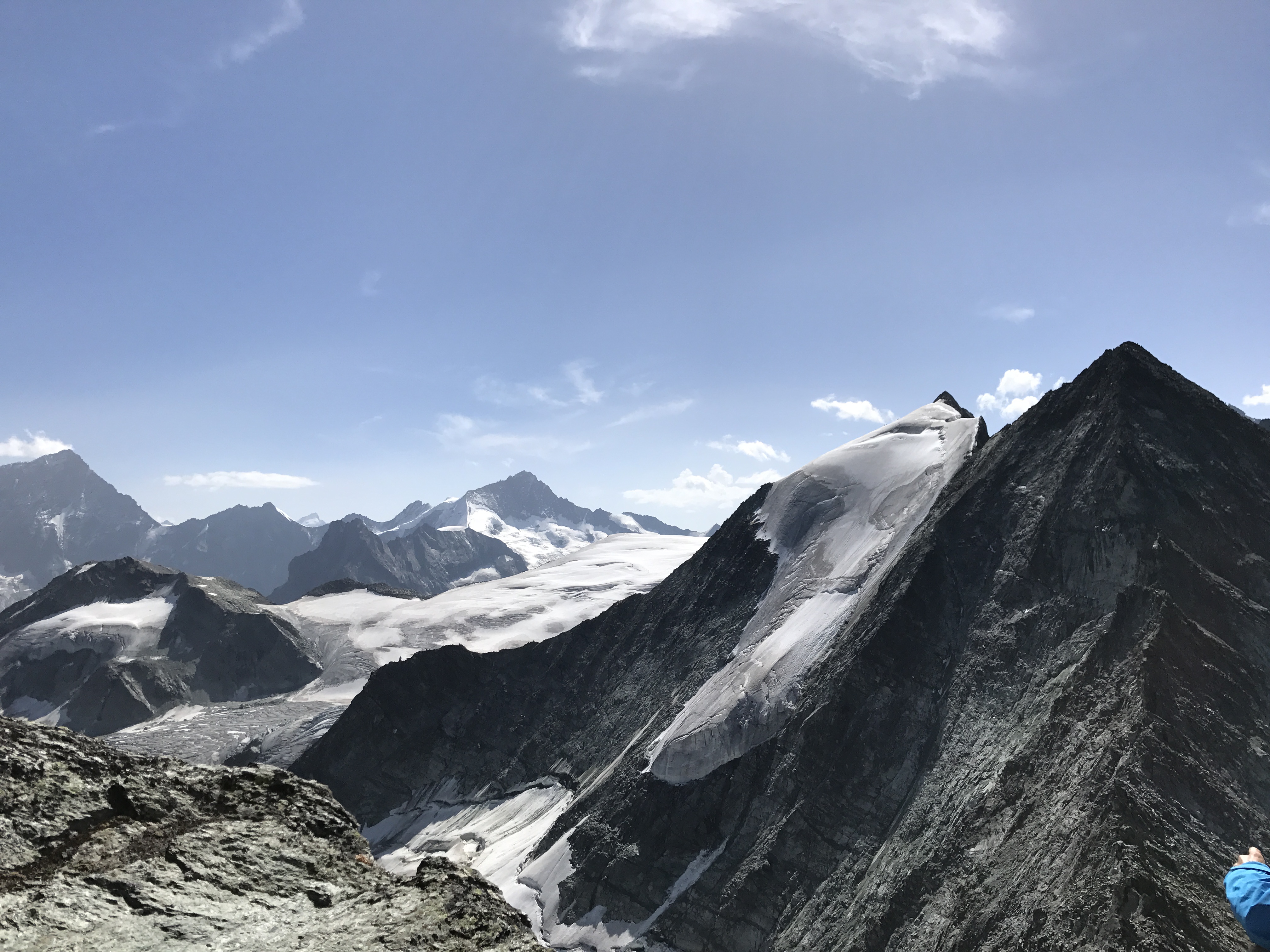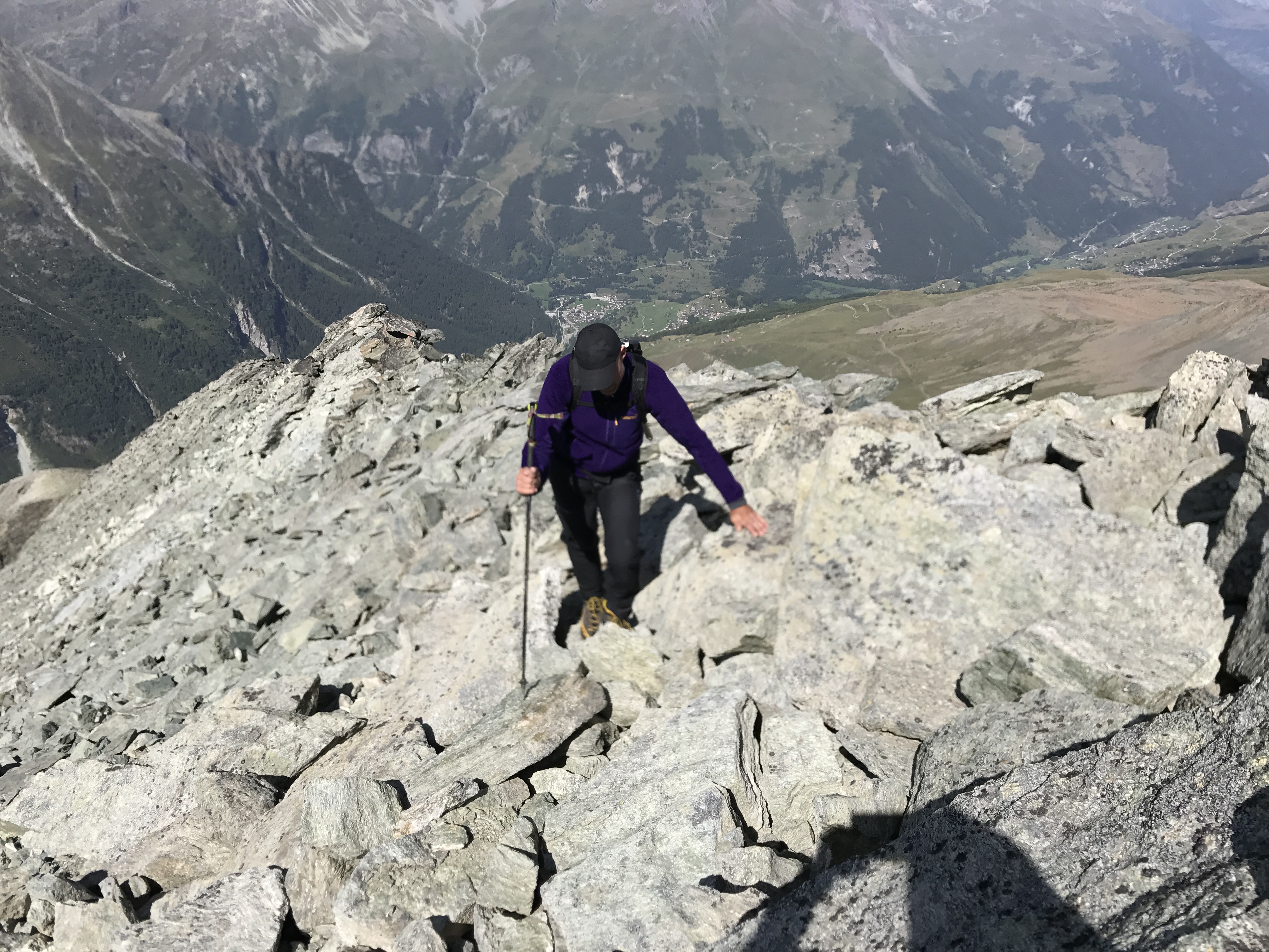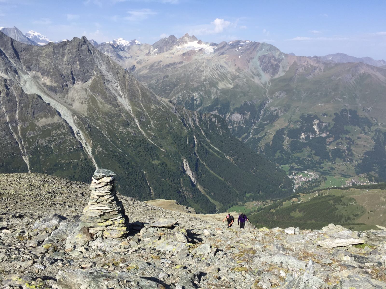 Du sommet, on se rend quand même compte que nous sommes en haute montagne (La Tsa de l’Ano culmine à 3367m), avec la Point de Mourti juste à côté et les 4000 de la couronne impériale en ligne de mire. On ne traîne quand même pas trop, des orages sont annoncés pour l’après-midi.