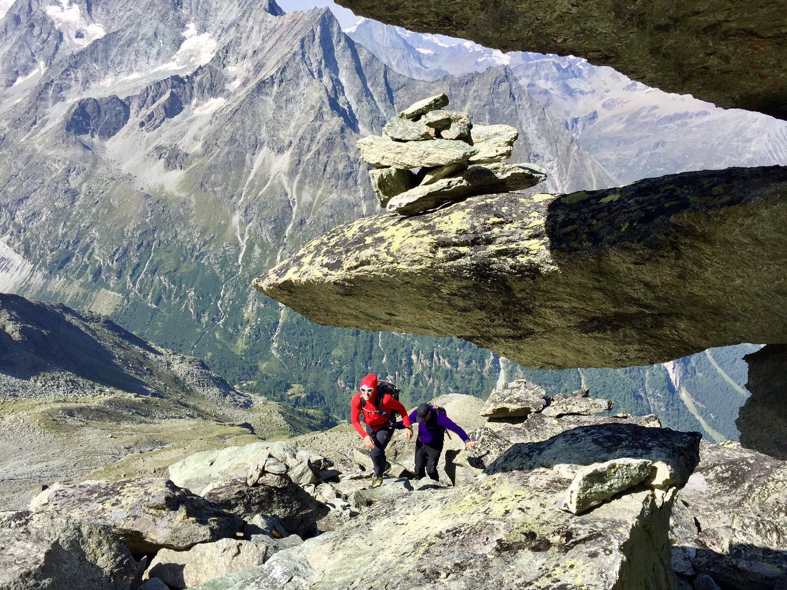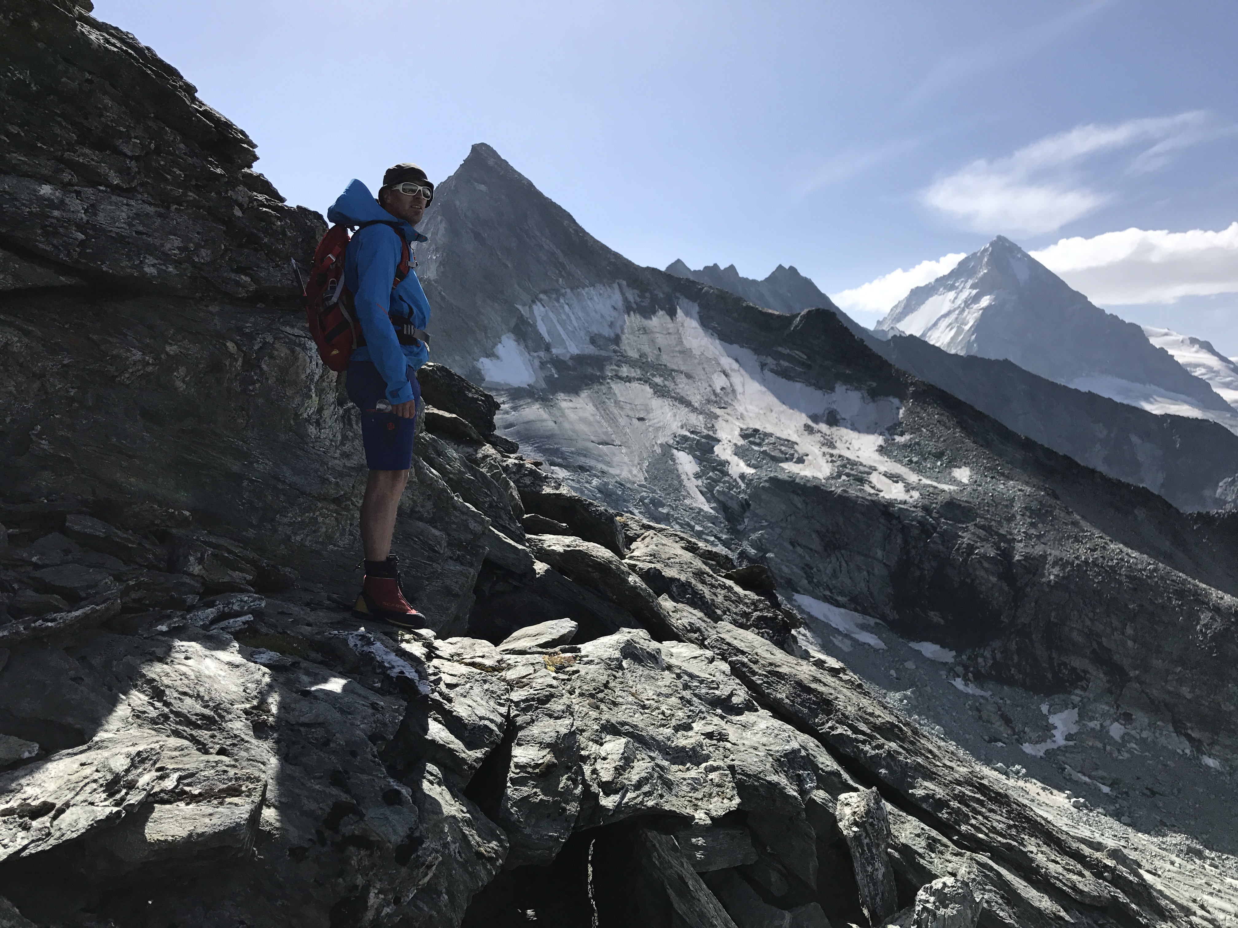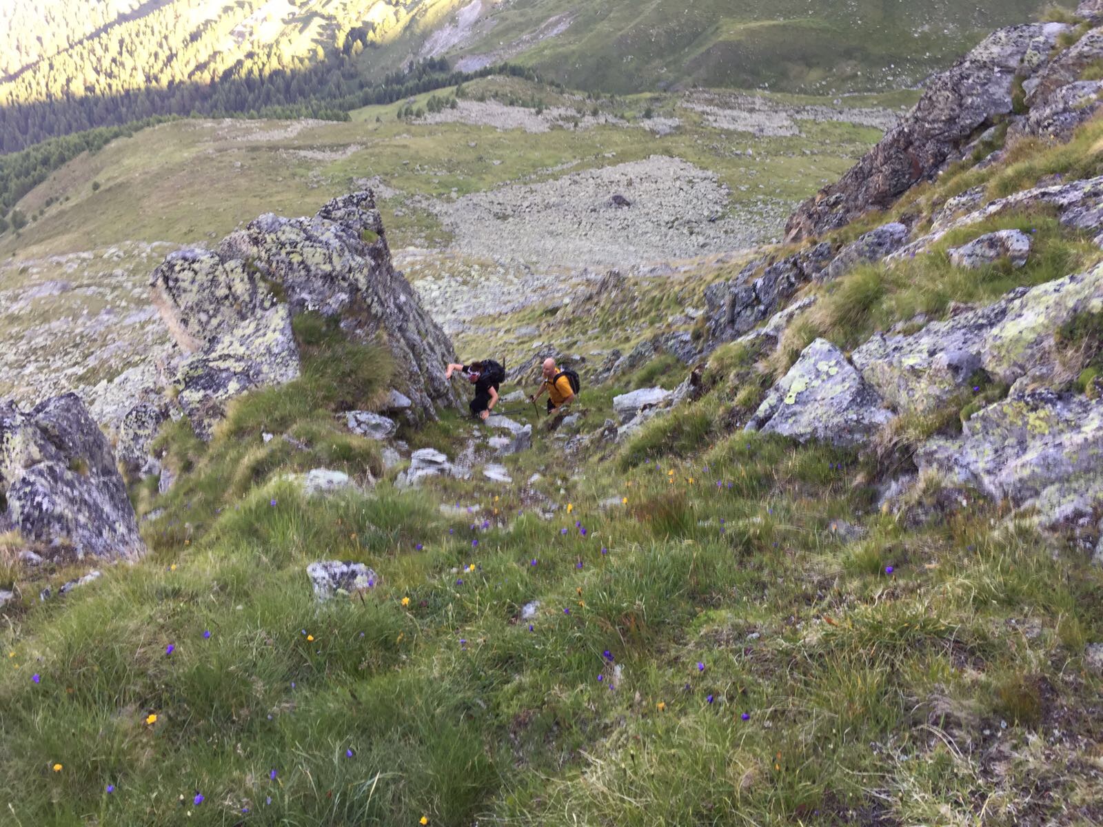 Du sommet, on se rend quand même compte que nous sommes en haute montagne (La Tsa de l’Ano culmine à 3367m), avec la Point de Mourti juste à côté et les 4000 de la couronne impériale en ligne de mire. On ne traîne quand même pas trop, des orages sont annoncés pour l’après-midi.