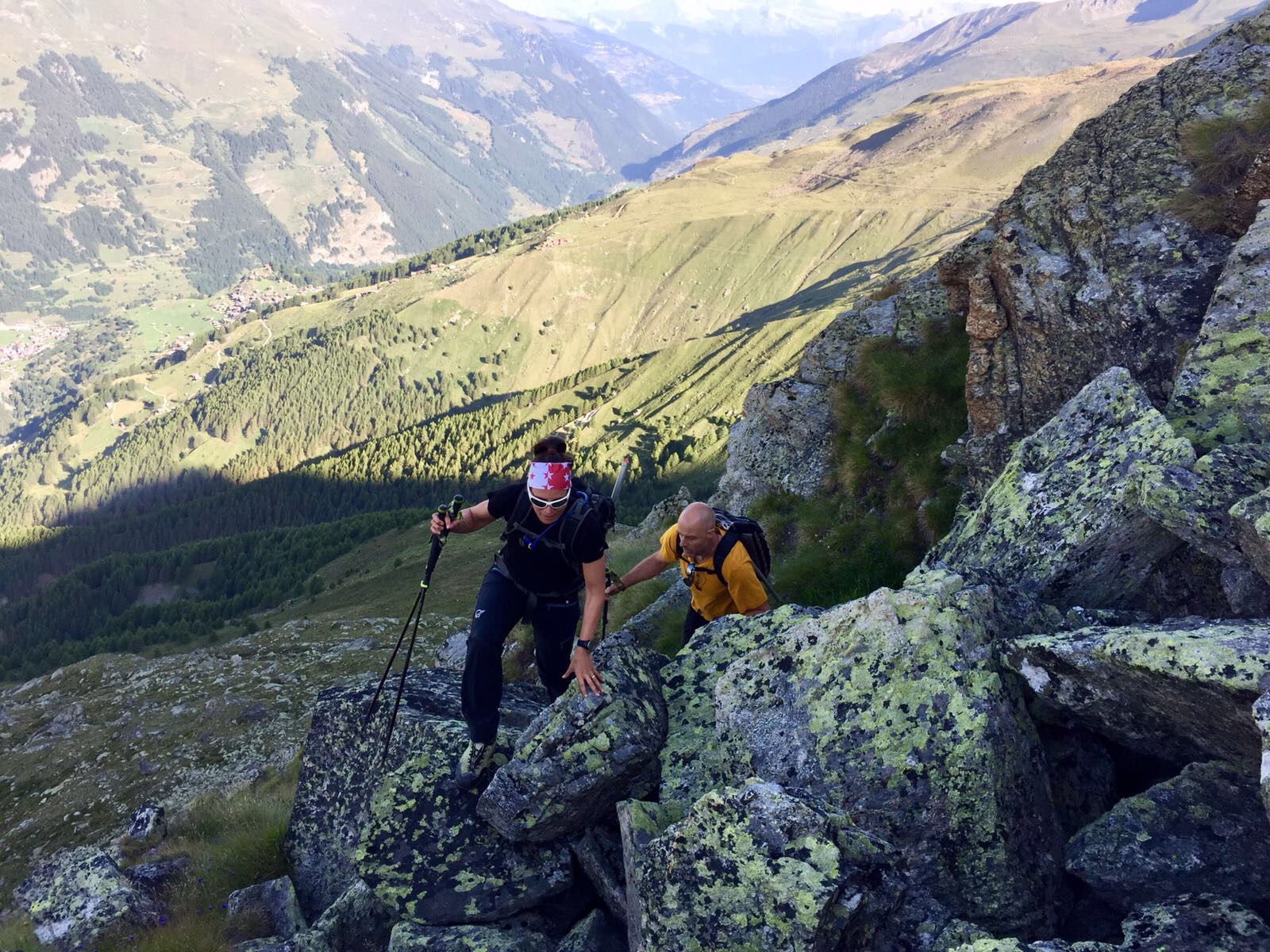 Nous arrivons sur une grande croupe herbeuse et caillouteuse. La montée est hyper efficace et l’altitude défile. Il fait toujours beau grâce a un foehn puissant qui maintient les orages à distance, pour l’instant. Nous faisons une petite pause vers le grand cairn du point 2989. La suite est essentiellement rocheuse et Vincent décide de laisser ses bâtons dans la caillasse. L’arête est de plus en plus belle et les difficultés modestes.