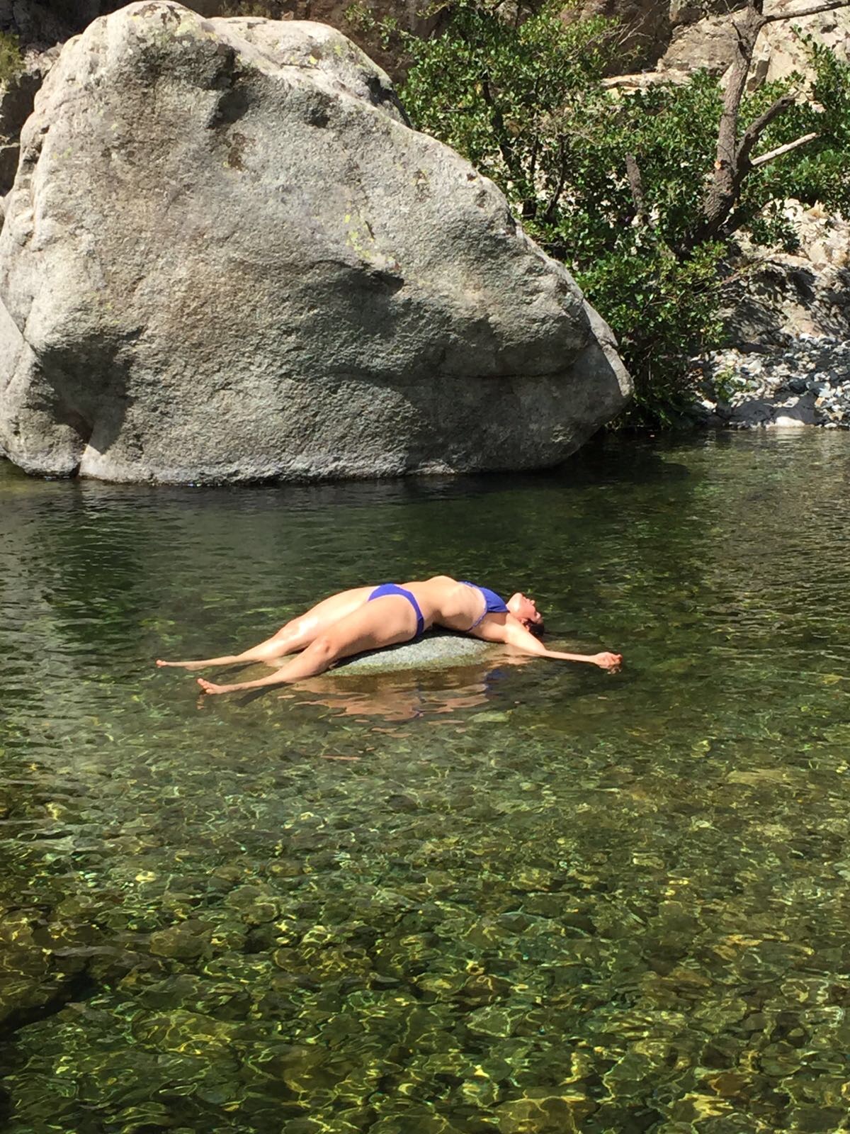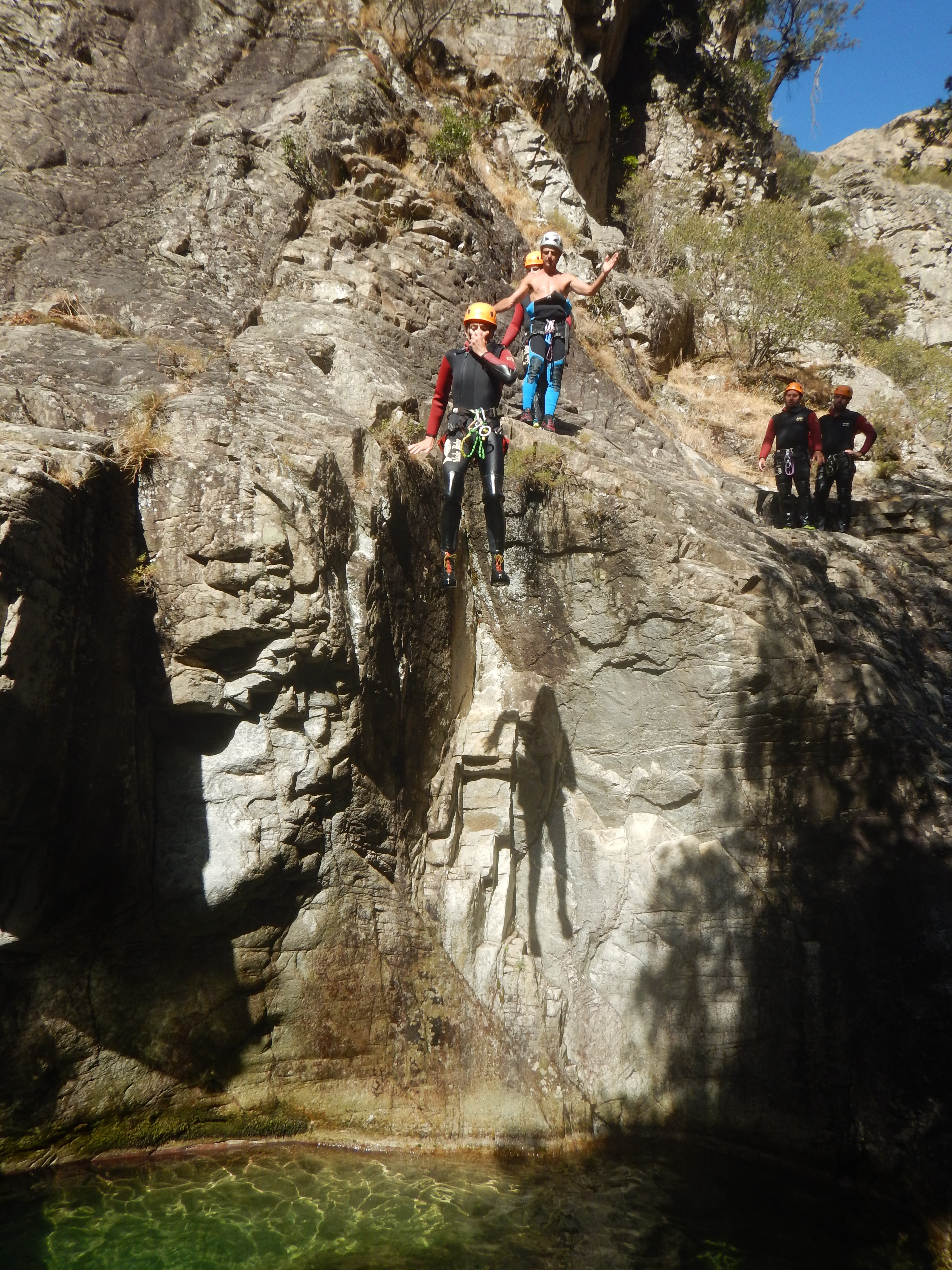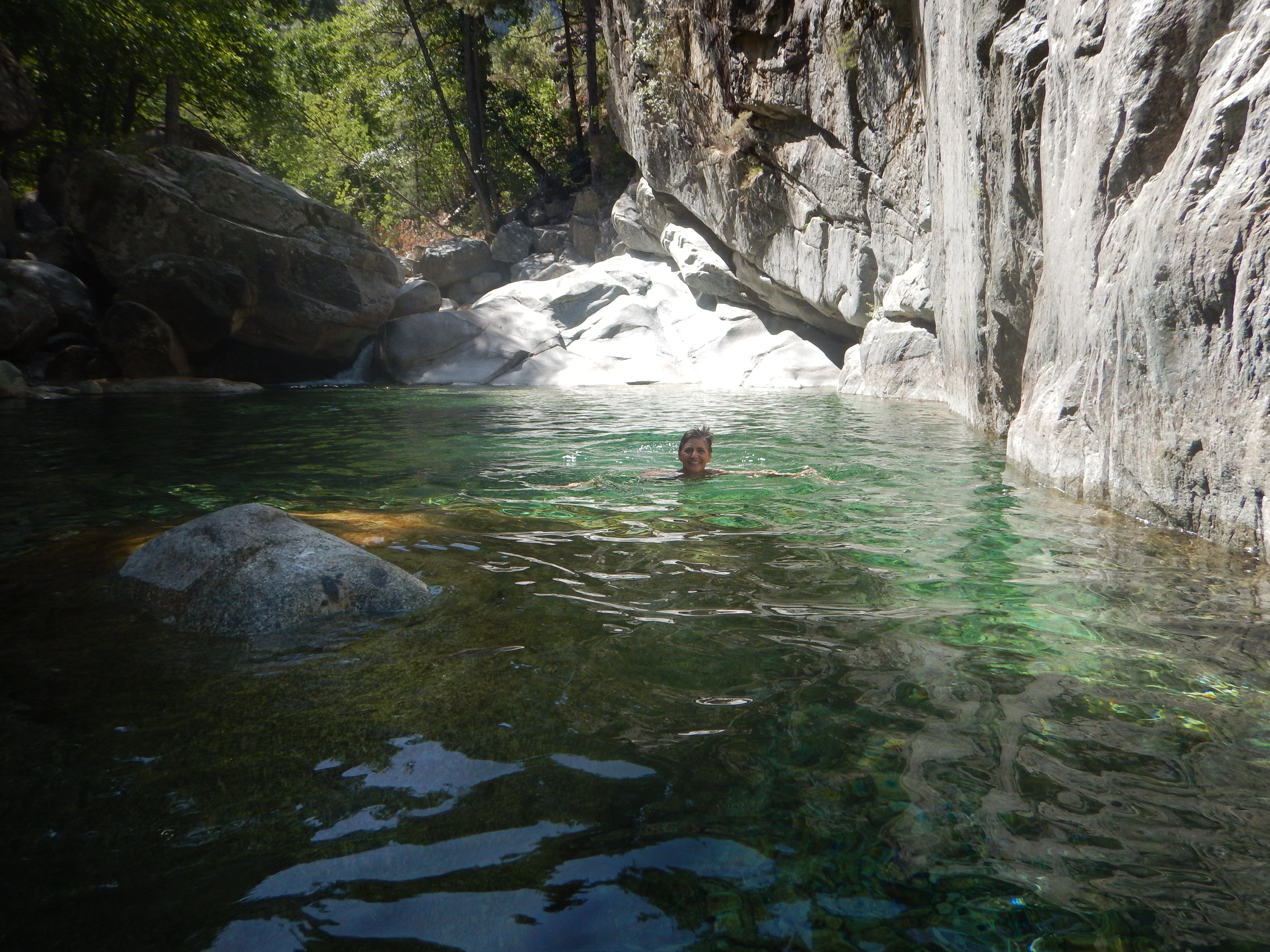 Le lendemain, nous avons rendez-vous à Bocognano pour aller parcourir le canyon de la Richiusa. L’eau est chaude et translucide, quel bonheur ! Claudia parcourt son premier canyon et rien ne lui fait peur. Elle fait le saut de 7 mètres sans hésiter, la classe ma copine ! Après avoir grignoté un sandwich sur une terrasse, on part à Ajaccio à la plage, histoire de voir quand même la mer durant notre séjour. On essaie de glander sur le sable comme le ferait des gens normaux, mais c’est trop dur. On reprend la voiture et on va encore faire une petite balade près du col de Vizzavona avant de rentrer.