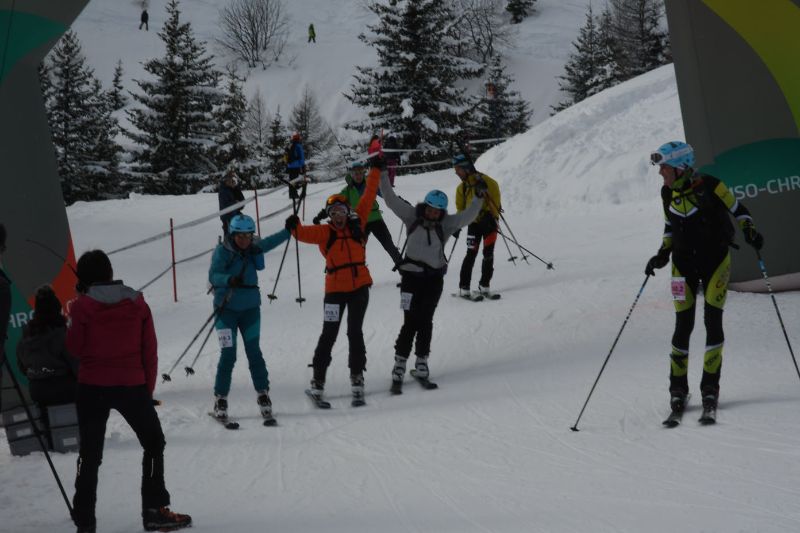 La hanche de Pauline la fait souffrir dans la descente, la neige devient quand même assez lourde et pas facile à skier. Vincent et les enfants sont là pour nous encourager au pied du dernier portage de la journée, trop sympa de voir des têtes connues ! Ce dernier portage est bien raide, mais pas long. Céline nous choisi la meilleure trace et on dépasse pas mal de monde. Plus ça va, mieux je me sens, ça ne me dérangerait pas que ça dure encore un peu cette course ! Après une dernière petite descente, on passe la ligne d’arrivée main dans la main, heureuses.