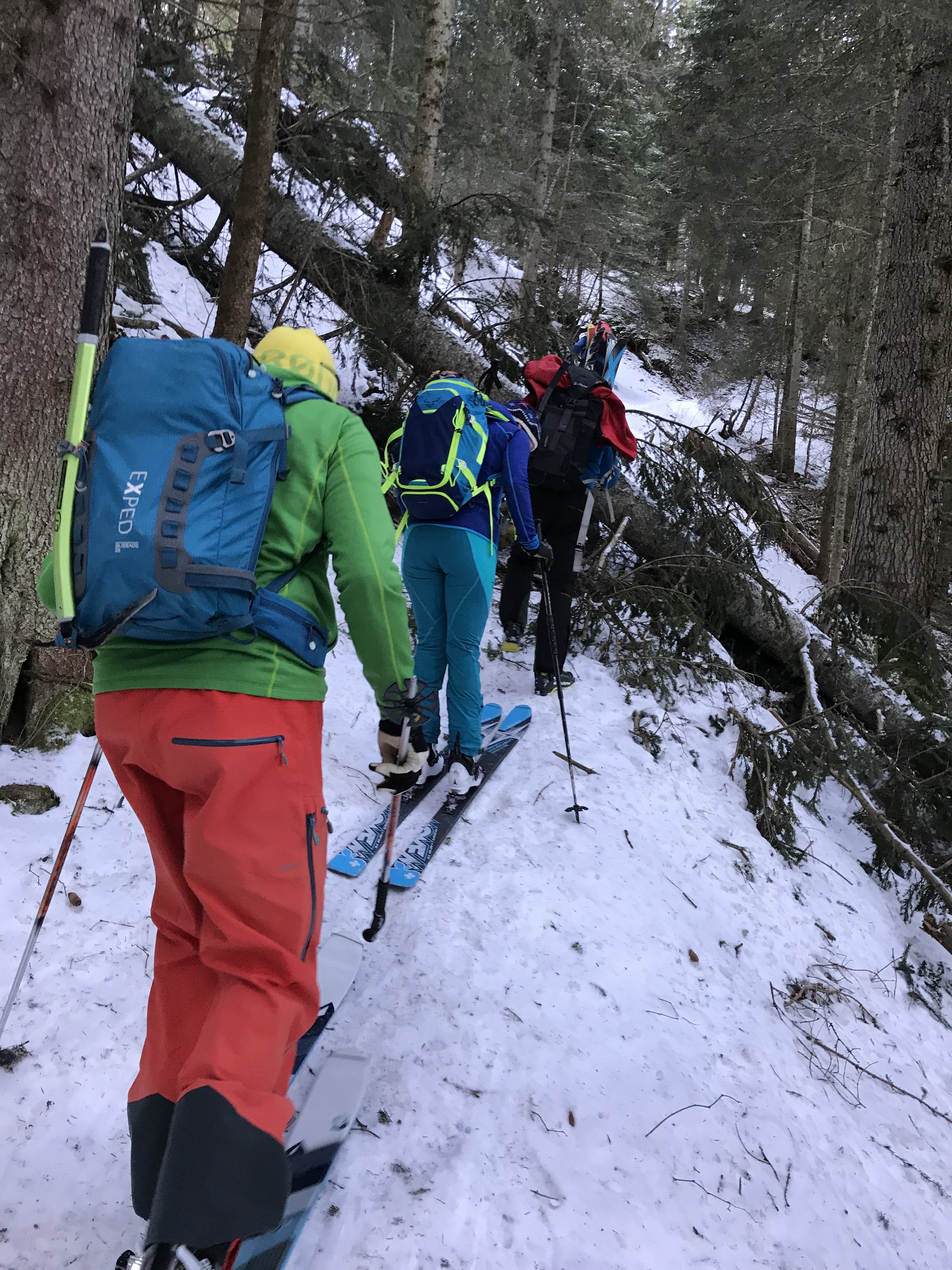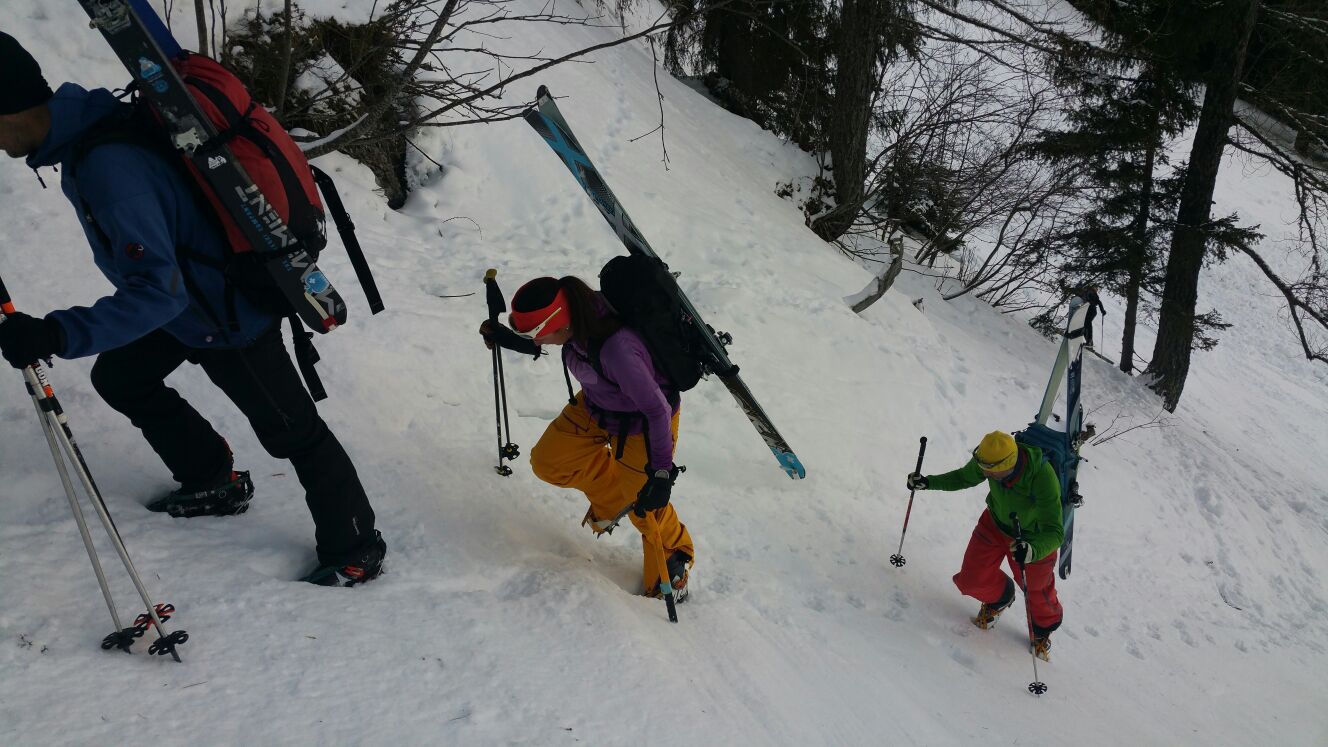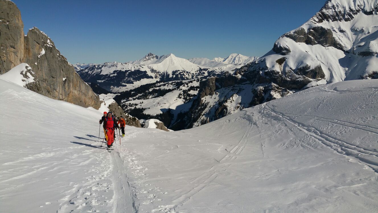 Rendez-vous était donné à Gsteig avec Céline, Vincent et les coéquipiers de Vincent pour la patrouille. Au total, 8 joyeux lurons au départ. On commence par remonter la piste, puis traverser un petit bout de forêt un peu déneigé avant de déboucher dans une clairière. De là on voit le fameux couloir, que nous décidons de remonter en crampons pour plus de sécurité. Le piolet n’aurait pas été nécessaire ce jour là, la glace est encore loin.