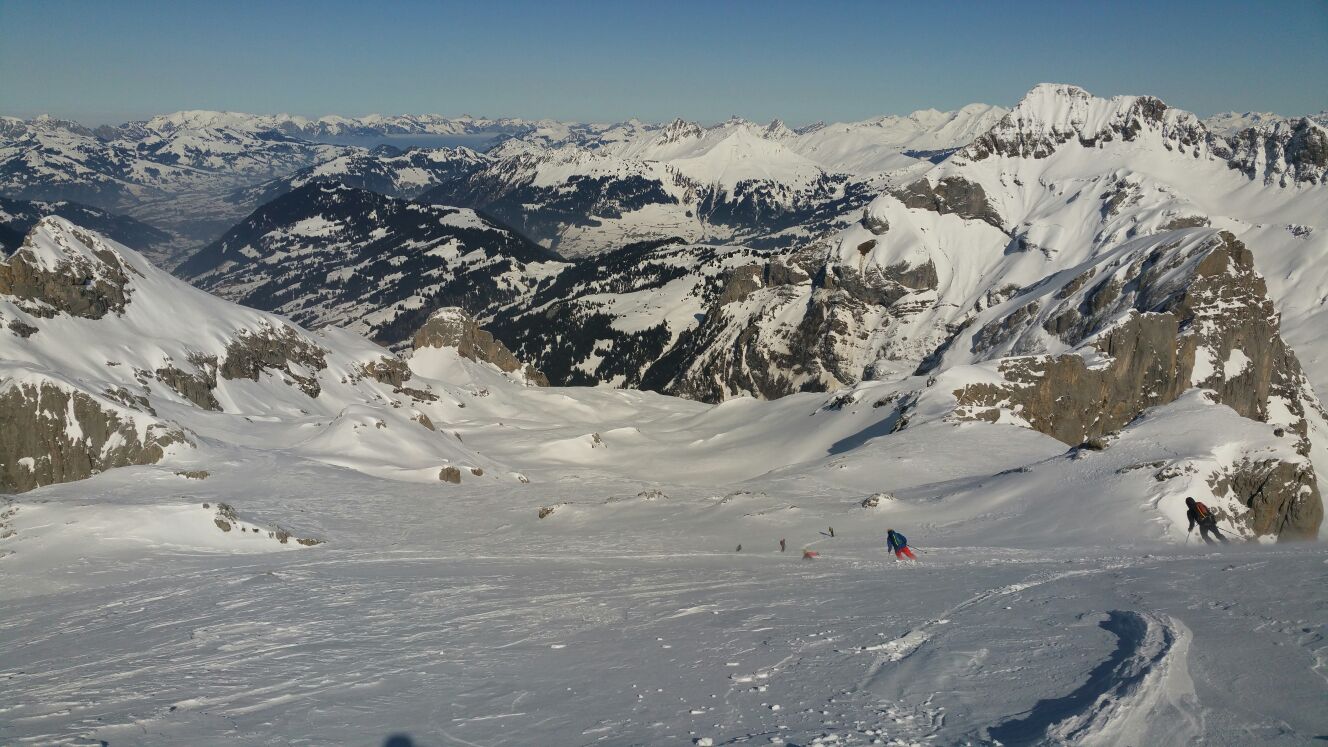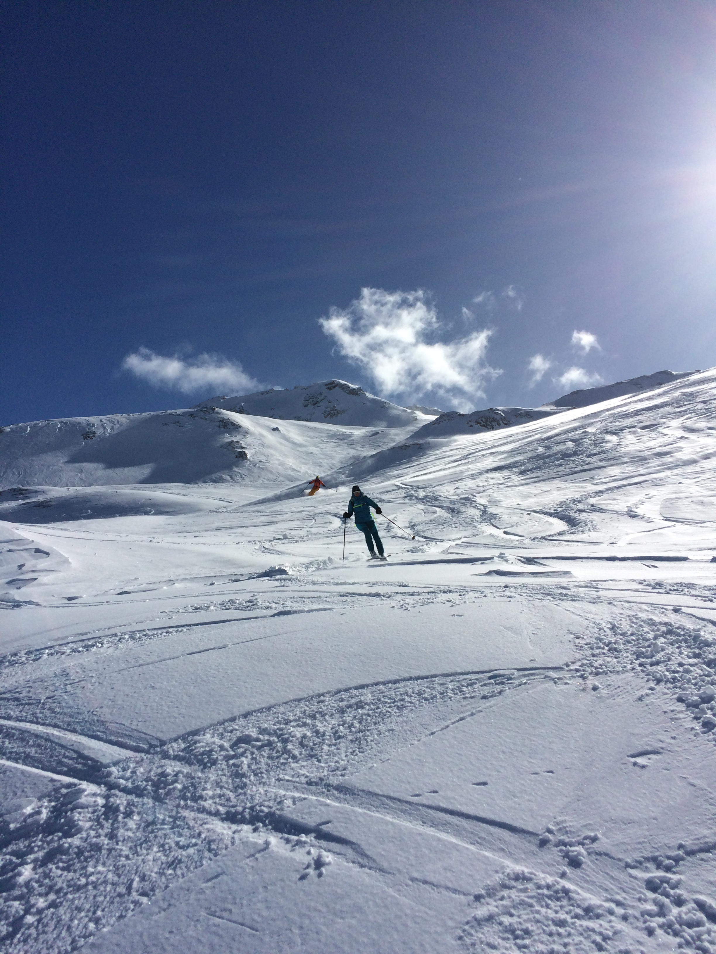 On rechausse les skis pour une belle partie dans une forêt de mélèze, puis on débouche sur de belles combes ensoleillées. C’est de toute beauté. Et heureusement parce que c’est long. Je ne m’en suis pas tellement rendu compte à la montée, mais à la descente on prend conscience de la distance parcourue.