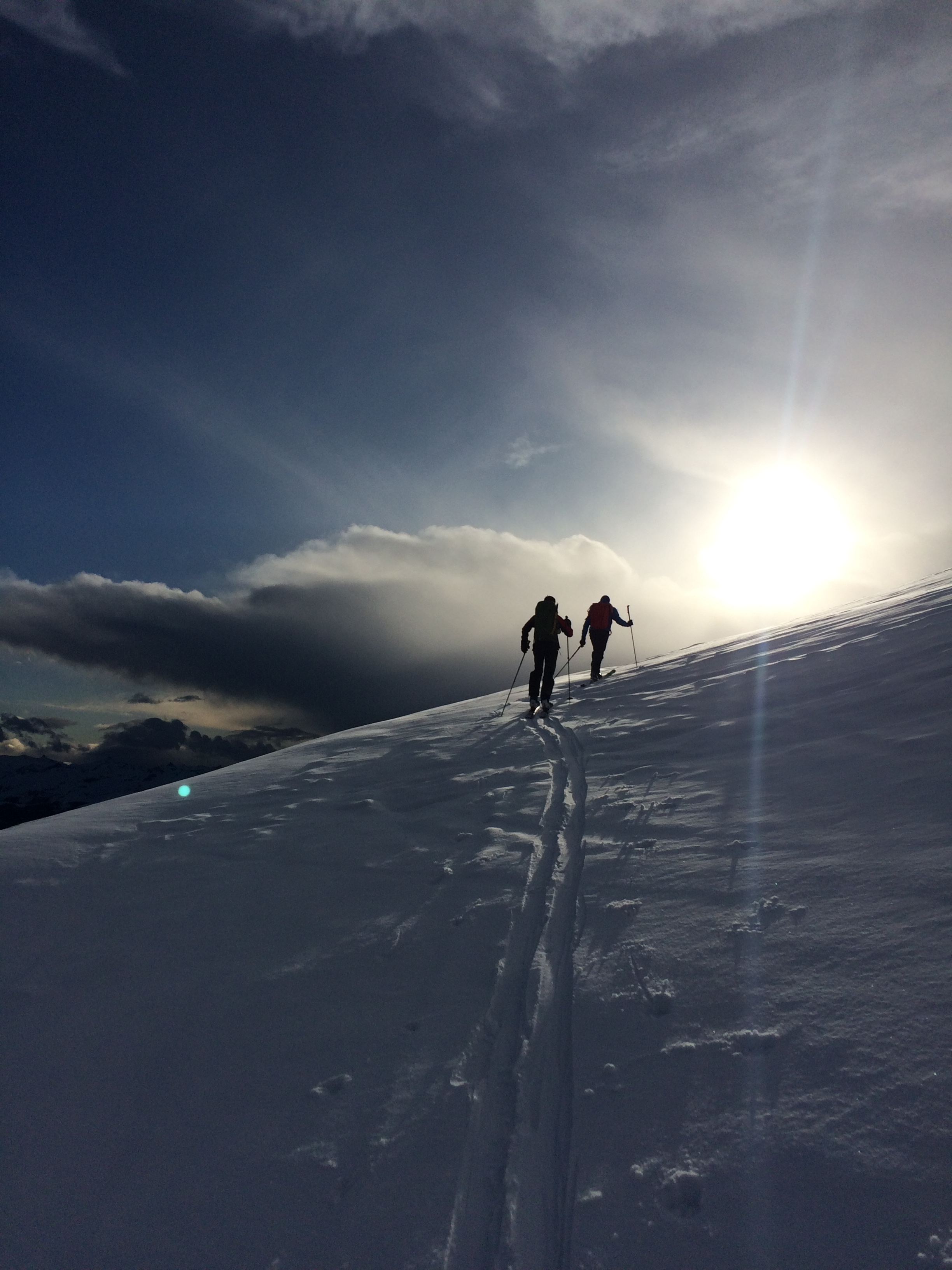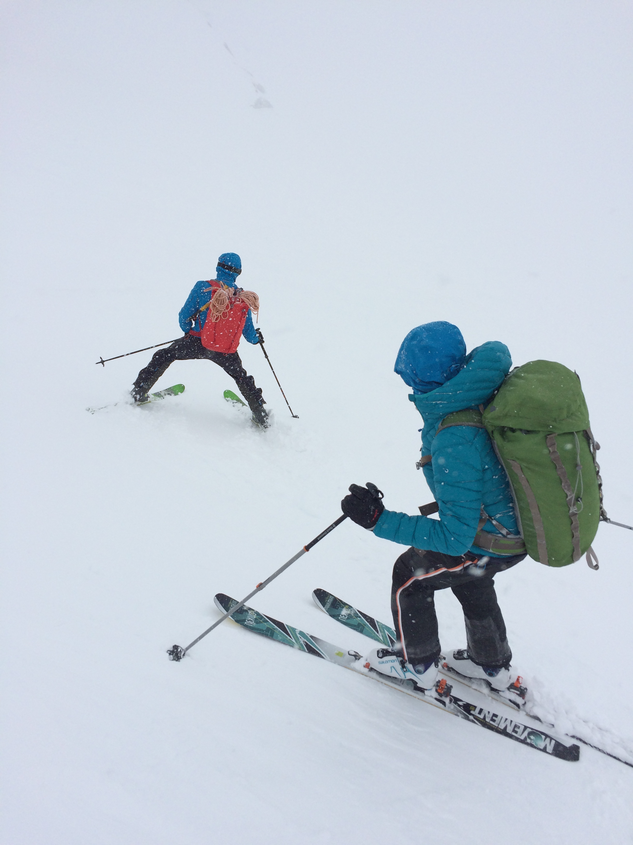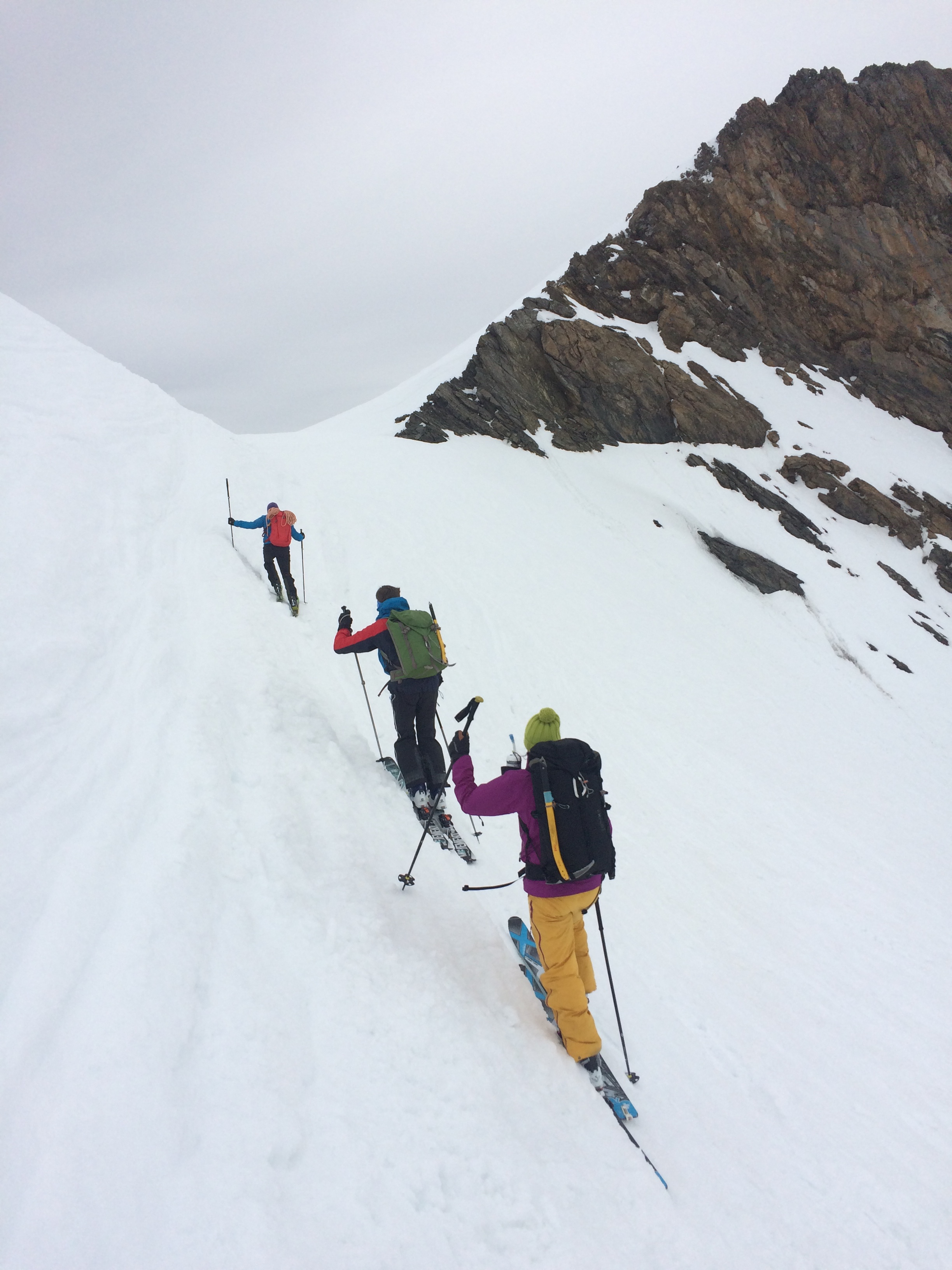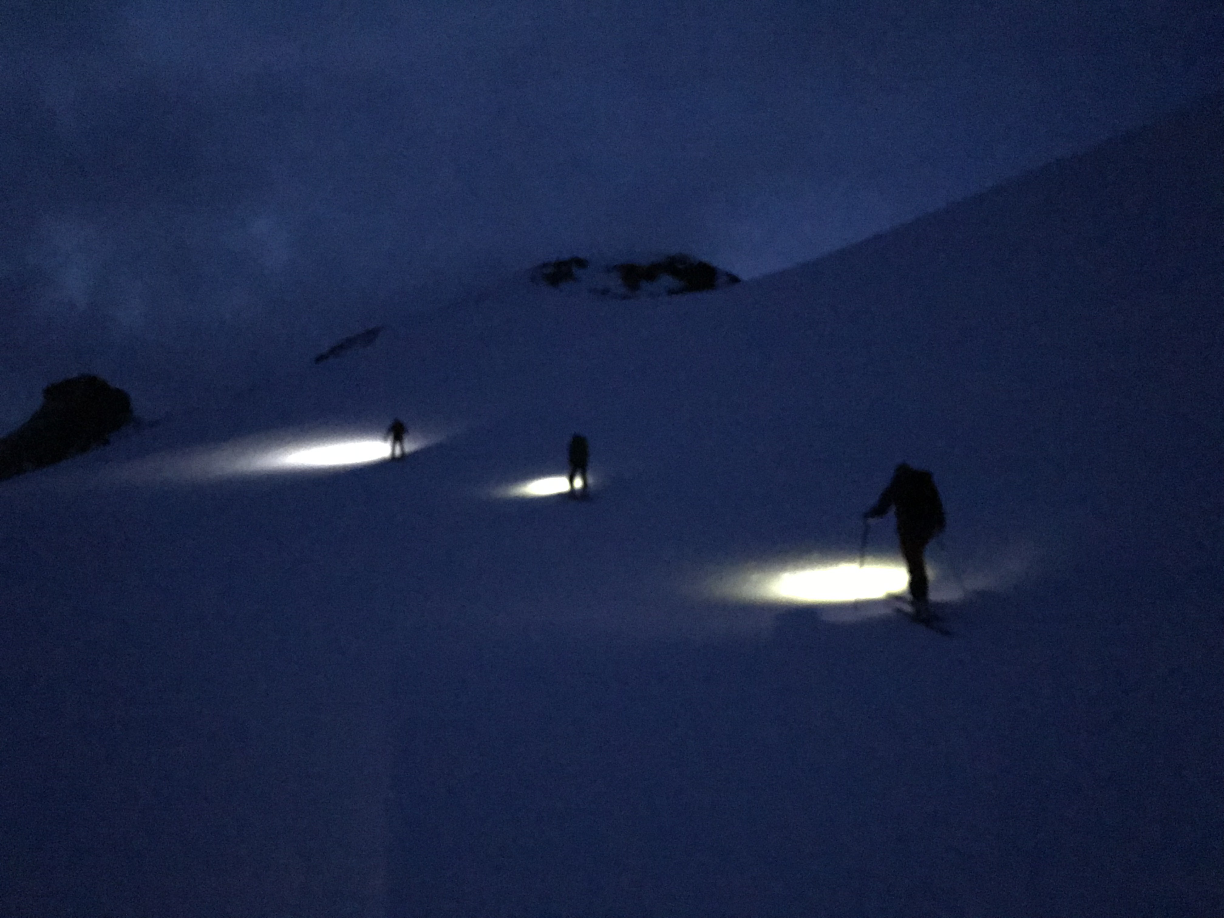 Cette année, on est confiant et on pense que l’on va enfin conjurer le mauvais sort. Stefano a commandé le télécabine d’Urnerboden à 6h30. A 2h30 du matin nous quittons Bex, traversons toute la Suisse dans le calme et sans trafic. On est trop fiers d’arriver à l’heure au rendez-vous, mais une fois arrivé au sommet de la télécabine, Pål se rend compte qu’il a oublié son DVA dans la voiture. Donc il a gagné le droit de refaire un aller-retour exprès en télé…. Notre plan pour le premier jour est de rejoindre la Fridolinshütte, mais après un départ sous le soleil, on se fait prendre méchamment par la tempête. Foehn en rafale, neige, visibilité limitée à quelques mètres. Stefano arrive à trouver son chemin dans cette purée de pois, même si pour lui s’était mission impossible pour voir les mouvements de terrain, il s’en est sorti comme un chef. On rejoint tant bien que mal la cabane de Clariden et on décide de s’arrêter là pour cette journée.