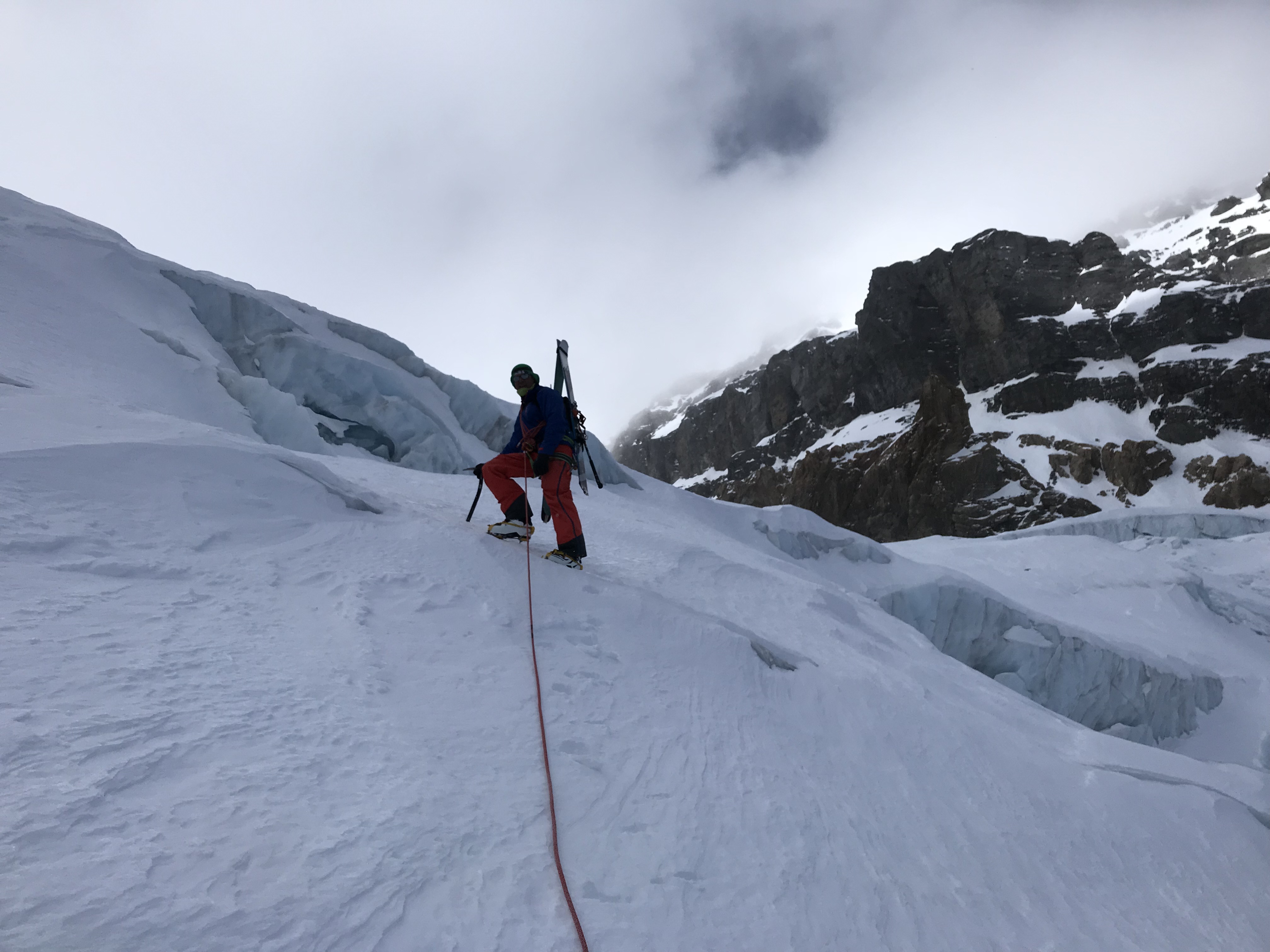 Du coup le lendemain, on part le plus tôt possible car on sait que la journée va être longue, si on veut rattraper le temps « perdu ». Le Tödi à la journée depuis Clariden, il semble que cela ne se fasse pas trop. Il nous faut déjà près de 3 heure pour rejoindre la cabane Fridolin où nous laissons un peu de matos avant de continuer notre chemin. Claudia et Stefano décident de faire demi-tour dans la montée de la première barre de sérac. Avec Pål, on décide de continuer pour voir ce que ça donne et en espérant que le plafond s’ouvre bientôt. Il faut dire que la voie normal du Tödi est en excellentes conditions cette année, le glacier est vraiment bien bouché et les meilleures font tout à ski. Nous on a quand même mis les crampons pour passer la fin de la deuxième barre du glacier (mais c’était surtout pour se dire qu’on ne les avait pas porté pour rien !!) Finalement vers 2850m, on sonne le rappel des troupes. Le vent est de plus en plus fort et la visibilité de plus en plus mauvaise. Le Tödi attendra.