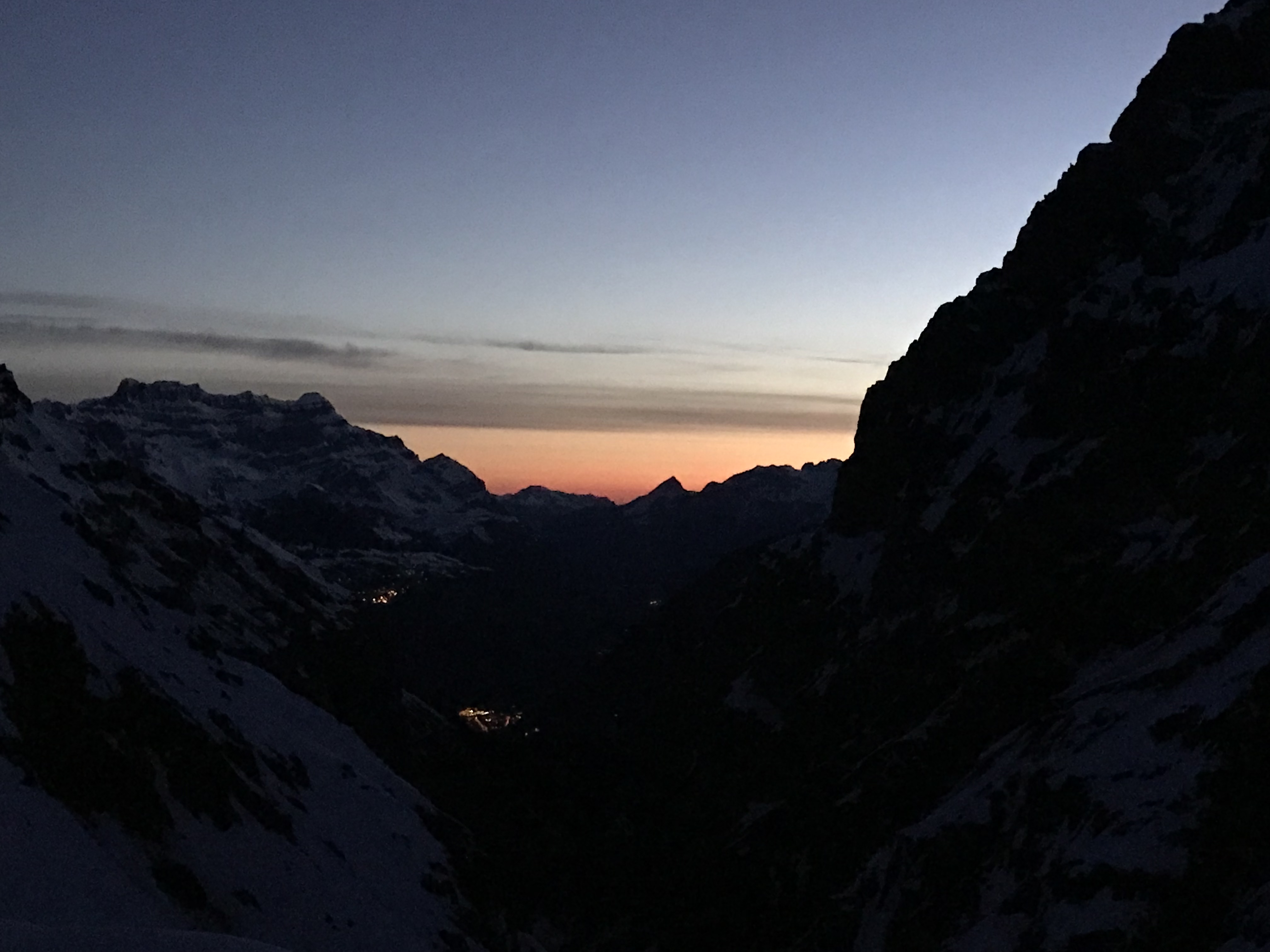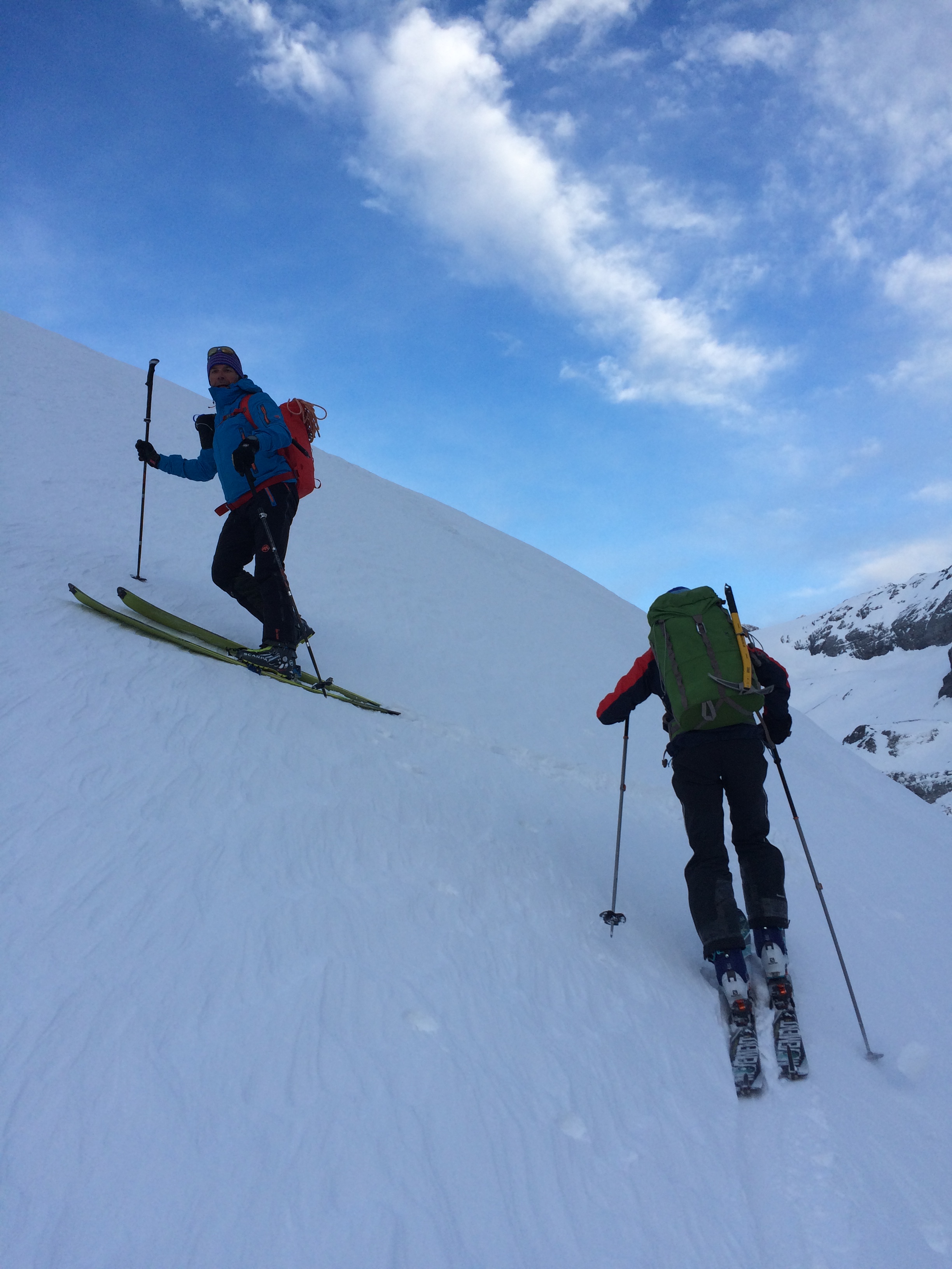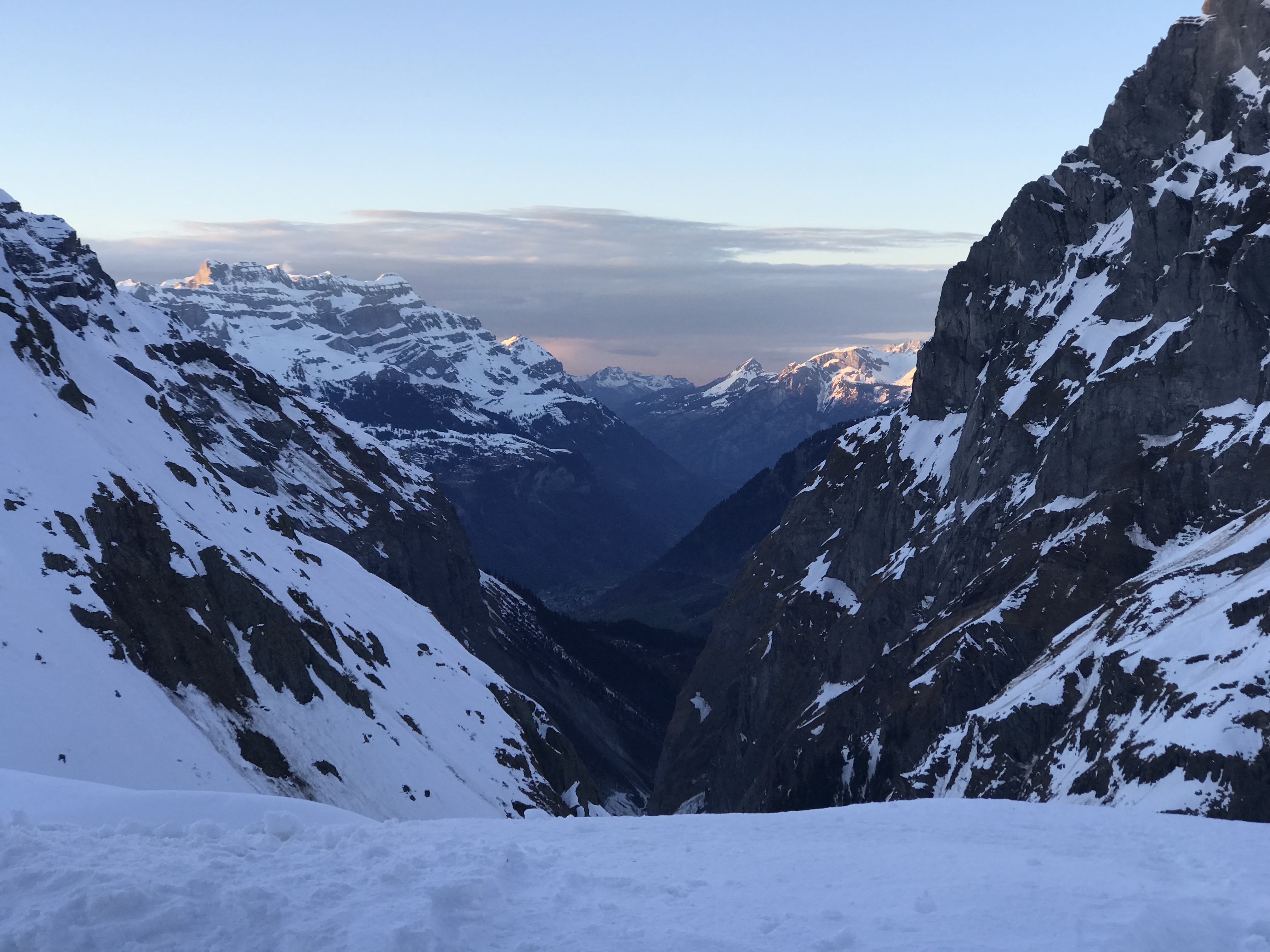 Le samedi, après une foire d’empoigne mémorable pour sortir de cette minuscule cabane (56 personnes qui mettent leur baudrier et leurs chaussures de ski dans 6m2 au même moment, ça met l’ambiance) on se fait accueillir par un levé de soleil de toute beauté. Tout le monde part au Tödi et on se retrouve seuls en sens inverse. La traversée pour rejoindre la voie normale de la cabane Planura est rock’n roll, mais ça passe pas trop mal. Ensuite une longue et belle montée jusqu’à la cabane, Claudia et Stefano s’arrêtent pour boire un café et Pål et moi continuons jusqu’au sommet du Clariden. La montée est dans l’ensemble facile, seules les quelques dernières conversions au dessus d’une barre de rochers demandent un peu d’attention. Puis il suffit de se laisser glisser jusqu’à la terrasse de la cabane !