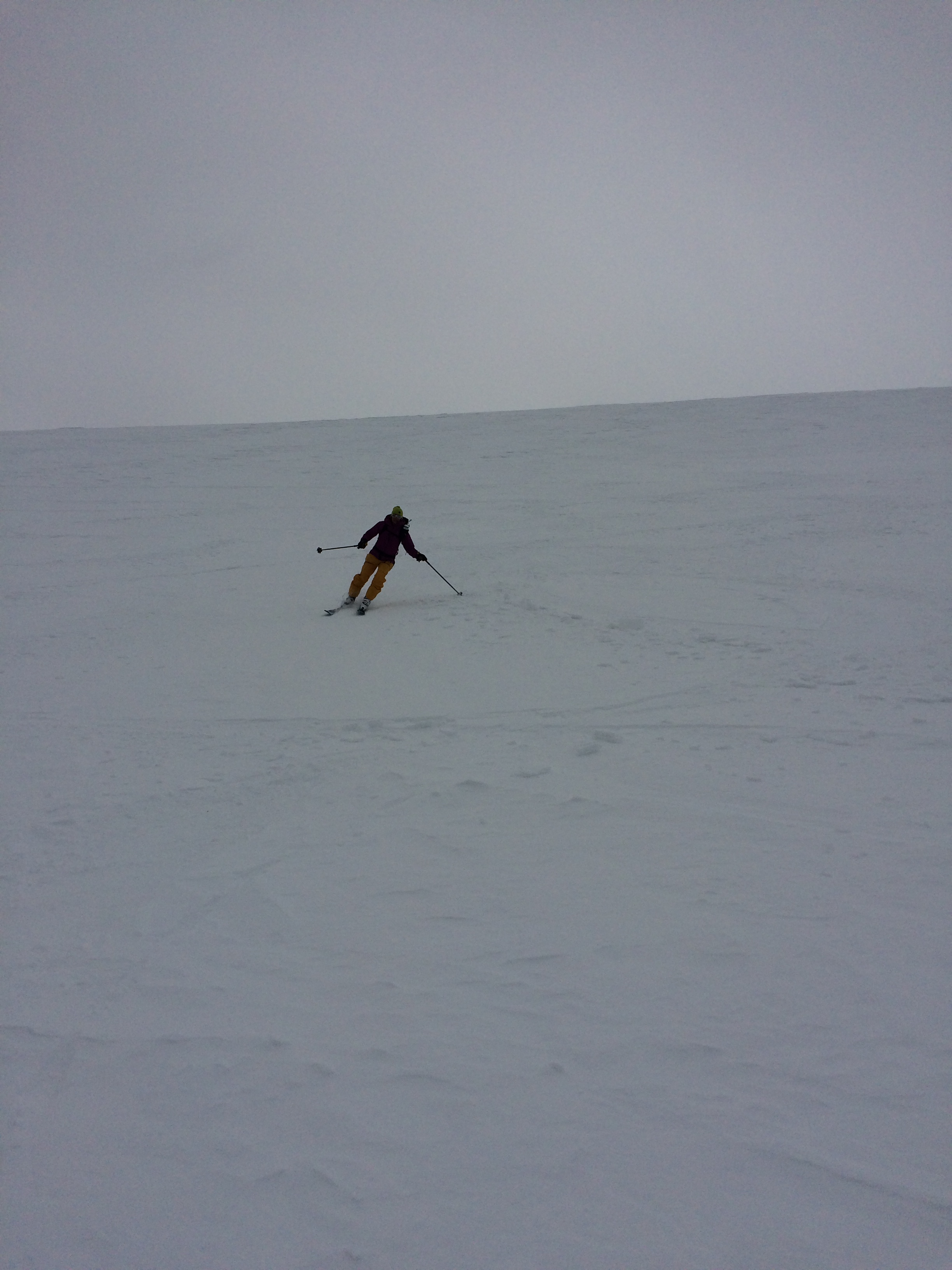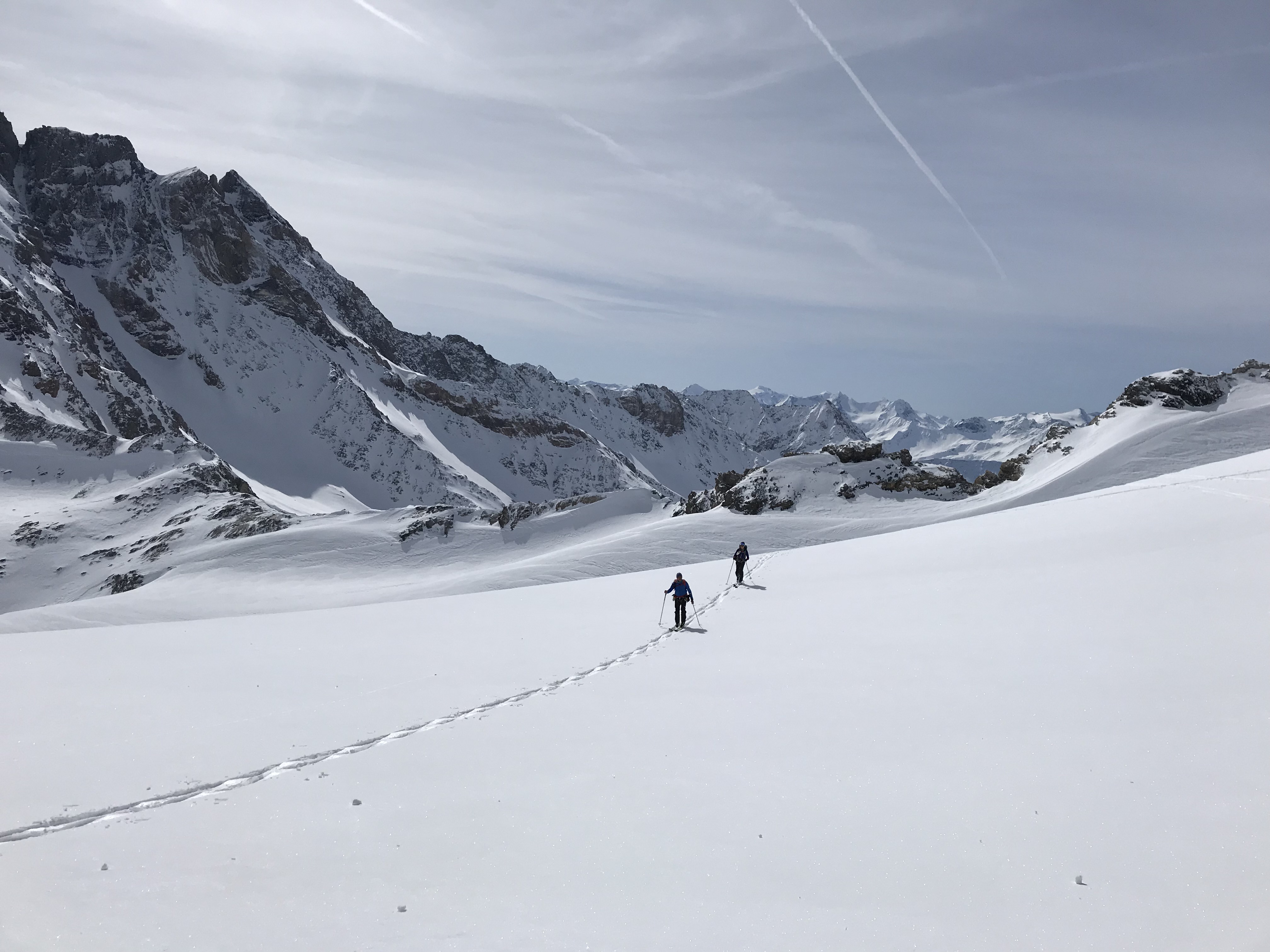 Grasse mat pour notre dernière journée ! Départ vers 8h00 sous un ciel couvert mais sans vent et avec une visibilité tout à fait correcte. On monte tranquillement jusqu’au Gemsfairenstock, Stefano comme à son habitude nous trouve la trace la plus sure et la plus confortable. Et il ne nous reste plus qu’à nous laisser descendre jusqu’au télé d’Urnerboden. La traversée passe beaucoup plus vite dans ce sens !