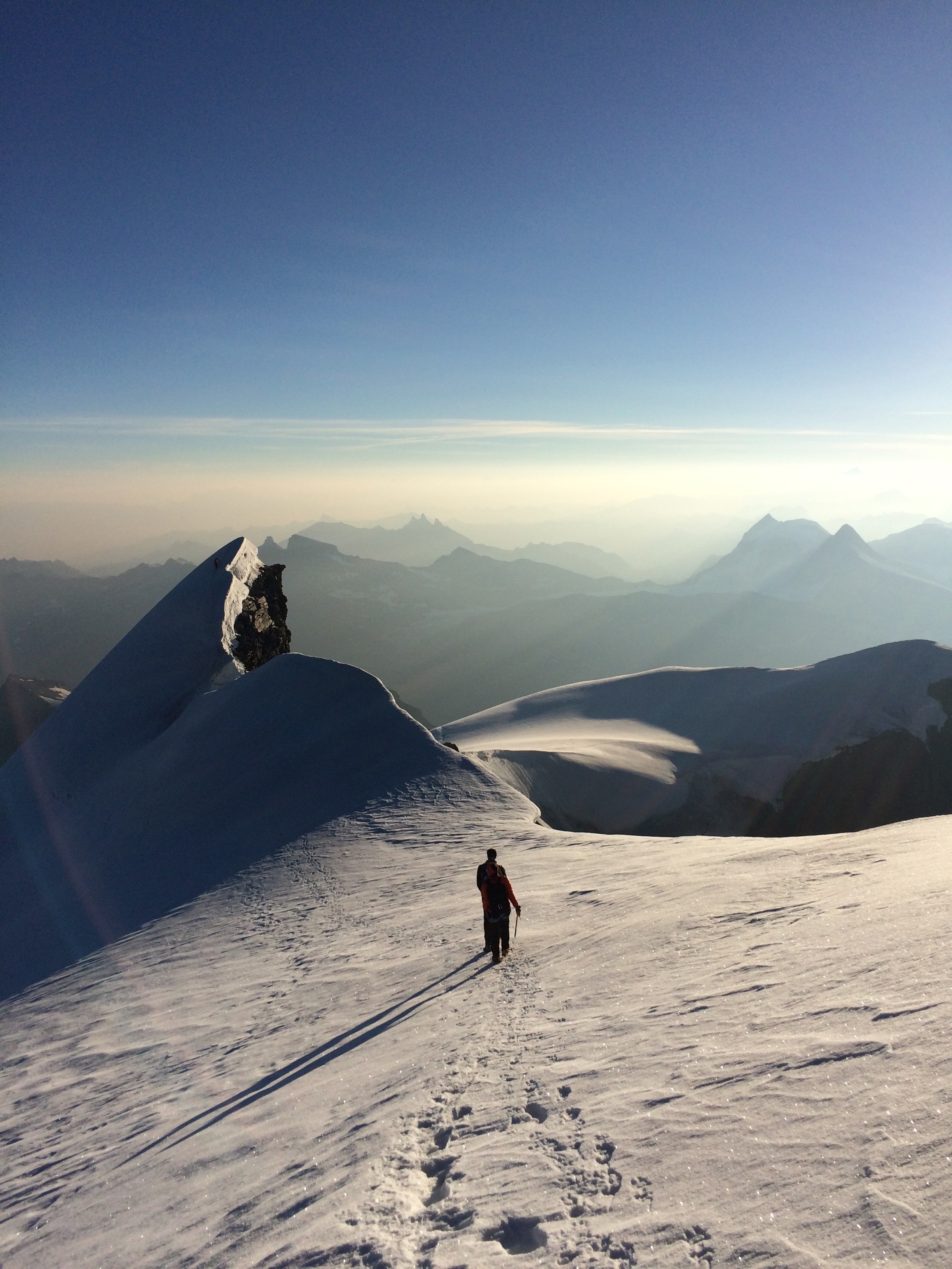 On commence l’escalade sur l’arête. Il n’y a qu’un pas un peu physique qui me pose quelques soucis, le reste est vraiment chouette. Les passages grimpant sont en super rocher. On arrive au sommet du Combin de Valsorey juste au levé du jour, c’est splendide. On chausse les crampons et on se dirige vers le sommet principal du massif, le Combin de Grafeneire à 4314 mètres. Il est 6h50 quand nous arrivons au sommet, le soleil est tout juste levé. C’est bô, mais d’un bô !