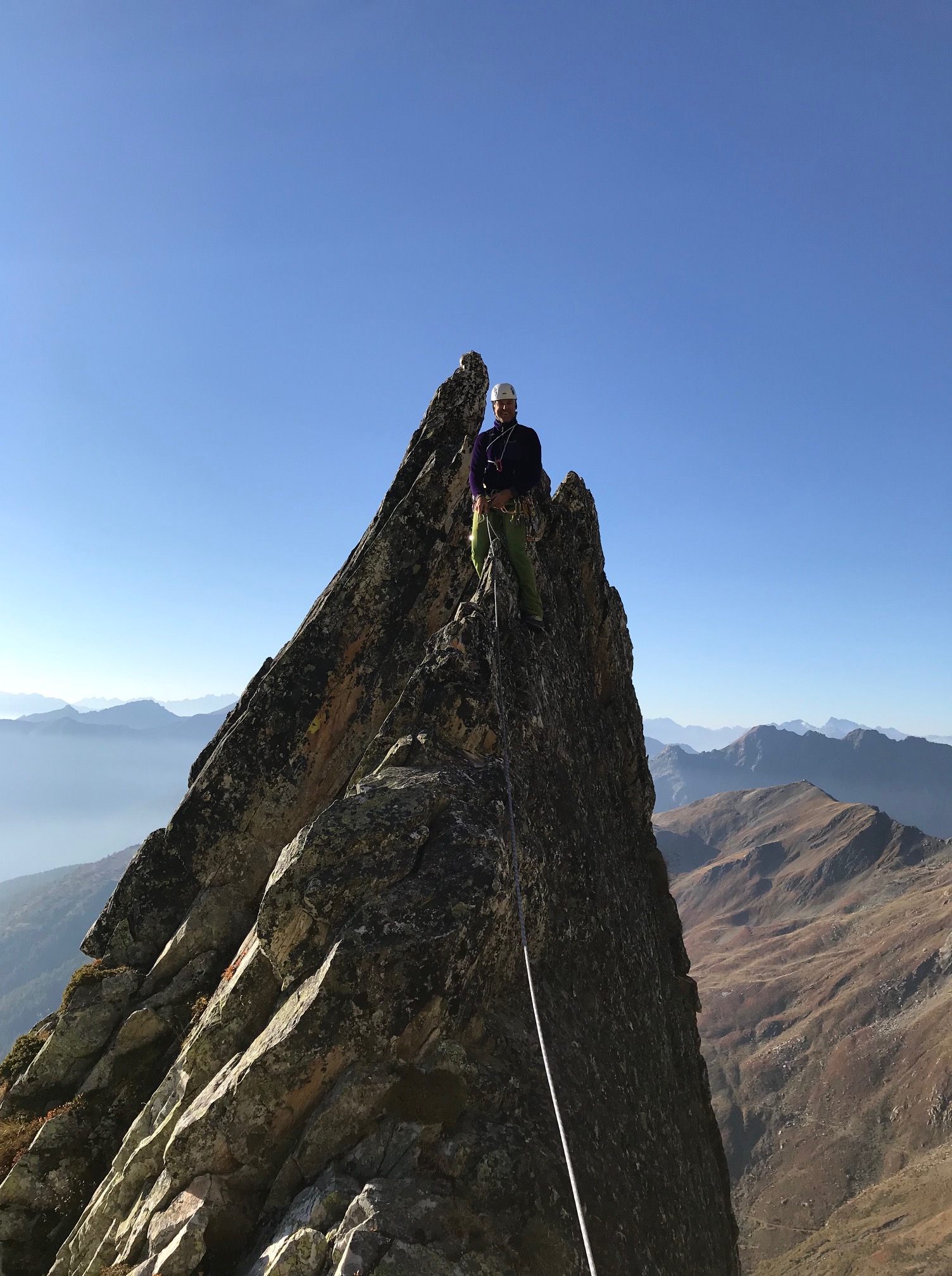 On arrive déjà au pied du bastion sommital, ça a l’air très chouette. Effectivement, les deux premières longueurs sont géniales, mais j’appréhende la dernière. Sur le papier rien de méchant, mais grâce à ma copine Elise, je sais qu’il y a une brèche à enjamber et j’ai horreur de ça. En fait ça fait depuis le début de la journée que je pense à cette dernière longueur. Pål part en tête et me fait le commentaire en direct: « c’est facile, tu mets ta mains là, ton pied là (Son pied, il l’a mis à 3m50 de là, facile avec ses échasses) et pis tu pivotes » Ouai c’est ça mon bonhomme, tu vas voir comme je vais pivoter ! Pål n’arrive pas à retenir des exclamations de bonheur, pour lui c’est la plus belle longueur du monde et le plus beau rasoir qui existe dans toutes les alpes. « t’as fait une photo ? Tiens, fait une photo là, c’est trop beau ! » Bon heureusement il arrive au sommet, fait un relai et calme sa joie !
