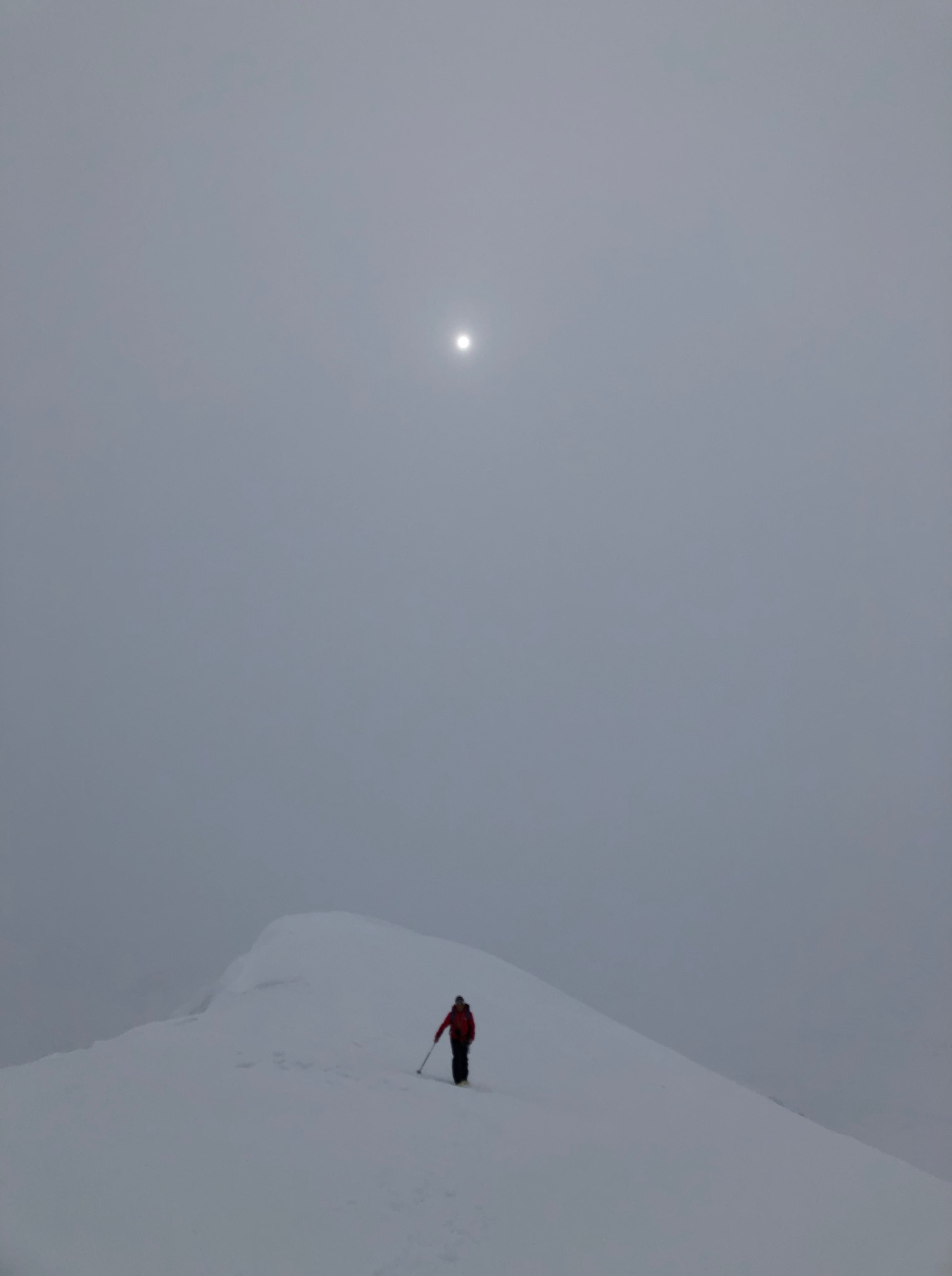 Le temps est couvert, mais il ne fait pas froid du tout. J’ai de la peine à respirer, je ralenti tout le monde, c’était quand même bien égoïste de ma part de venir, mais mes coéquipiers sont choux et m’encouragent à chaque pas. Sous le sommet, c’est vraiment le whiteout complet, je fixe l’arrière des skis de Manu pour ne pas avoir trop mal au coeur, mais on est tous bien contents d’arriver au sommet du Lars Hiertafjellet à 878m. Nos guidos sont super motivés pour aller faire un deuxième sommet, mais les clients pas trop. Ils tentent bien une négociation, mais l’appel de la mousse au Svalbar est finalement plus fort !