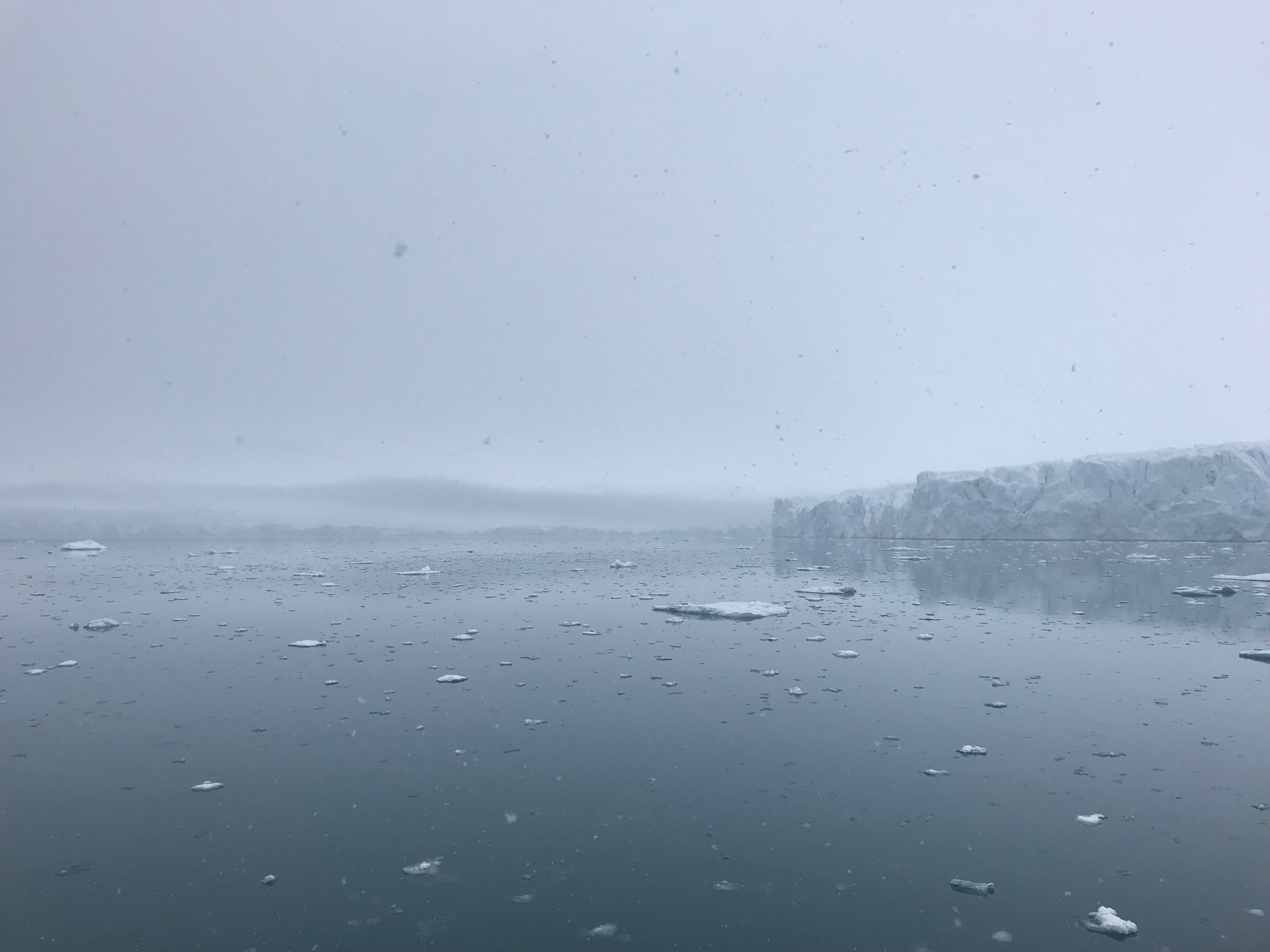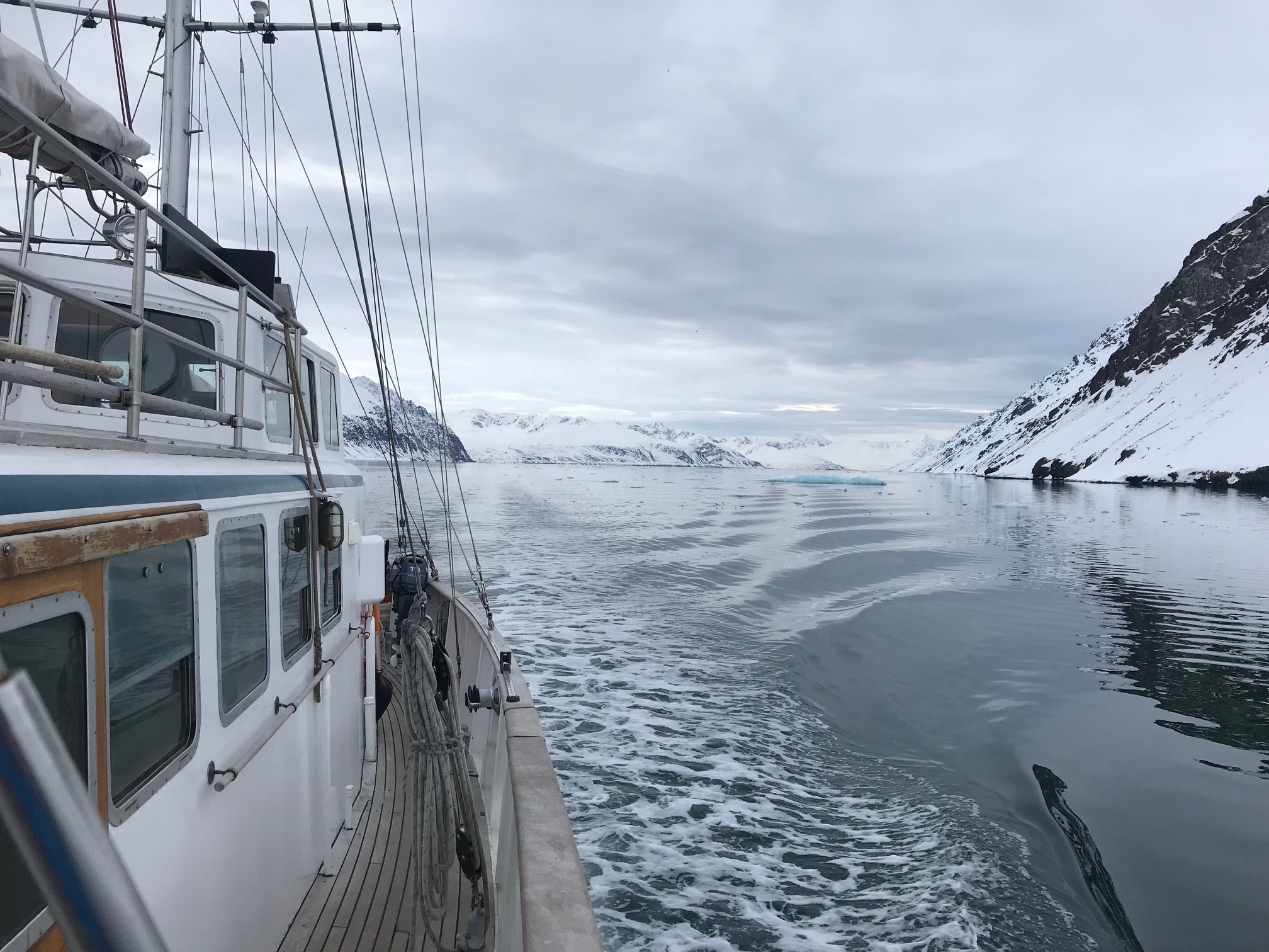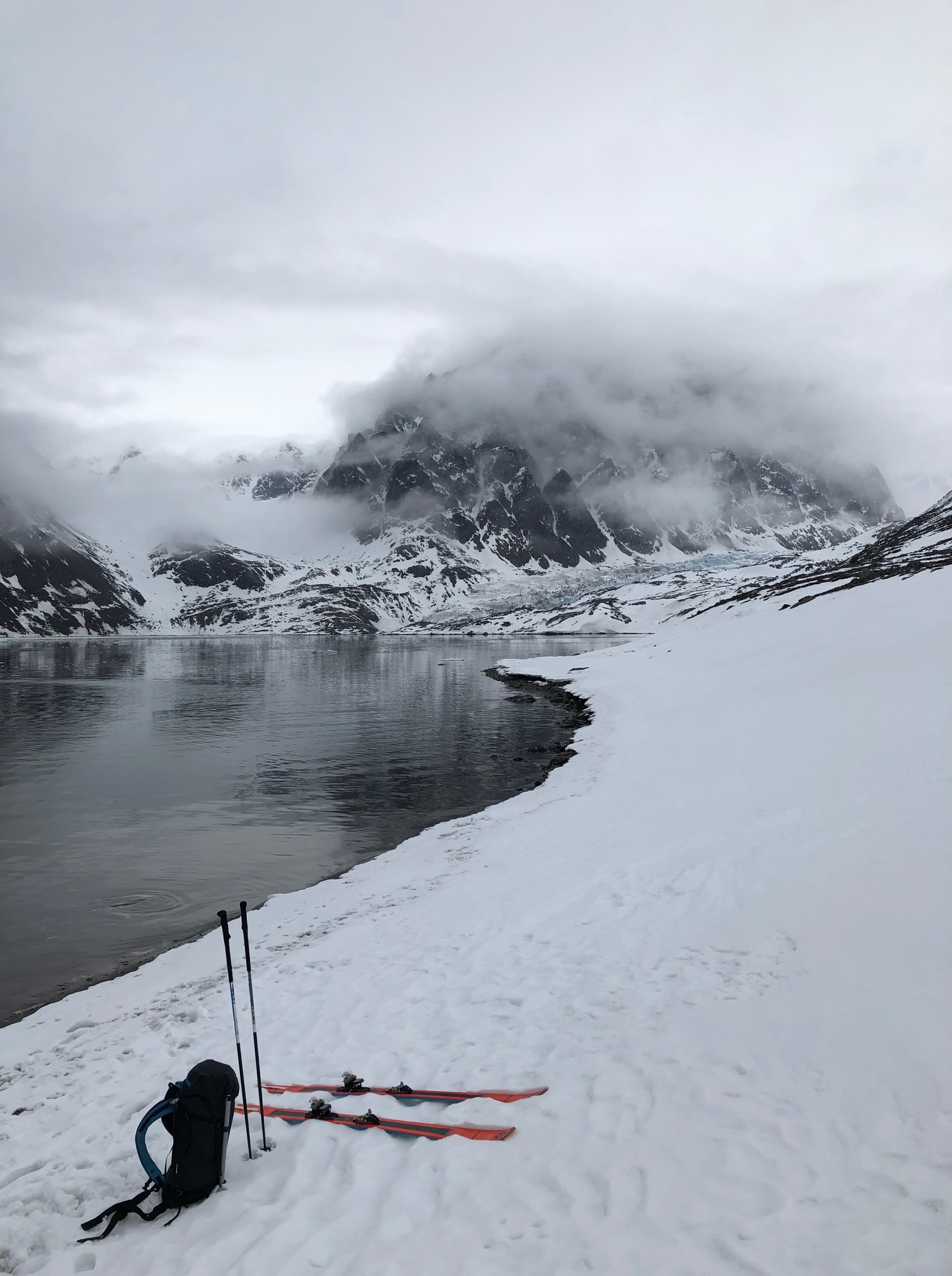 Donc place au ski ! Manu et Raoul sont débarqués en premier, le trajet en annexe est sportif, mais Jonathan fait tout pour que nous arrivions à terre plus ou moins secs. Il y a pas mal de vent, mais la visibilité est encore bonne. Je mets toutes mes couches. Le début est assez plat, puis la pente se raidit gentiment. Le sommet du jour s’appelle Daudmannen et culmine à 768m. Le temps se gâte de plus en plus, le vent forcit et la visibilité se réduit. Raoul nous demande de mettre nos masques de ski et nous poursuivons. Je me demande ce que je suis venue faire là, Pål est super content et trouve « qu’il se sent vivant ». Tant mieux pour lui ! Finalement on arrive au sommet et on détale sans demander notre reste. En remontant à bord de la Lady on apprend que l’équipage a vu un ours sur la rive durant notre excursion. Je ne sais pas si je suis déçue ou soulagée de ne pas l’avoir vu, probablement un peu des deux.