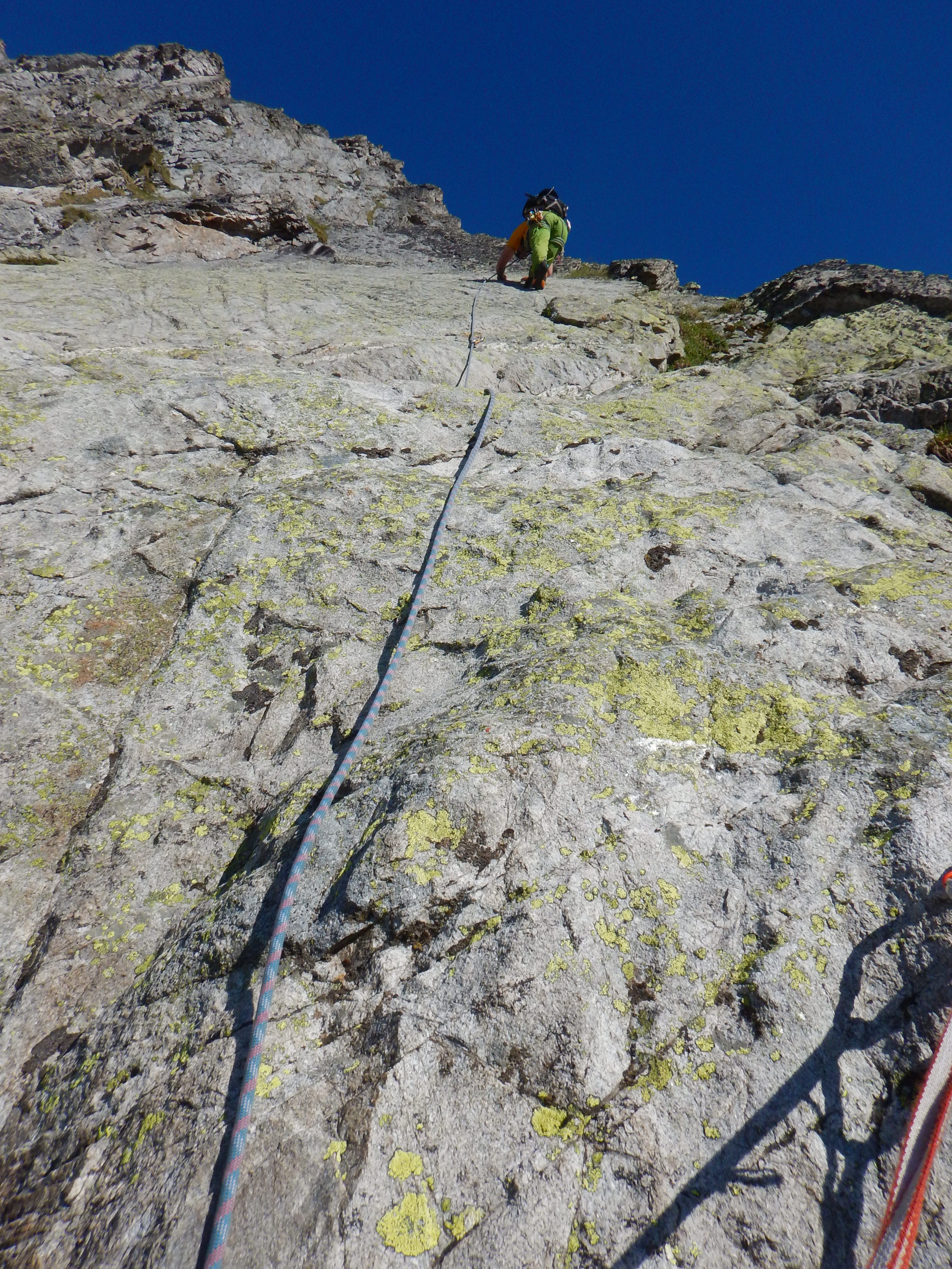 Pål part dans la 1ère longueur, on a mis les chaussons pour les deux premières longueurs et en ce qui me concerne, c’est pas du luxe. La suite est plus facile et passe super bien en grosses. L’escalade est géniale, le rocher solide et franc, l’équipement béton. J’ai un monstre plaisir.