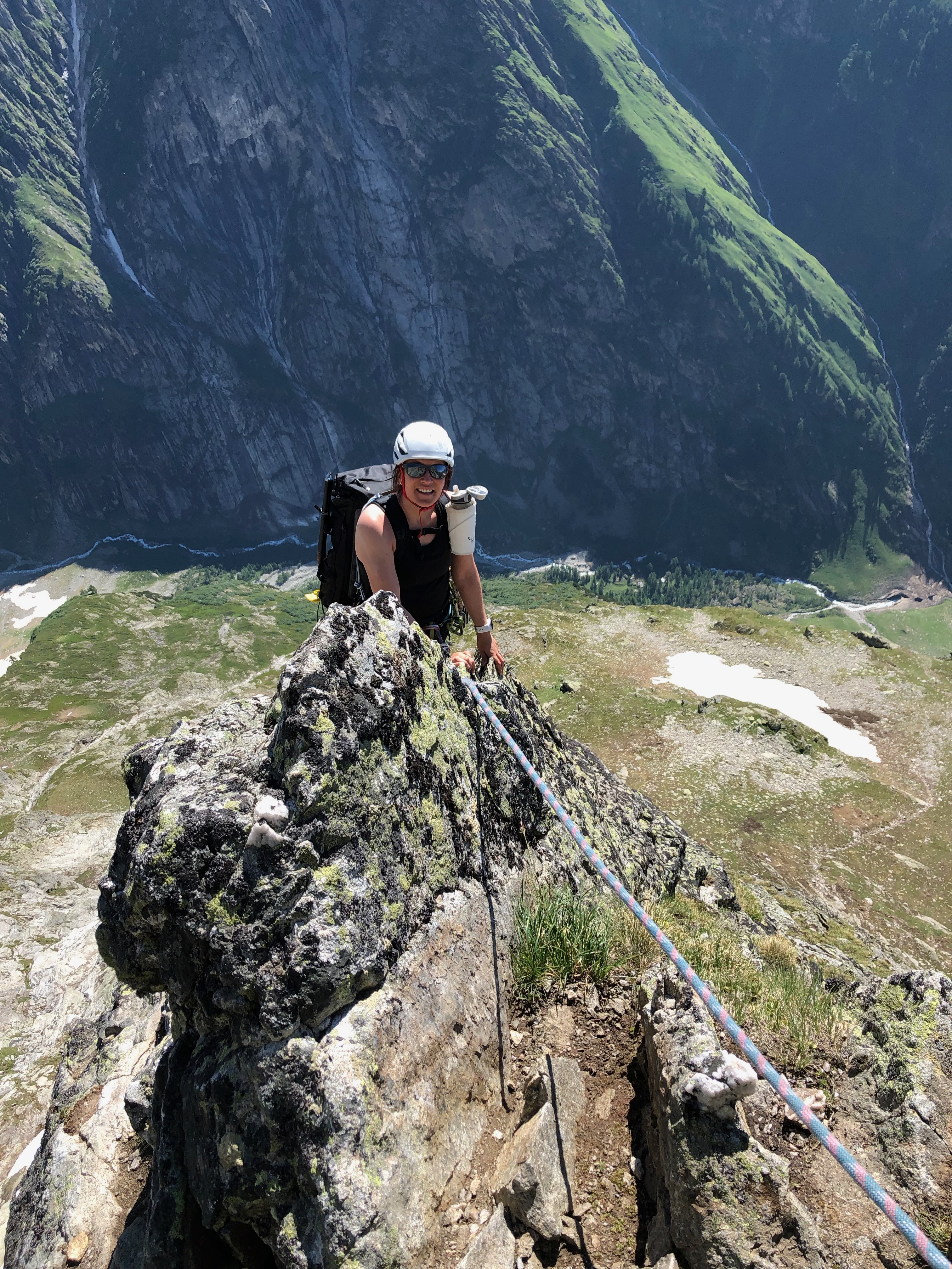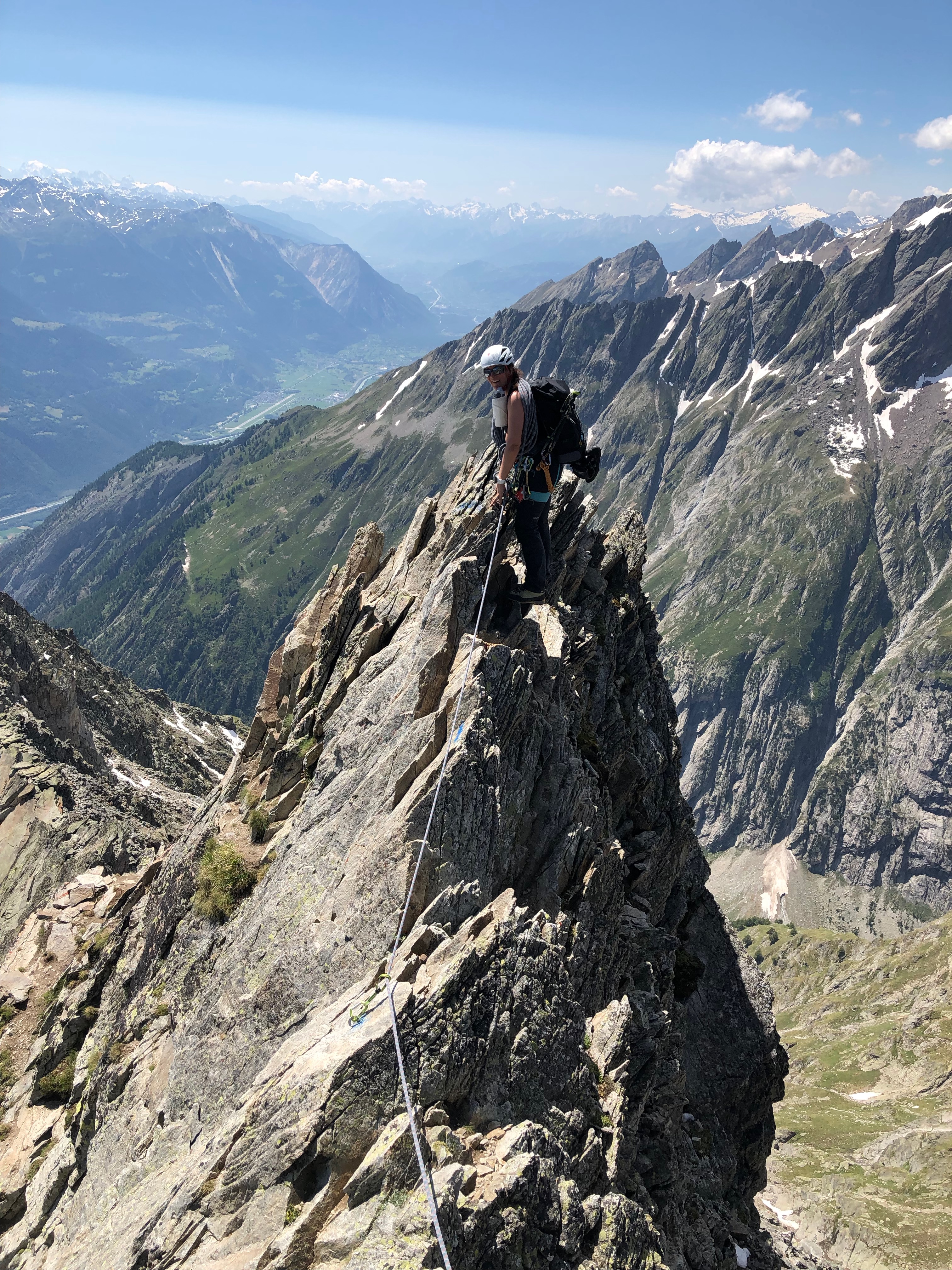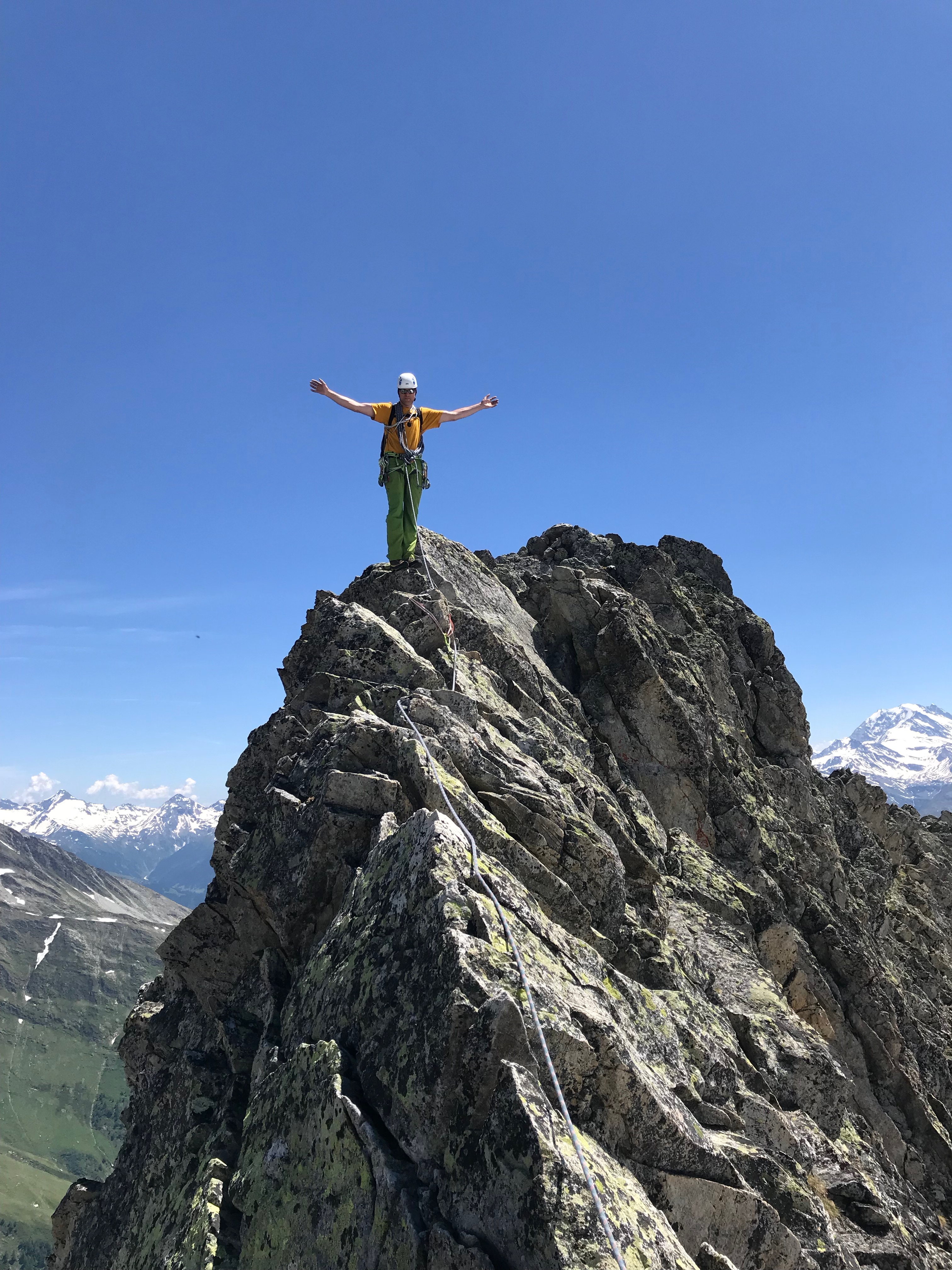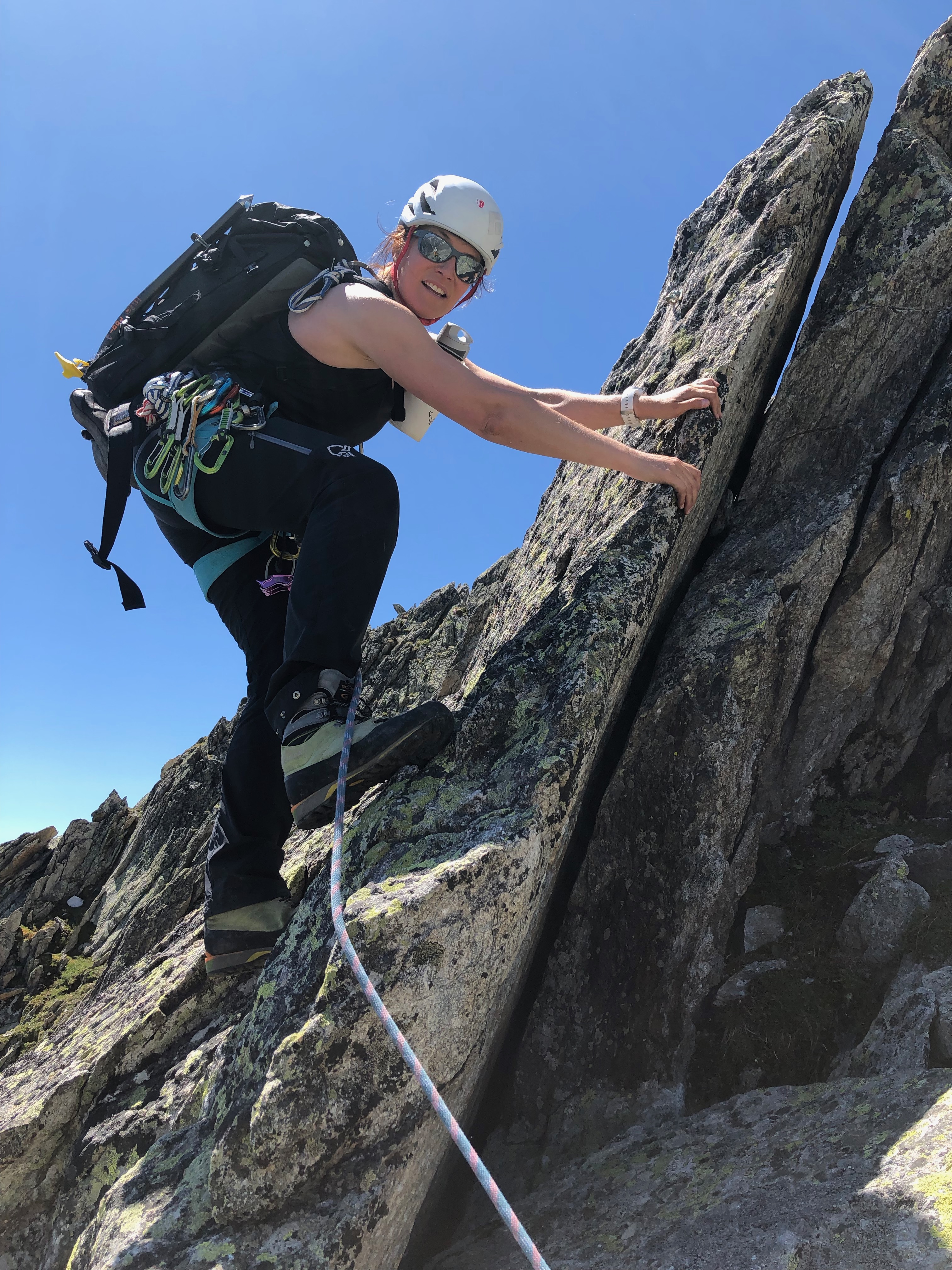 Ah oui quand même. C’est une belle et longue arête qui mêne d’abord au sommet, puis le long de l’arête W jusqu’aux rappels. On fait une bonne pause au sommet, il est quand même 14h et le petit déj est déjà loin.