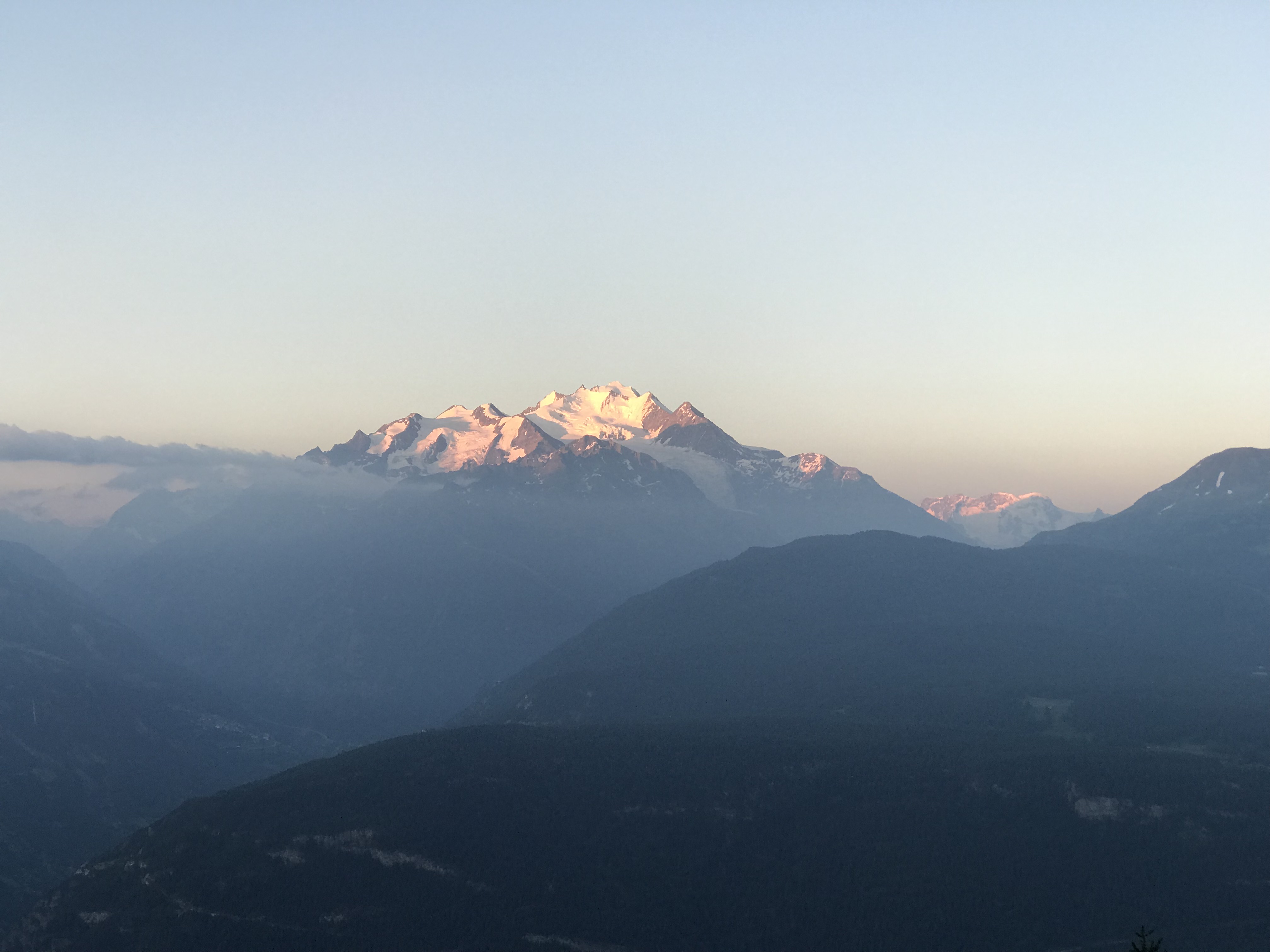 On quitte le parking de Fuxtritt vers 5h30 et admirant le levé de soleil sur le Dôme. La montée jusqu’à la cabane est efficace et on continue directement jusqu’au pied de la voie. Il y a encore passablement de névés bien raides à traverser, on est bien contents d’avoir pris les piolets.