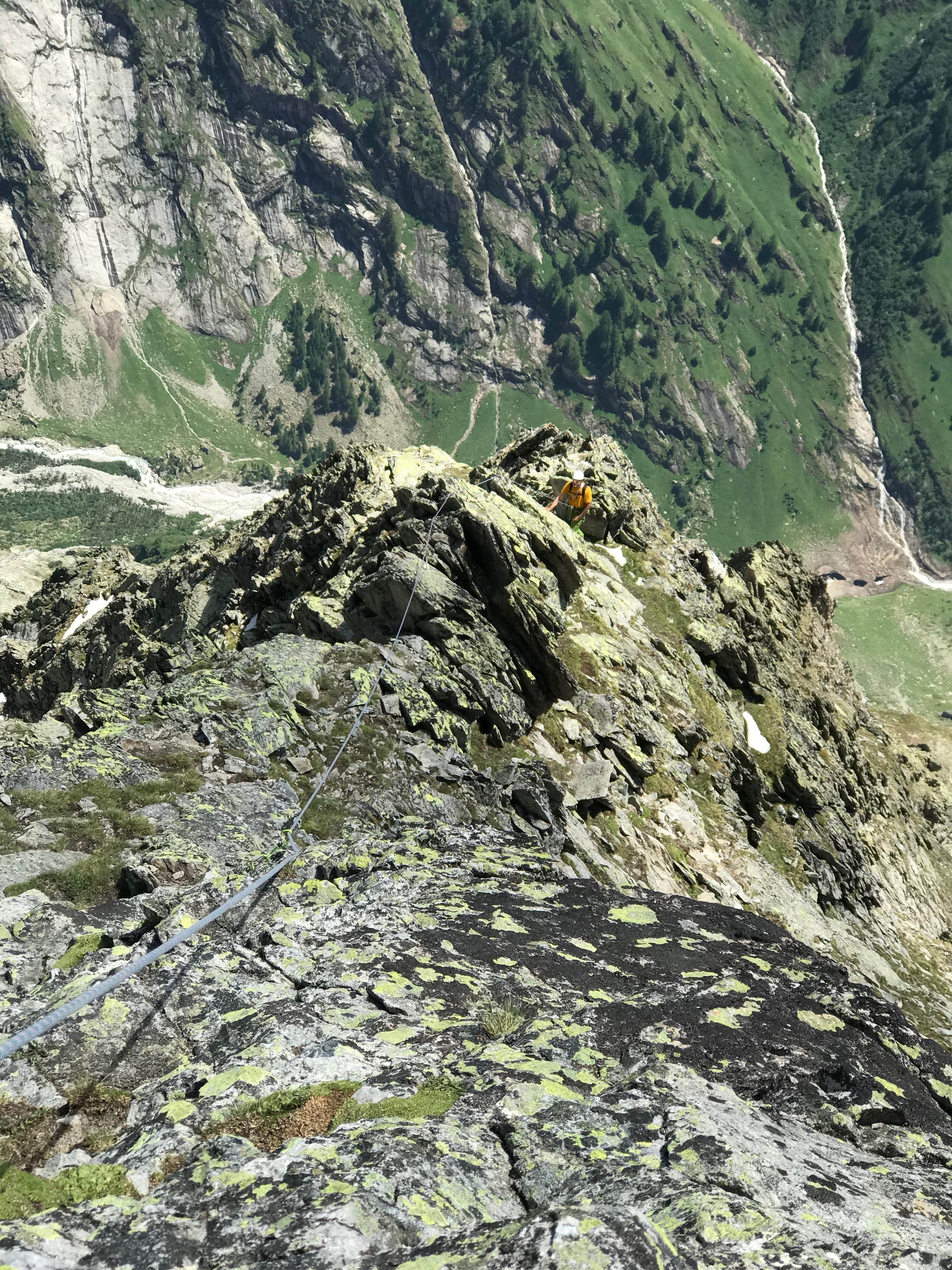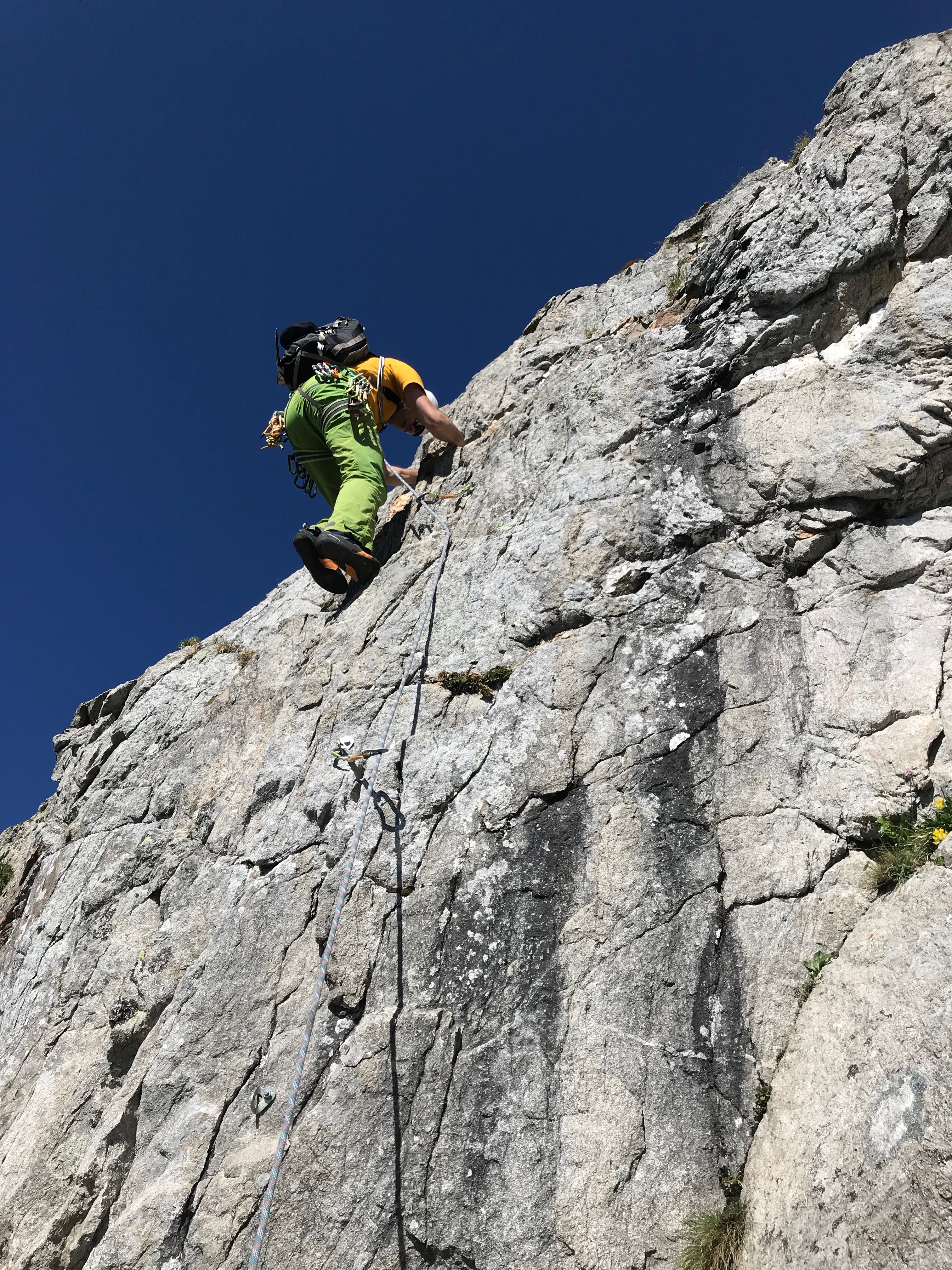 La descente de l’arête est bien gazeuse, il y a de très beaux passages. Mais avec mon agilité dans ce genre d’exercice forcément, ça prend du temps. Là encore par contre, le balisage bleu et les quelques spits sont placés judicieusement toujours là où il faut pour rassurer. On arrive au relais pour le premier des deux rappels. Le deuxième rappel nous dépose au sommet d’un névé très raide. Une fois en bas du névé, c’est course gagnée ! On peut se rutscher de bonheur sur les névés suivants et rejoindre la jolie cabane de Wiwanni pour un Schorle et une tarte aux abricots.