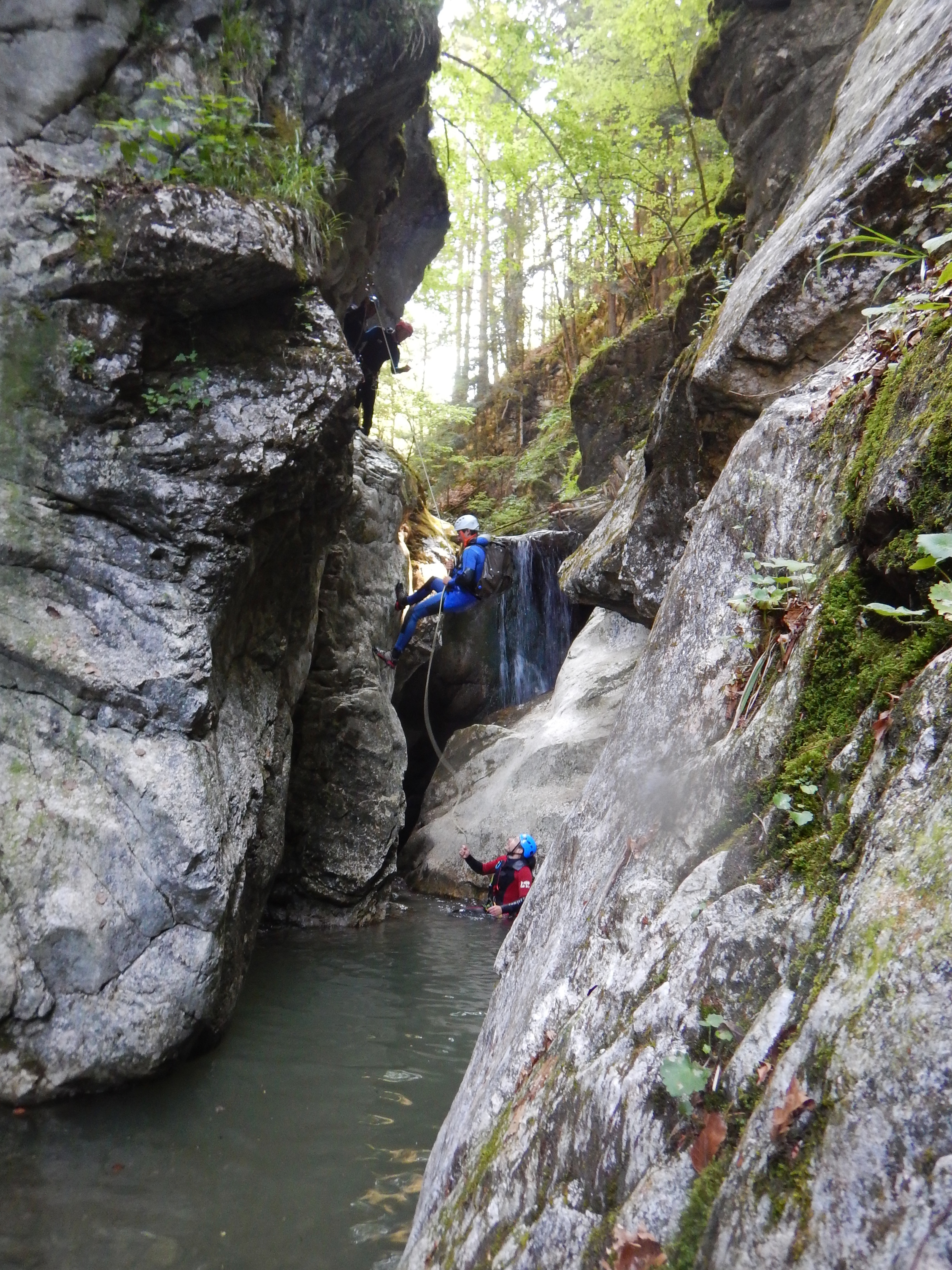On commence par une bonne grimpette dans la forêt, idéale pour se (ré)chauffer. On s’équipe au bord de l’eau, le coin est vraiment génial. Notre premier contact avec l’eau achève de nous réveiller. OK elle n’est pas méga froide….. mais pas bien chaude quand même ! Après discussion, le consensus se situe autour des 11 à 12°.