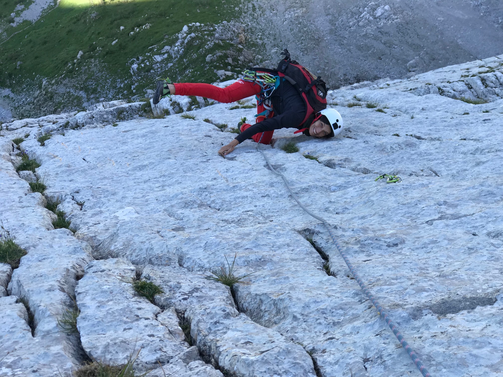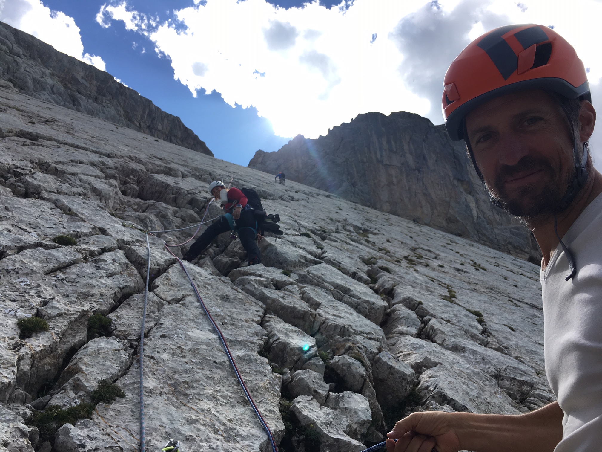 Vincent, qui fait de l’escalade pour la première fois de sa vie, m’impressionne. Après deux longueurs de chauffe, il est super stable sur ses appuis et grimpe bien sur les pieds dans ses chaussons tout neufs. Marie se balade et fait le pitre. C’est vraiment cool de grimper avec des photographes naturalistes, parce qu’ils passent leur temps à te montrer des trucs que tu ne verrais jamais sinon : des insectes, des campanules, des nuages, des souris, des faucons pèlerins, des ombres…. Si bien que tu ne vois pas le temps passer et que les 14 longueurs passent super vite.