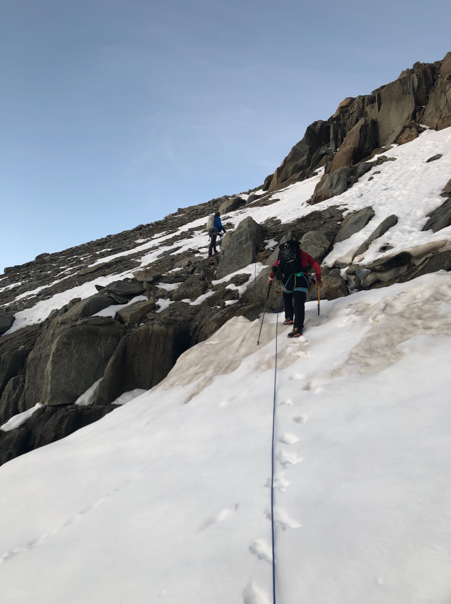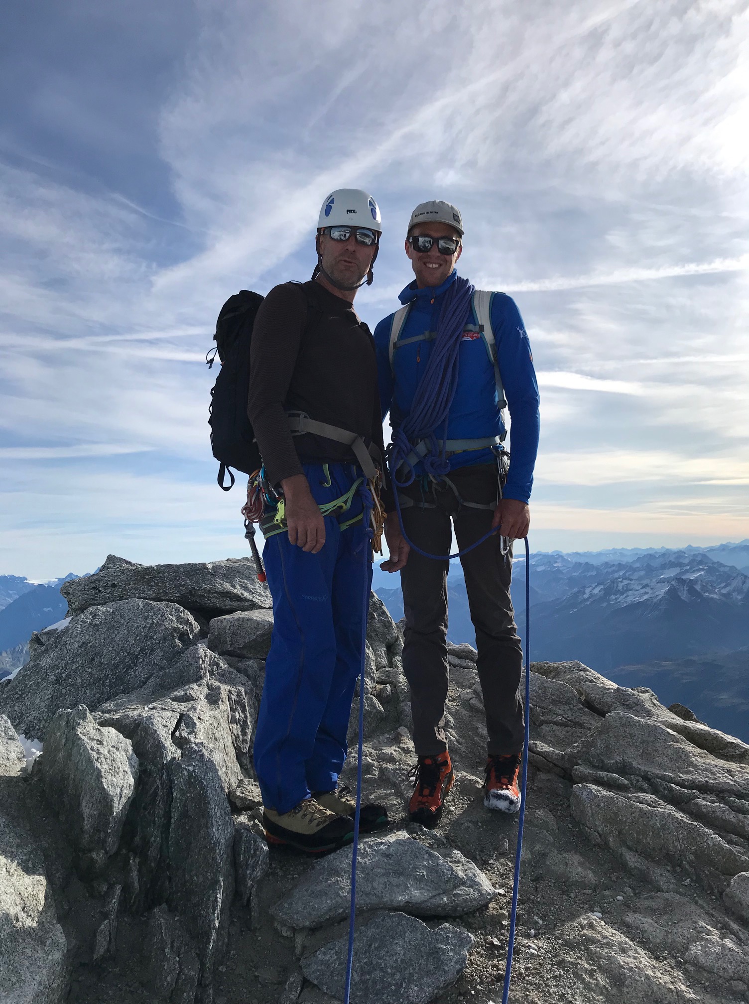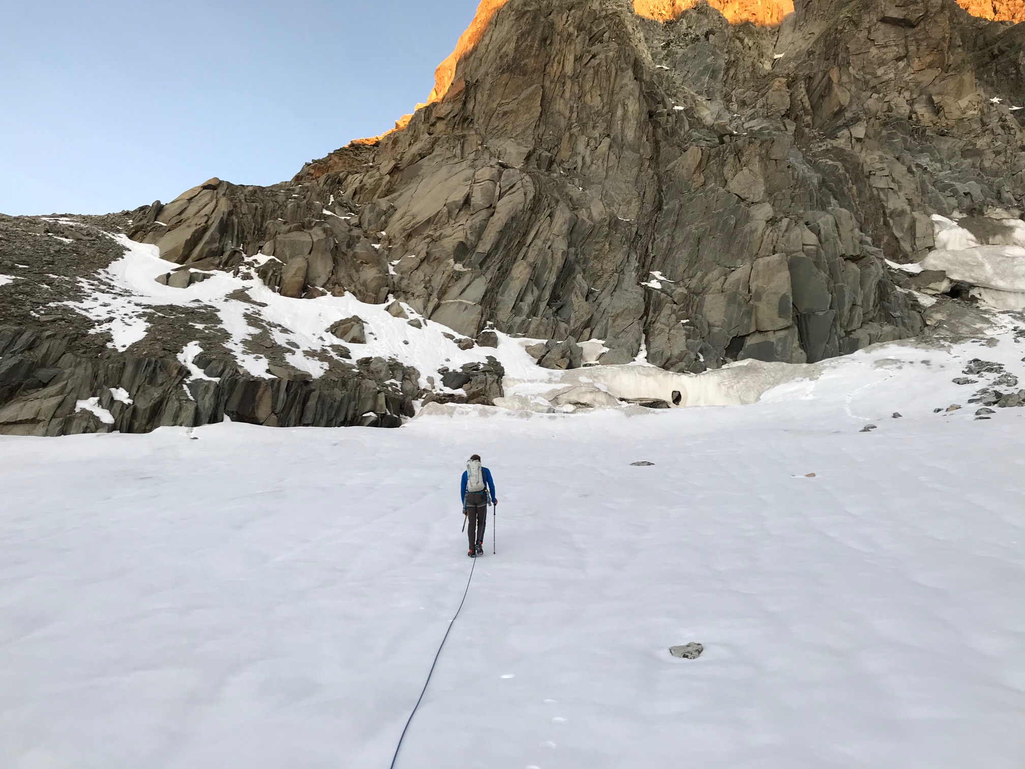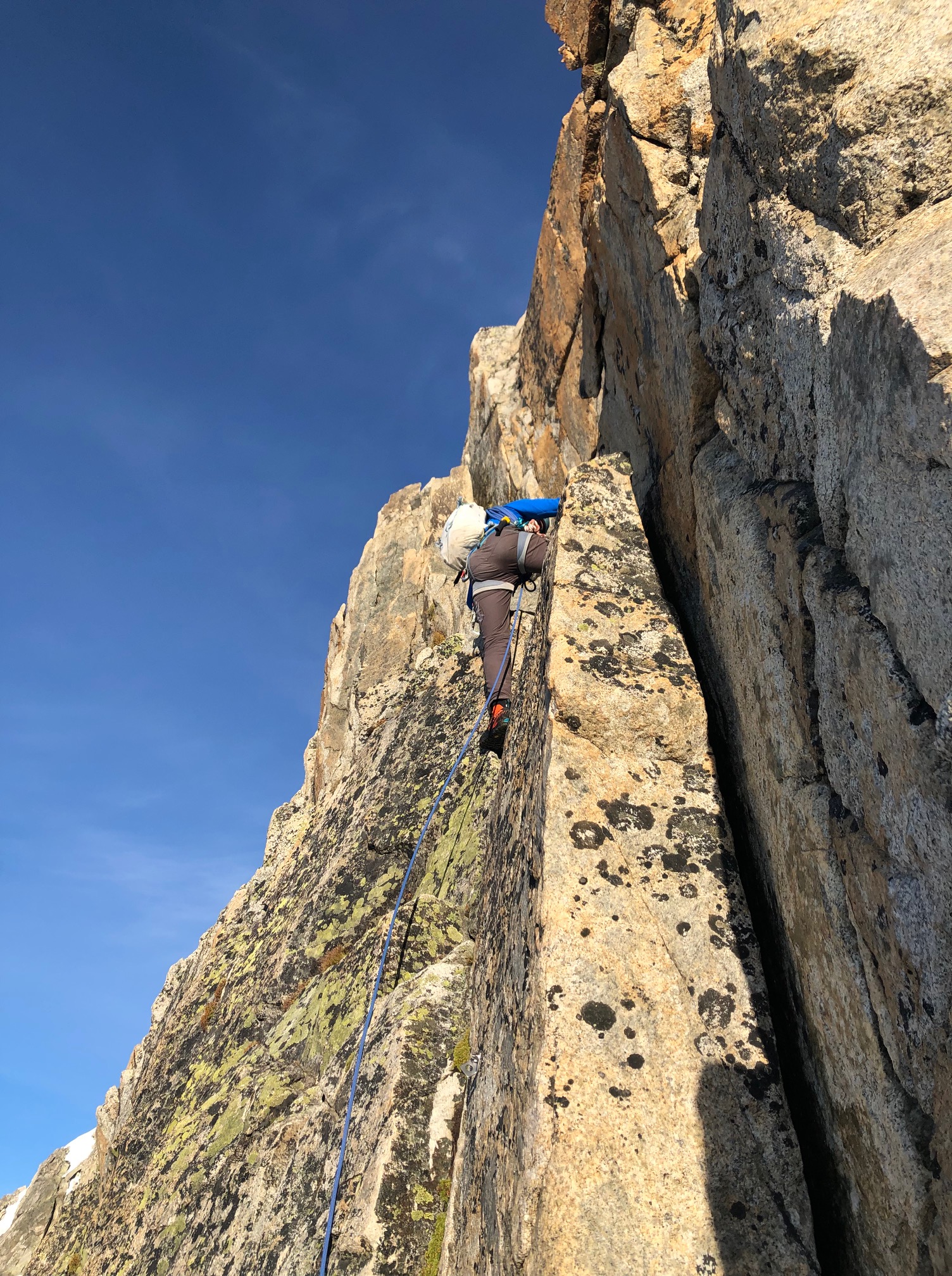 Petit-déj 5h30, nous quittons la cabane dans le noir. Manu prend son pas magique, je suis paisiblement en appréciant le moment. On arrive rapidement sur le glacier. Grâce à la neige tombée quelques jours avant, pas besoin de crampons, ça avance tout seul. La rimaye passe sans problème, quelques mètres dans de la chaille et on attaque le beau rocher ! Par rapport aux Salbit ça randonne, quel bonheur ! On est des gros fainéants et on apprécie vraiment de suivre la corde sans avoir à se poser la question de l’itinéraire ou de l’assurage, franchement des fois, ça fait du bien ! On ne met que 2h30 depuis la cabane jusqu’au sommet du pilier.