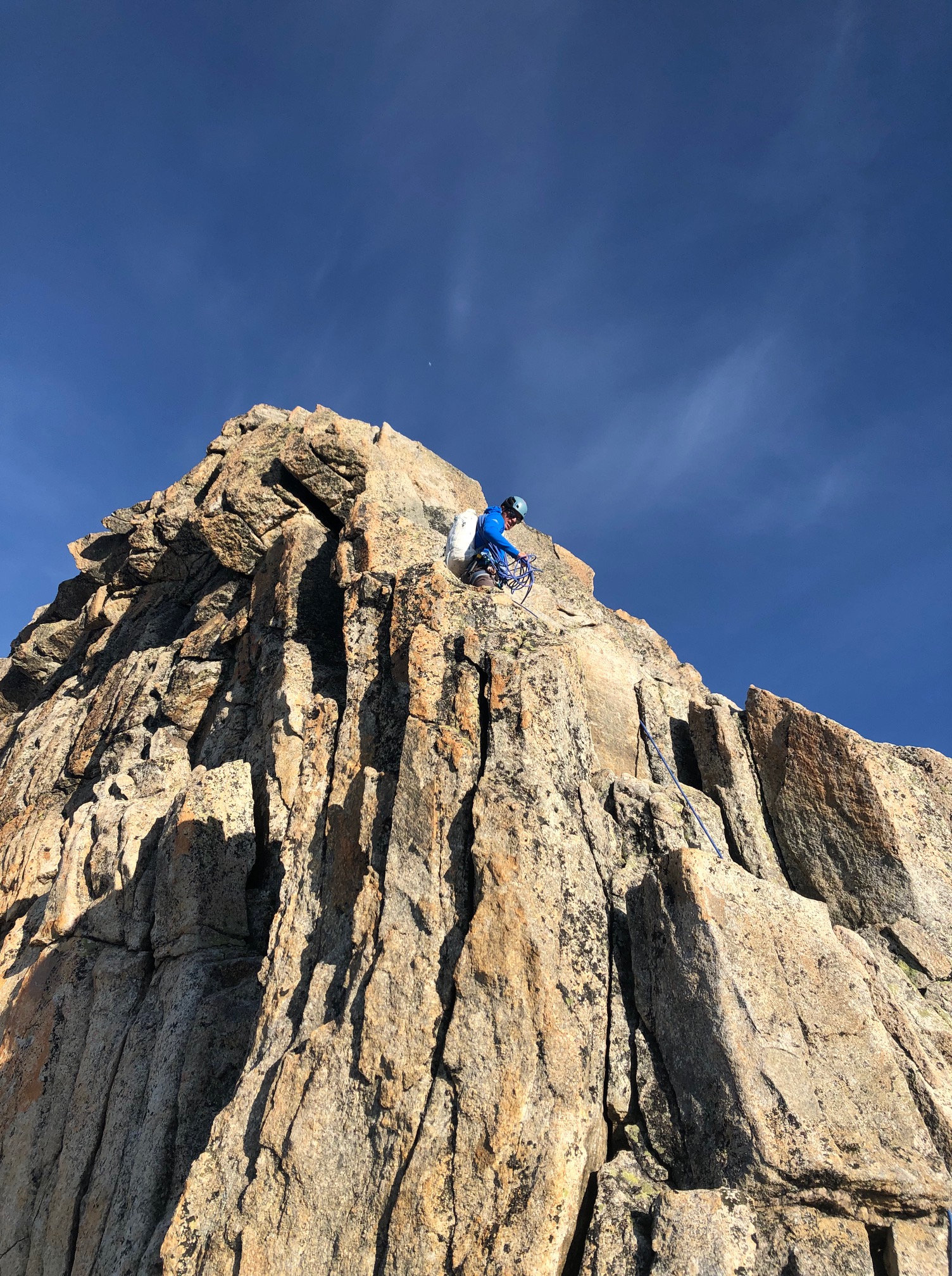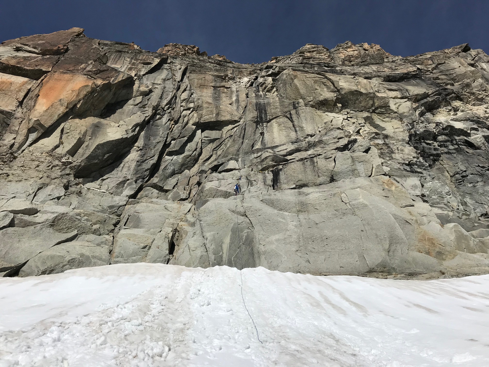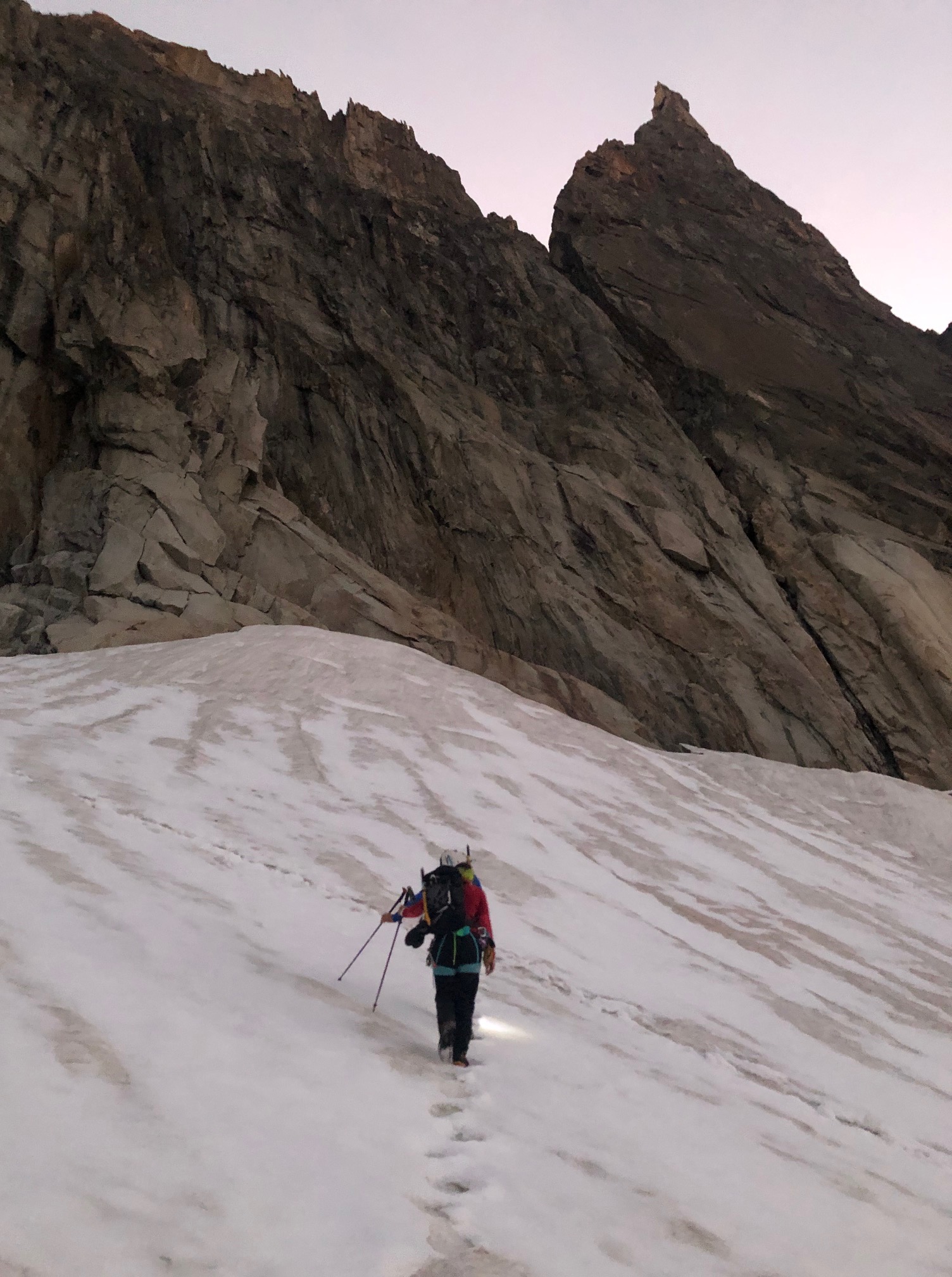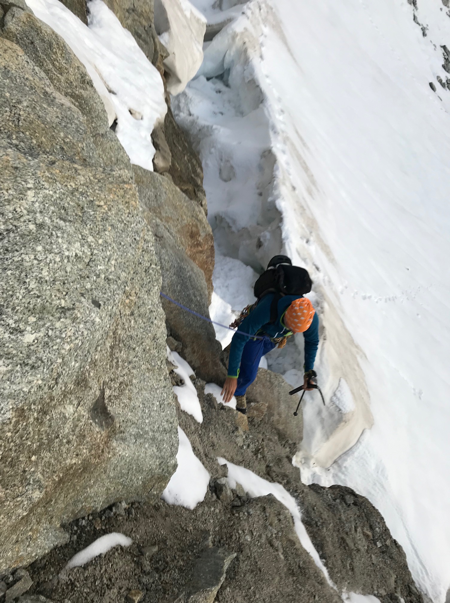 Petit-déj 5h30, nous quittons la cabane dans le noir. Manu prend son pas magique, je suis paisiblement en appréciant le moment. On arrive rapidement sur le glacier. Grâce à la neige tombée quelques jours avant, pas besoin de crampons, ça avance tout seul. La rimaye passe sans problème, quelques mètres dans de la chaille et on attaque le beau rocher ! Par rapport aux Salbit ça randonne, quel bonheur ! On est des gros fainéants et on apprécie vraiment de suivre la corde sans avoir à se poser la question de l’itinéraire ou de l’assurage, franchement des fois, ça fait du bien ! On ne met que 2h30 depuis la cabane jusqu’au sommet du pilier.
