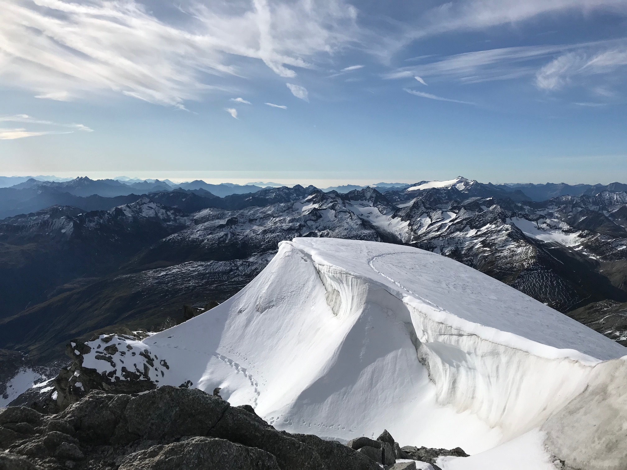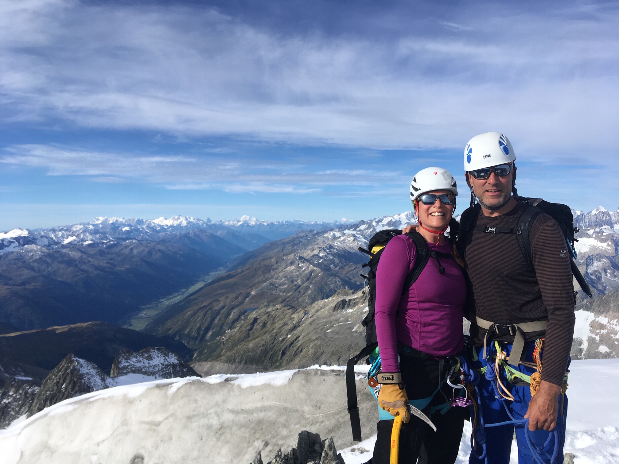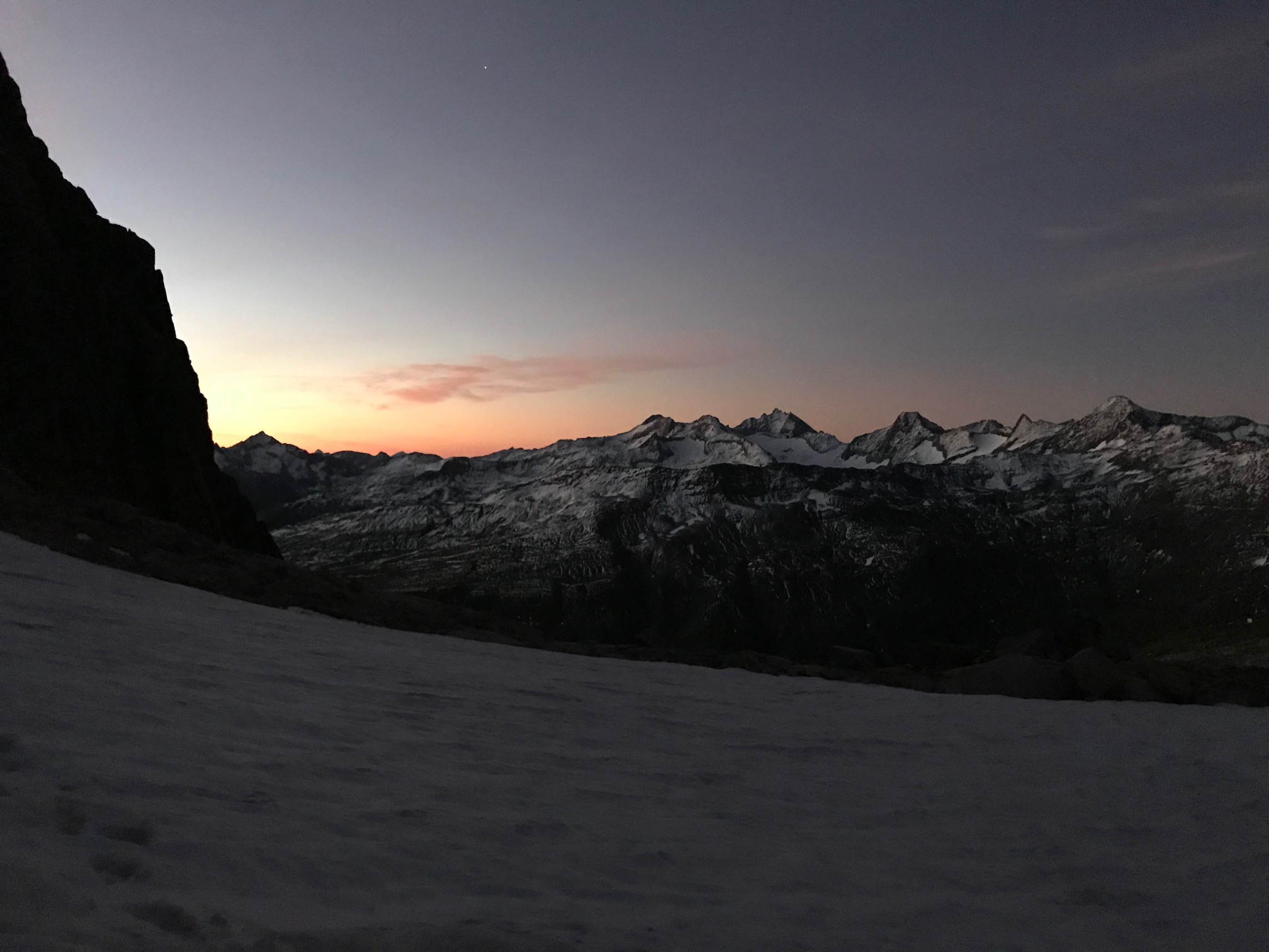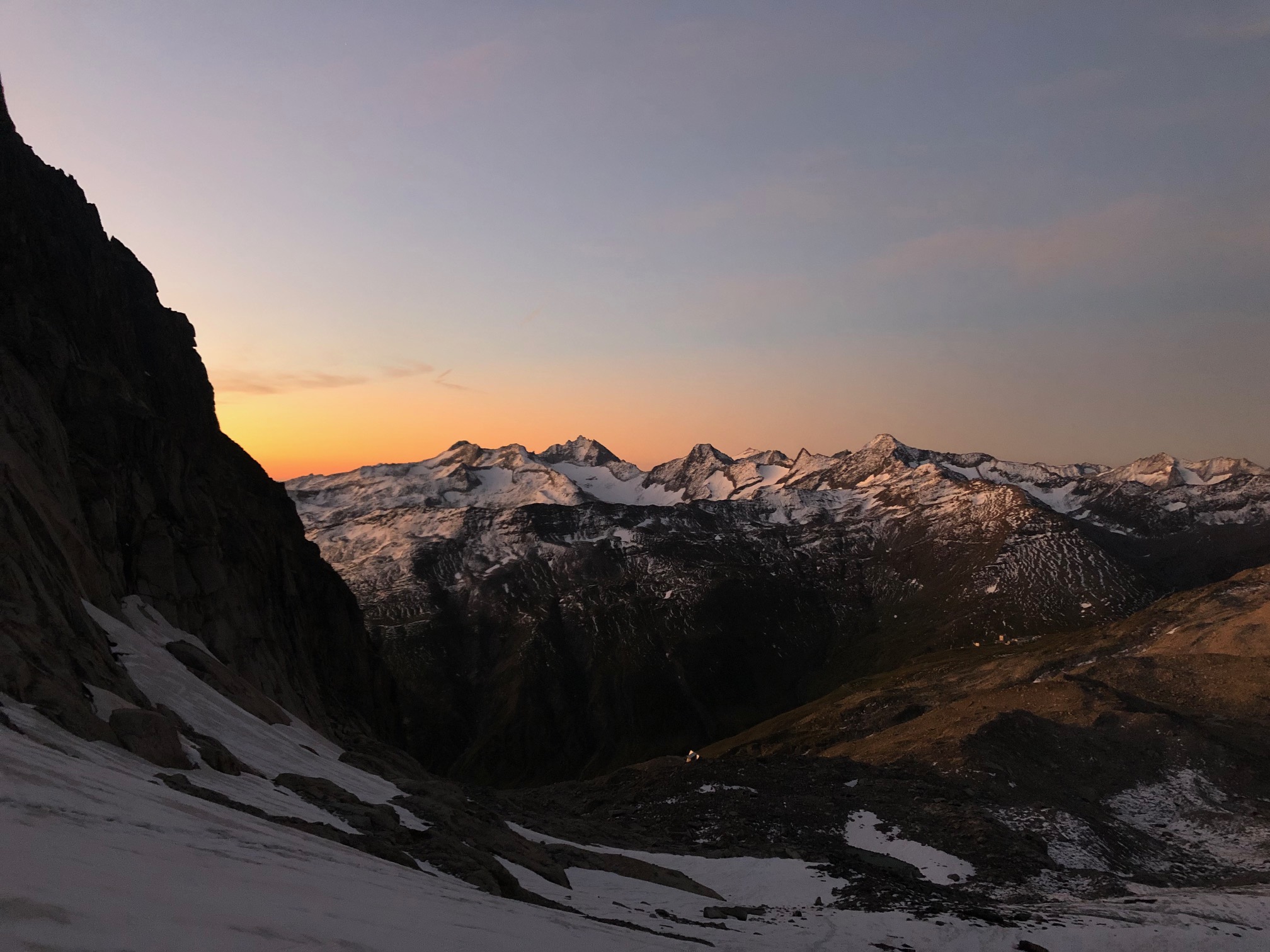 Petit-déj 5h30, nous quittons la cabane dans le noir. Manu prend son pas magique, je suis paisiblement en appréciant le moment. On arrive rapidement sur le glacier. Grâce à la neige tombée quelques jours avant, pas besoin de crampons, ça avance tout seul. La rimaye passe sans problème, quelques mètres dans de la chaille et on attaque le beau rocher ! Par rapport aux Salbit ça randonne, quel bonheur ! On est des gros fainéants et on apprécie vraiment de suivre la corde sans avoir à se poser la question de l’itinéraire ou de l’assurage, franchement des fois, ça fait du bien ! On ne met que 2h30 depuis la cabane jusqu’au sommet du pilier.