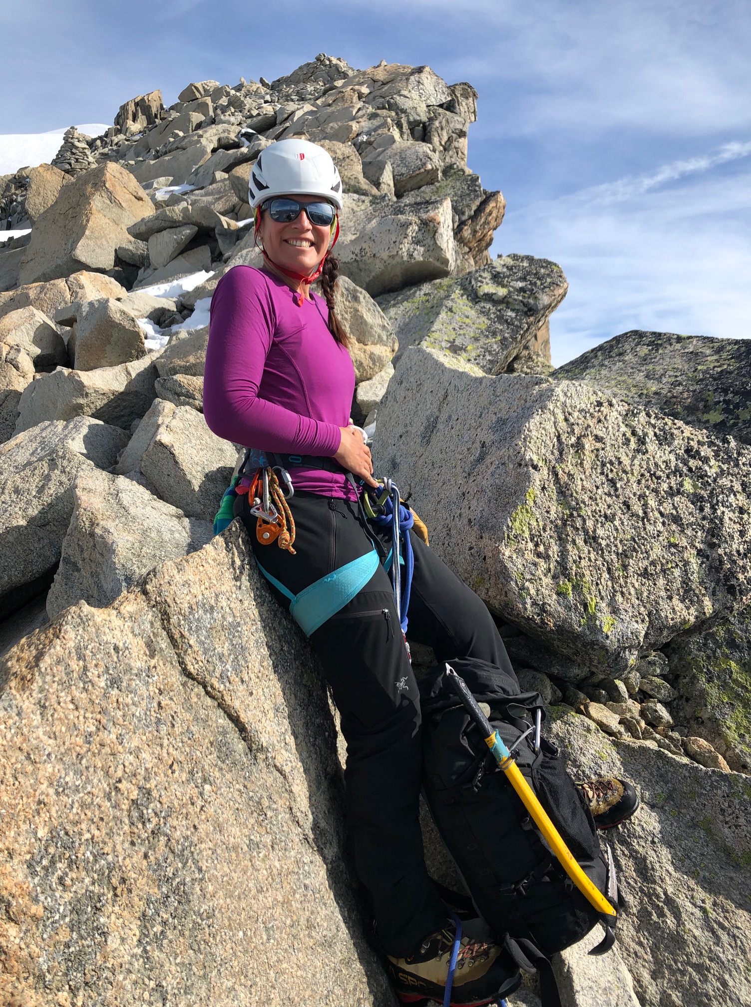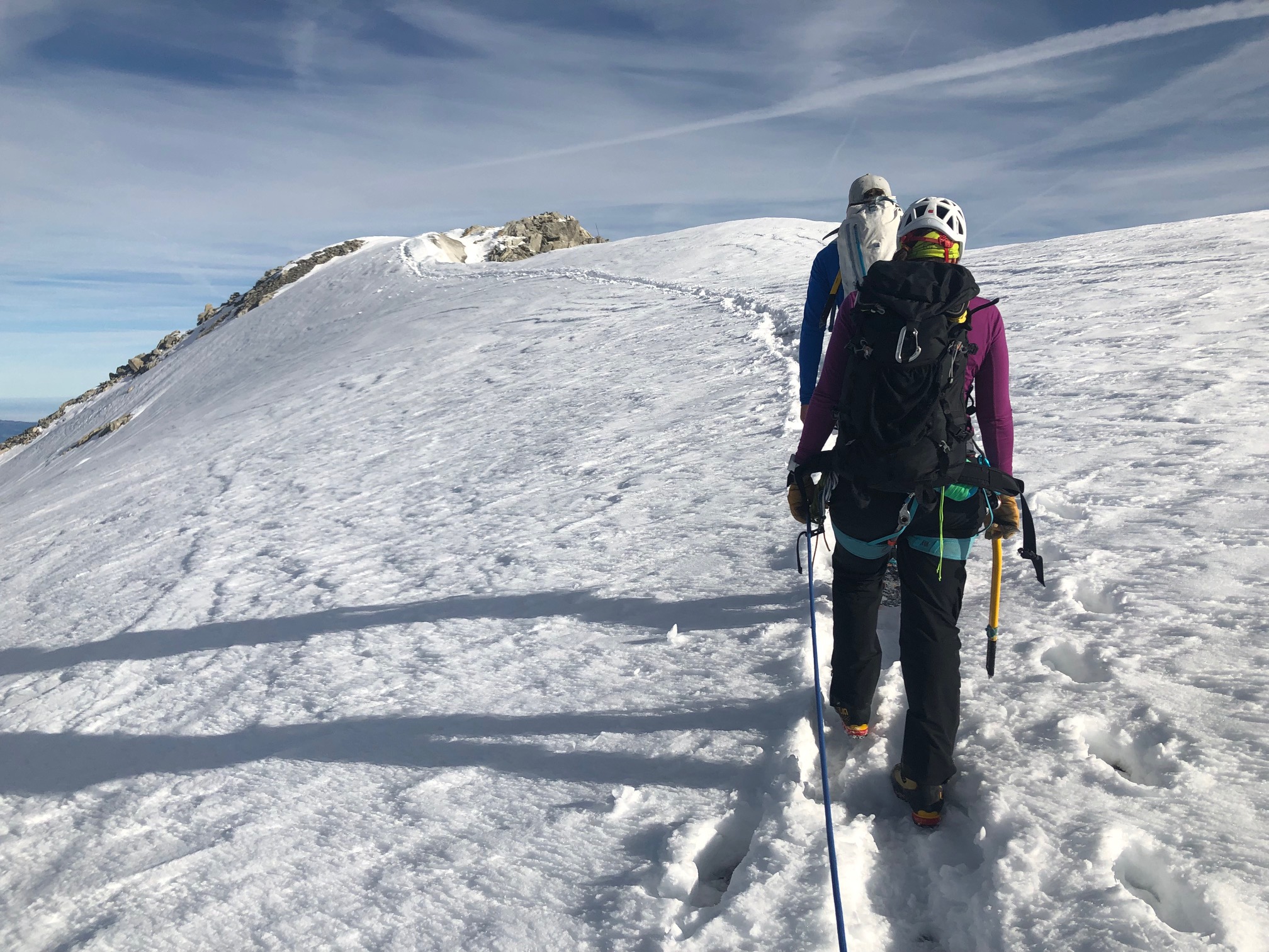 La suite, c’est une belle arête neigeuse, les crampons restent dans le sac. On est tous seuls au sommet, c’est super beau et je suis trop contente ! La descente se fait par la même arête neigeuse, on dépasse le pilier par lequel on est arrivé jusqu’à la ligne de rappels.