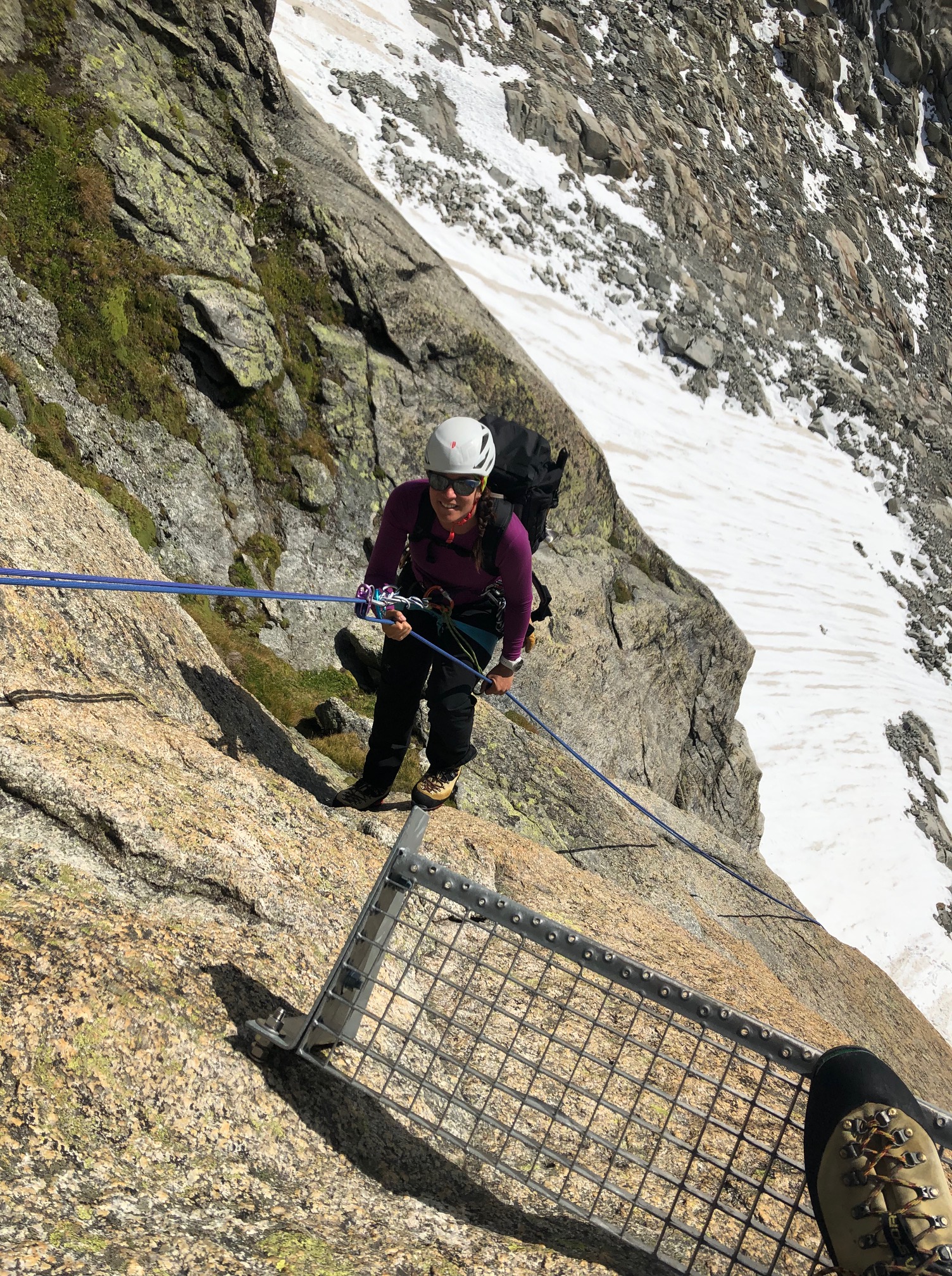 La ligne est super bien équipée, je suis obligée de l’avouer, même si je déteste toujours autant cet exercice. Au milieu il y a deux rappels plein gaz avec des plateforme en métal, beurk, fuyons ! Je suis bien contente quand on arrive sur la neige et qu’on se rutsche jusqu’en bas !