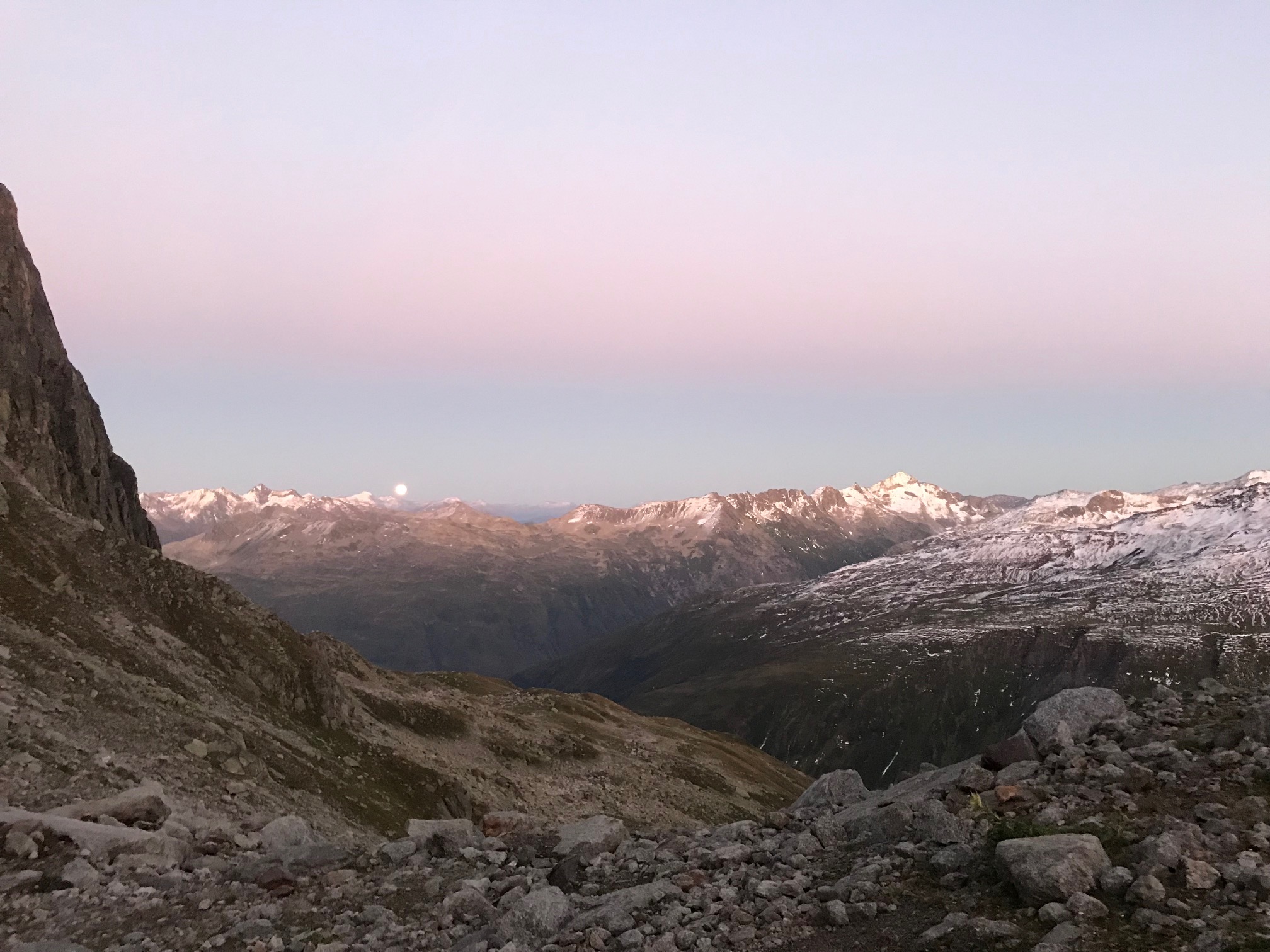 A la cabane Sidelen, on se fait accueillir par une gardienne adorable et son aide-gardien imbuvable. On admire un crépuscule de toute beauté et le levé de lune, avant d’aller se coucher.
