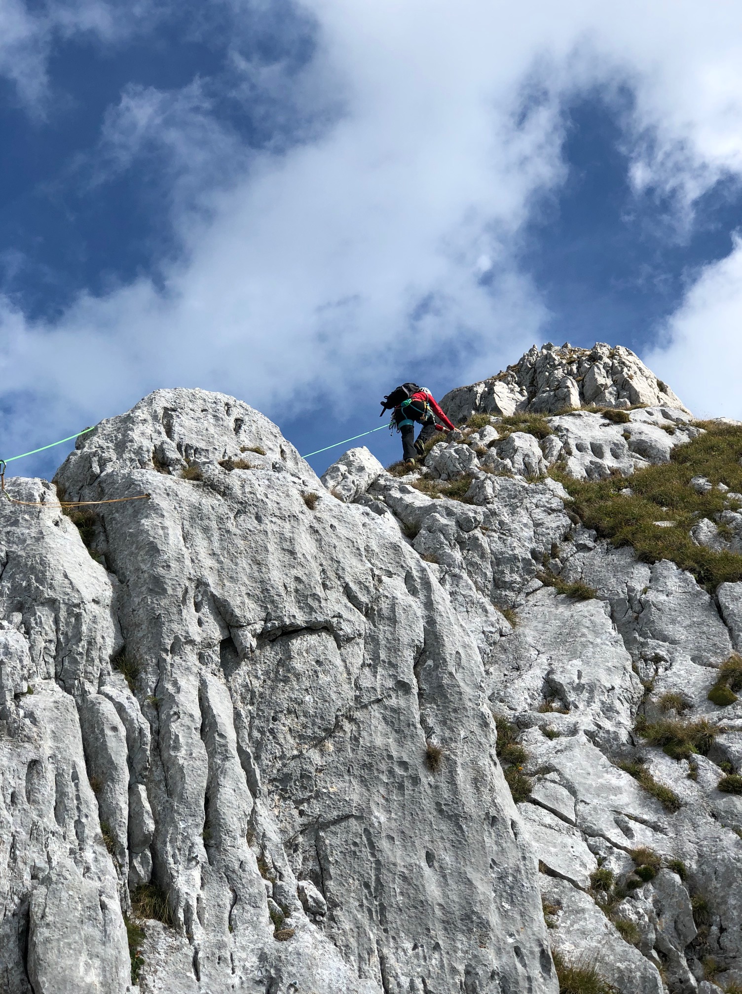 Le lendemain, départ pour notre course du jour au Pfriendler. L’approche fait environ 300 m de dénivelé, d’abord sur un chemin puis à travers un pierrier (pour l’instant on s’en fout, mais ça aura son importance pour la suite) et on attaque la voie Via Fritz. On décide de grimper en réversible et Claudia s’élance dans la première longueur. Elle évolue avec classe et élégance dans cette première 5b. Quand c’est mon tour d’y aller je me dis qu’on va passer une bien belle journée ! Le rocher est magnifique, le 5b me paraît être un 5b (rappelons qu’une semaine auparavant j’étais aux Salbit, là où les 3c sont des 6a, j’exagère à peine) j’ai un monstre plaisir à être ici.