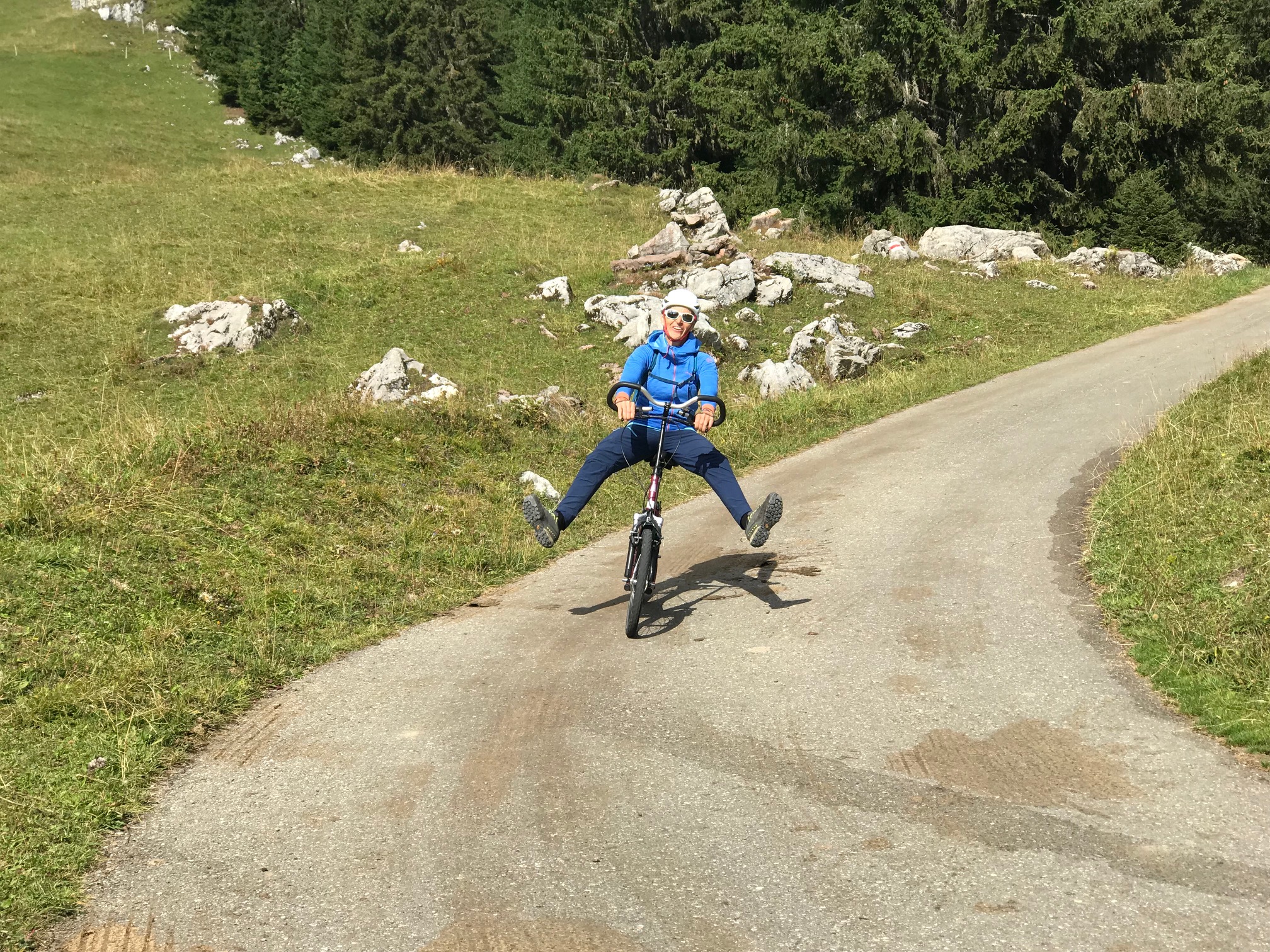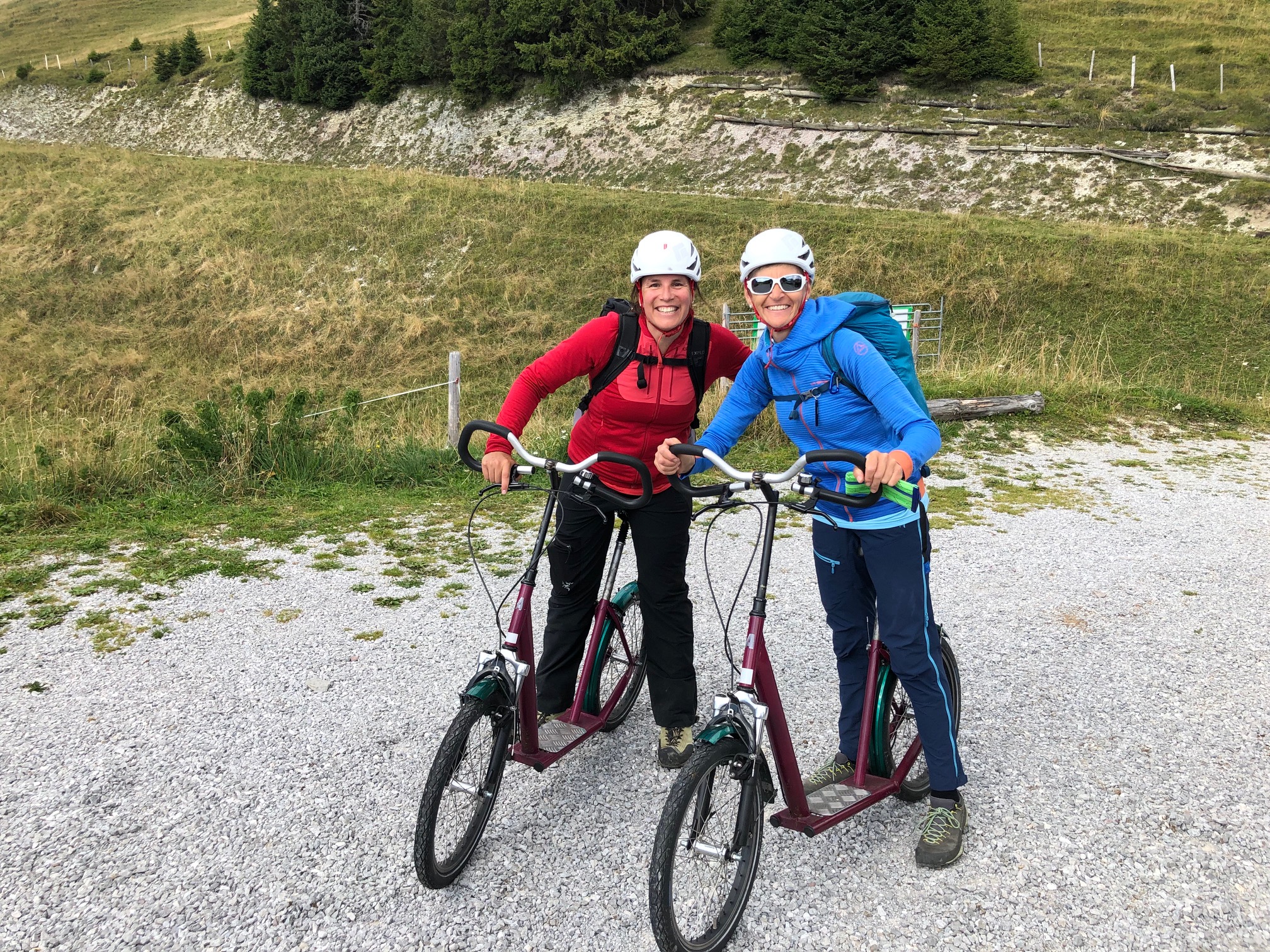 La descente en trott est super cool, vu notre grand âge on a choisi des trottinettes sur lesquelles on peut s’asseoir, on a l’impression d’être sur un scooter, sauf que ça fait pas de bruit et que ça ne pue pas ! 10km de descente avec des pointe à plus de 50 km/h quand même, c’est excellent.