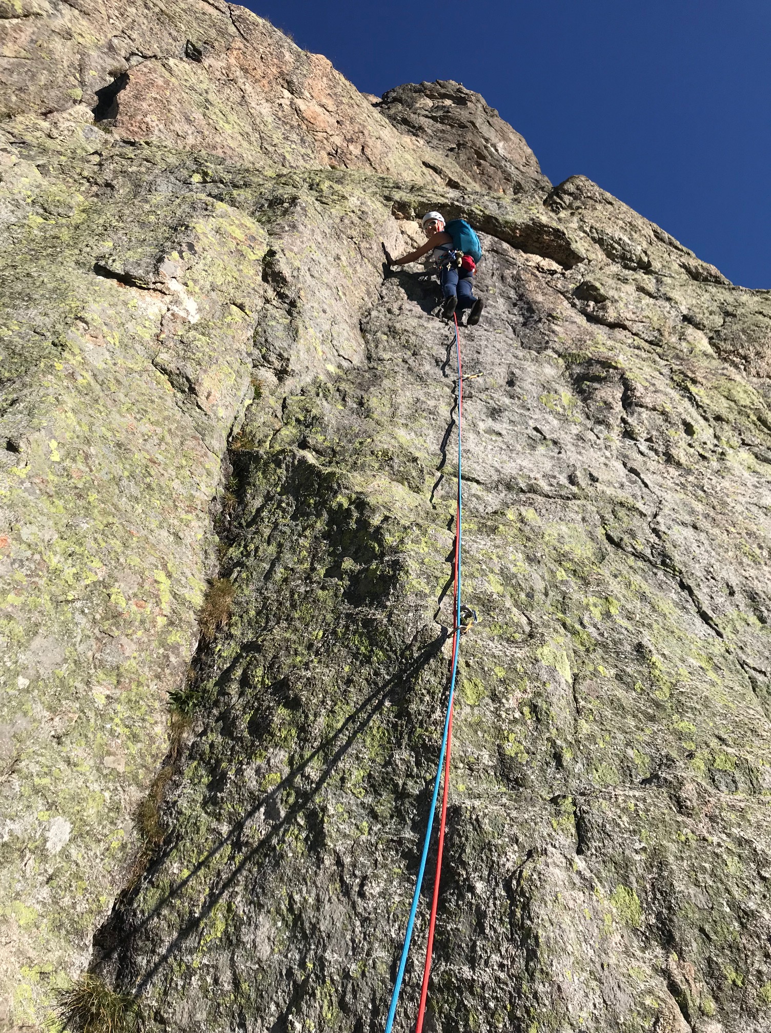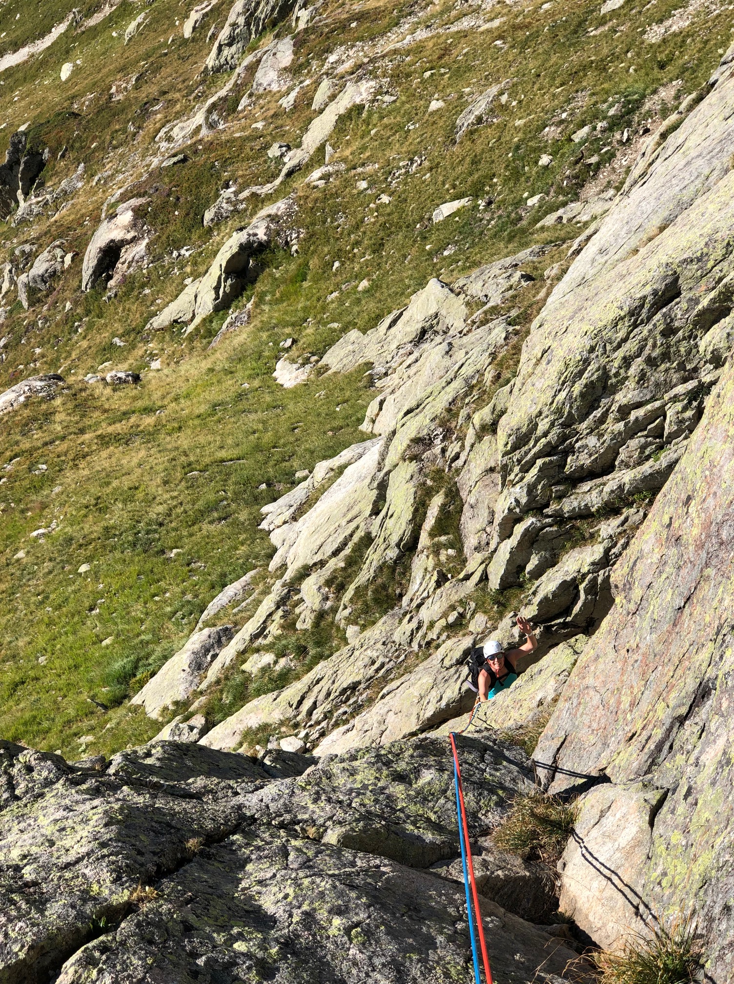 Approche: 10 minutes. Voie: 1h30 en trainant un maximum, dont 15 bonnes minutes a décoincer un friend mal posé par mes colles (ah oui, pour pimenter un peu l’affaire on a mis au maximum nos propres protections) et retour au sommet. Ensuite on descend à pieds vers le chalet d’alpage d’Oberstockealp. Nous conseillons vivement la visite, la terrasse est super chouette et la nourriture abondante et roborative. De plus, on y apprend que la descente est possible en trottinette depuis Vorderstockealp et on s’y rend de ce pas par un chouette chemin de traverse, plein de framboises et de myrtilles.