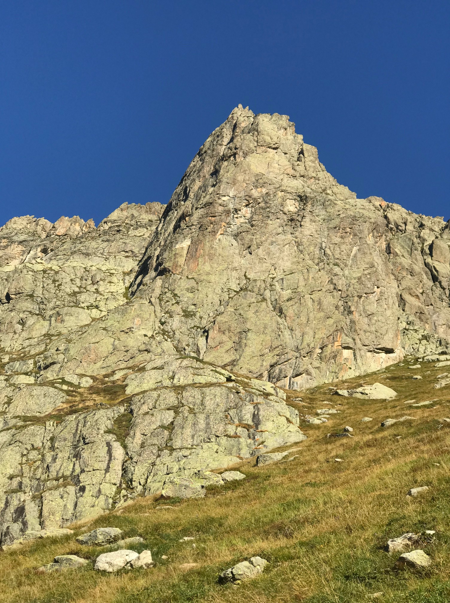 Je commence donc une descente qui sera mon petit chemin de croix de l’été. Même avec deux bâtons , j’en chie vraiment dans ce pierrier. On mettra 1h30 pour parcourir ces 300m. Plusieurs personnes très choues me proposent leur aide, mais j’ai assez de peine toute seule comme dirait l’autre ! Les larmes coulent toutes seules sur mes joues, ça fait vraiment mal une entorse !